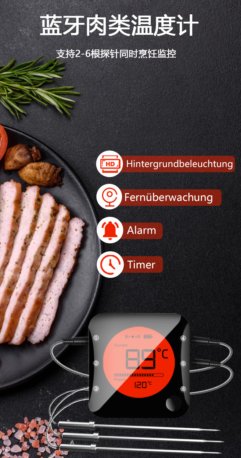 支持 6 个探头通道:配备 2-6 个食品级不锈钢探头,可同时监测不同的食物(无线温度计最多可添加 6 个探头)。宽温度范围:33℉ 至 572℉。高精度:±1℃/±1.8℉。超过 43 英寸的耐热探头线,易于使用。让烹饪既方便又准确,帮助您每次都能获得始终如一的美味佳肴。