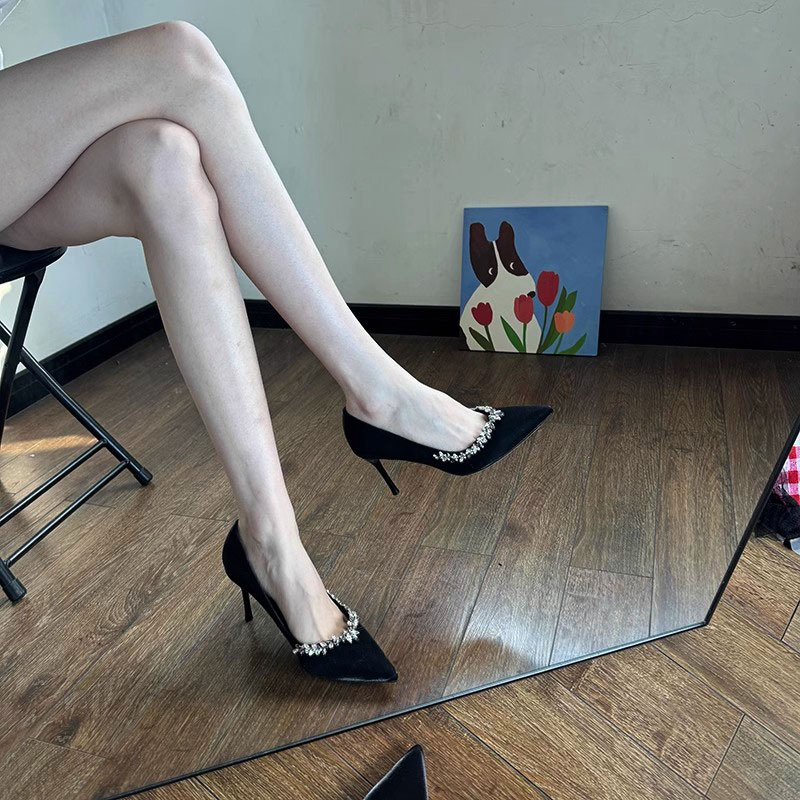2024 년 가을 새로운 라인스톤 프렌치 얕은 입 뾰족한 스틸레토 힐 신발 여성용 새틴 우아한 들러리 신발스토어 가기