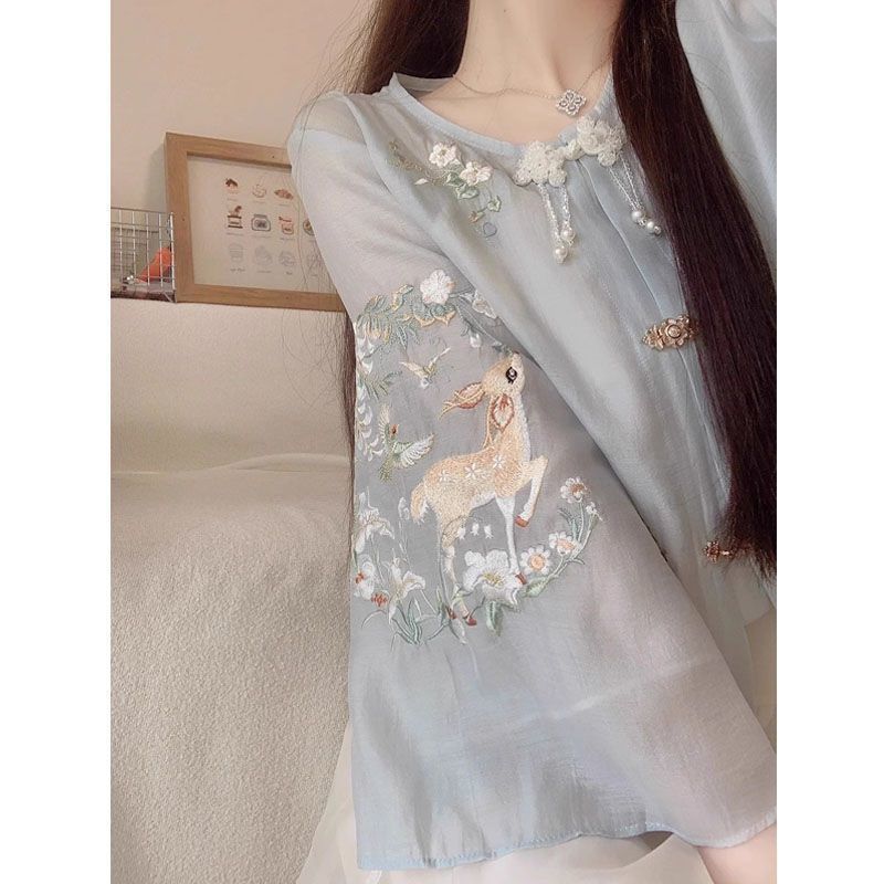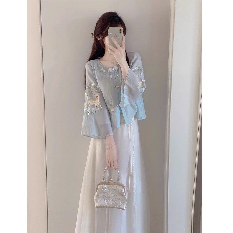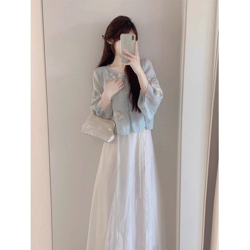 새로운 중국 스타일 국가 스타일 슬림 치마 투피스 세트로 2024 새로운 개선 된 한후 탑 세트를 착용하십시오.스토어 가기