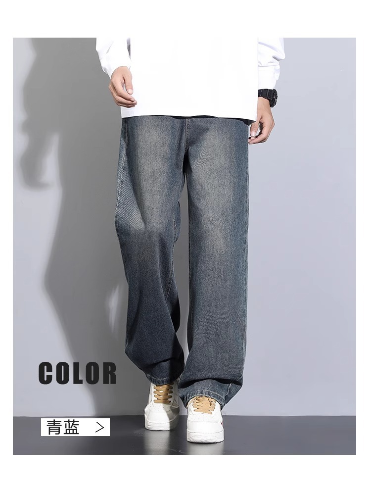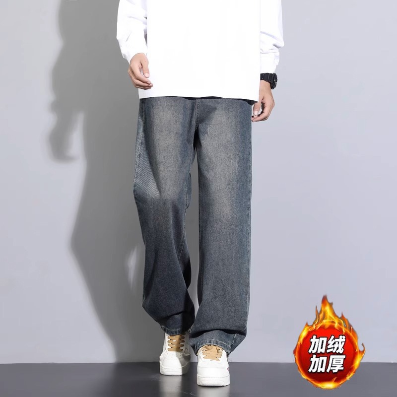 남성용 기모 데님 팬츠 가을 겨울 신상 남성용 긴바지 아메리칸 하이 스트리트 스타일 남성용 스트레이트 팬츠 루즈핏 캐주얼 바지스토어 가기