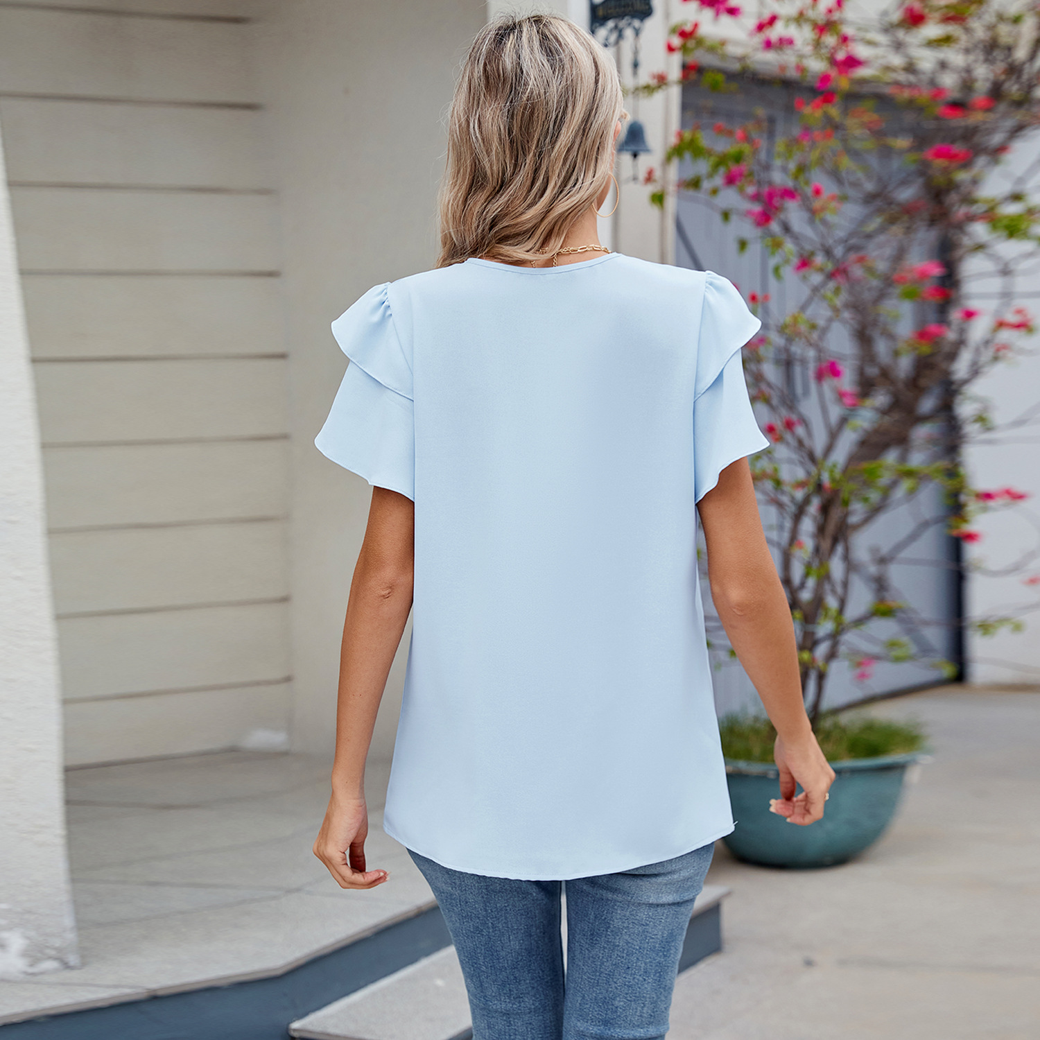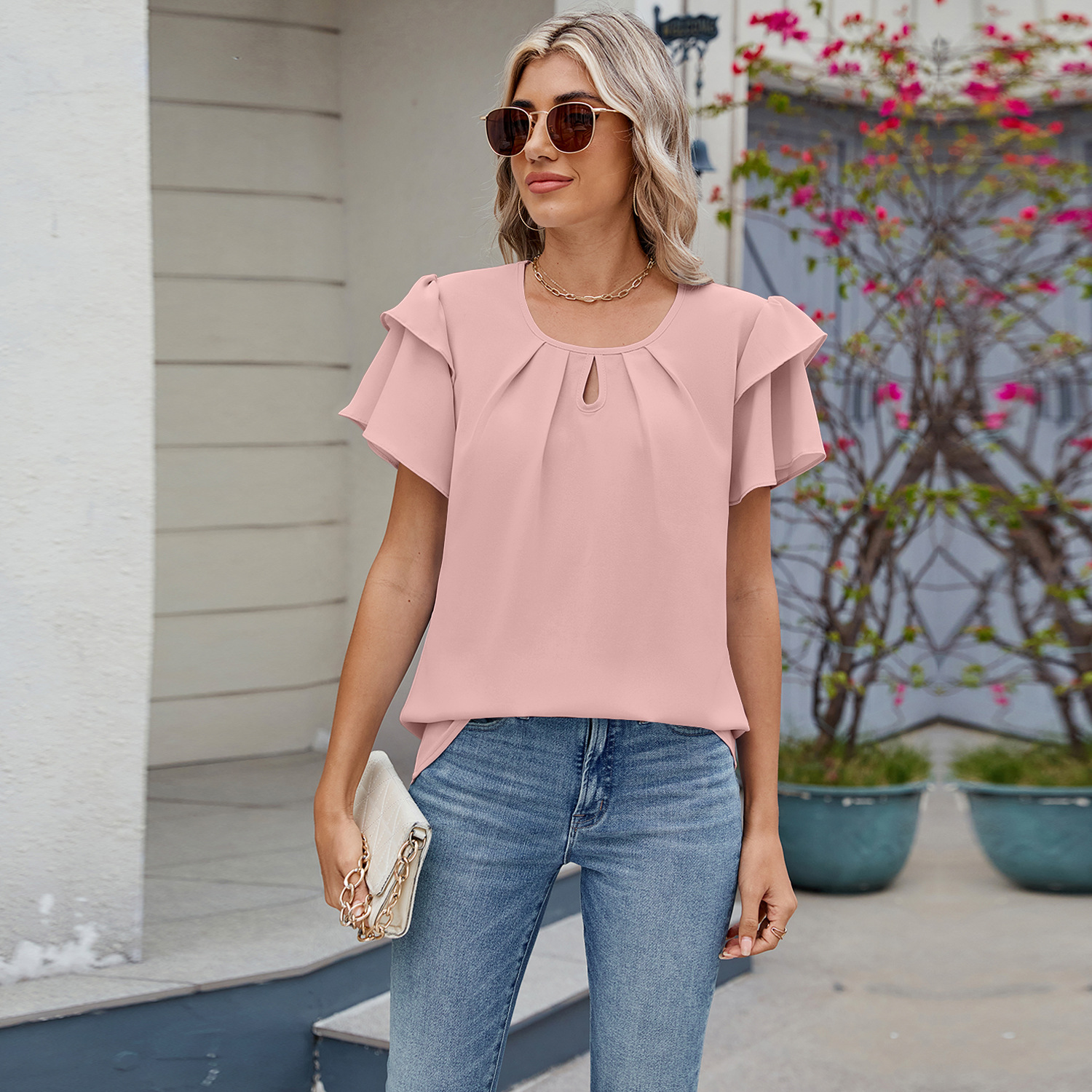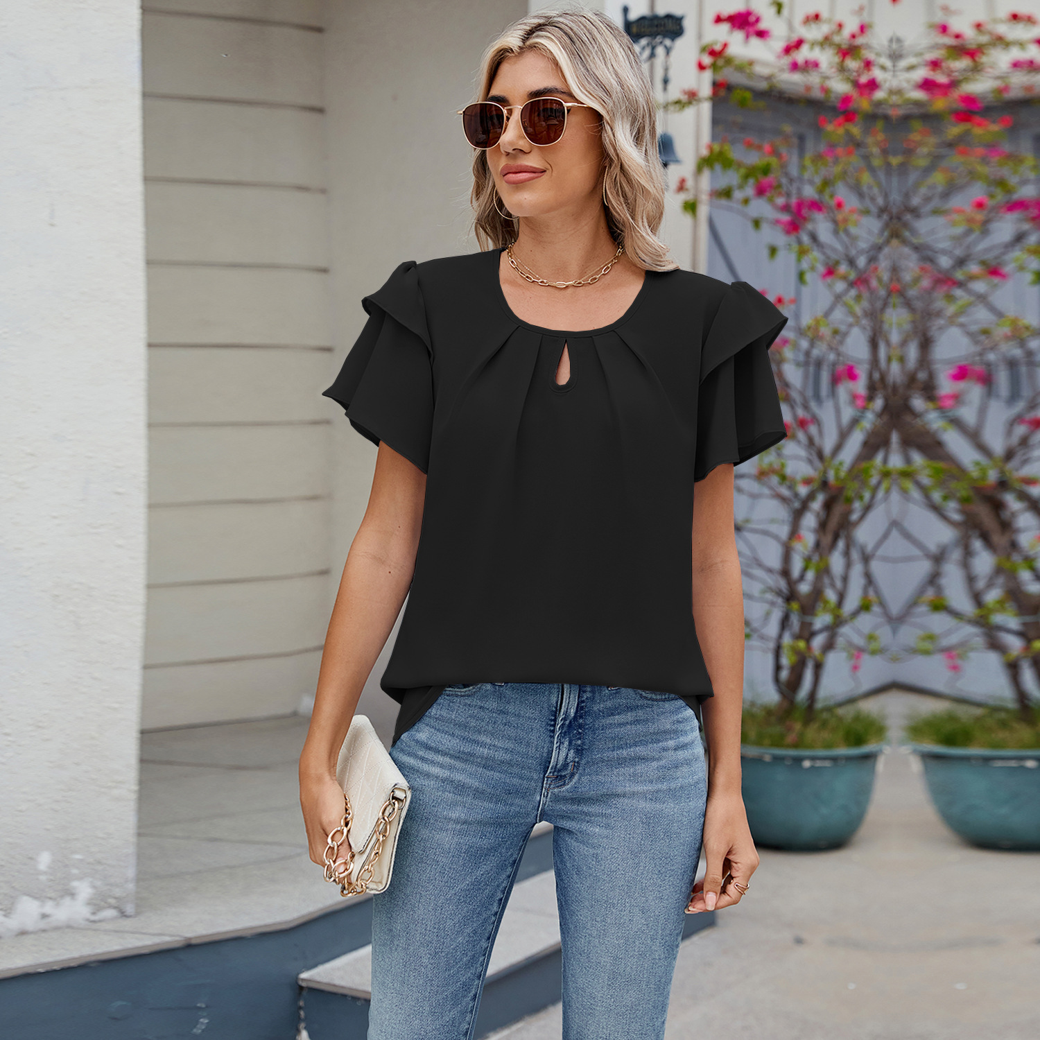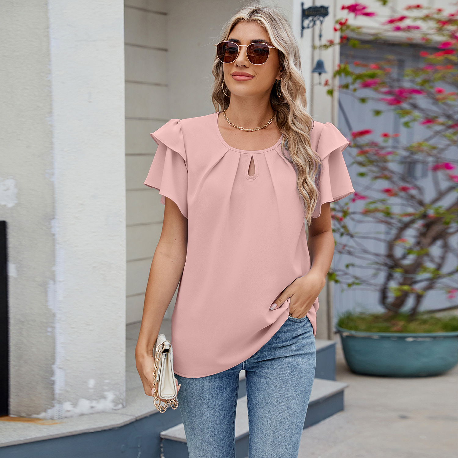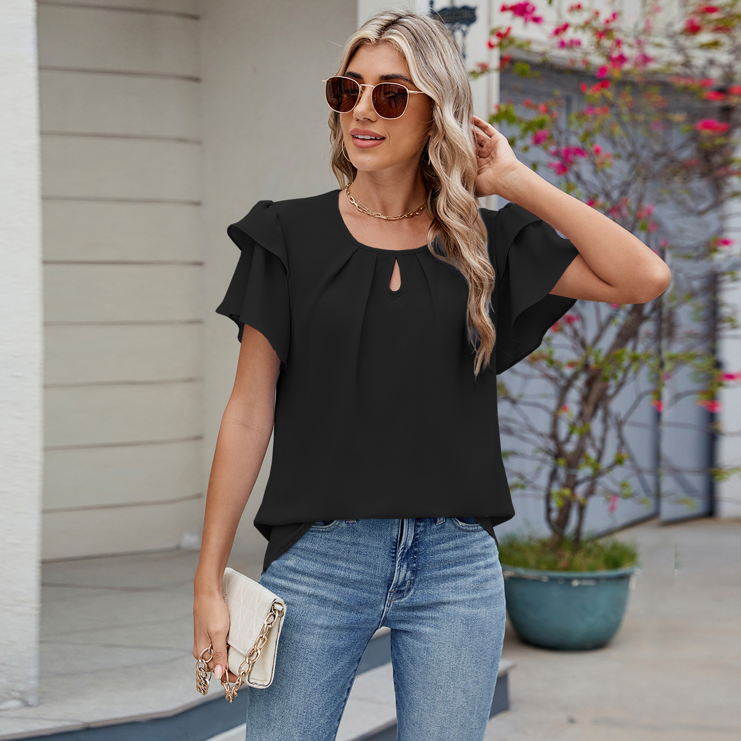 유럽과 미국의 국경 간 여성 2025 아마존 봄과 여름 새로운 라운드 넥 플라잉 슬리브 느슨한 쉬폰 셔츠 최고의 여성 재고스토어 가기