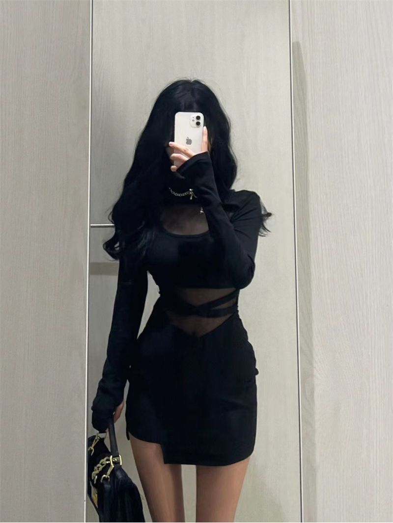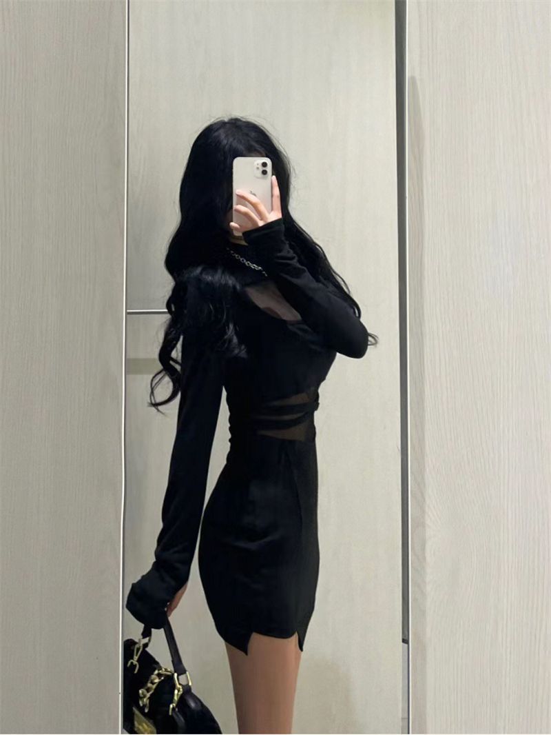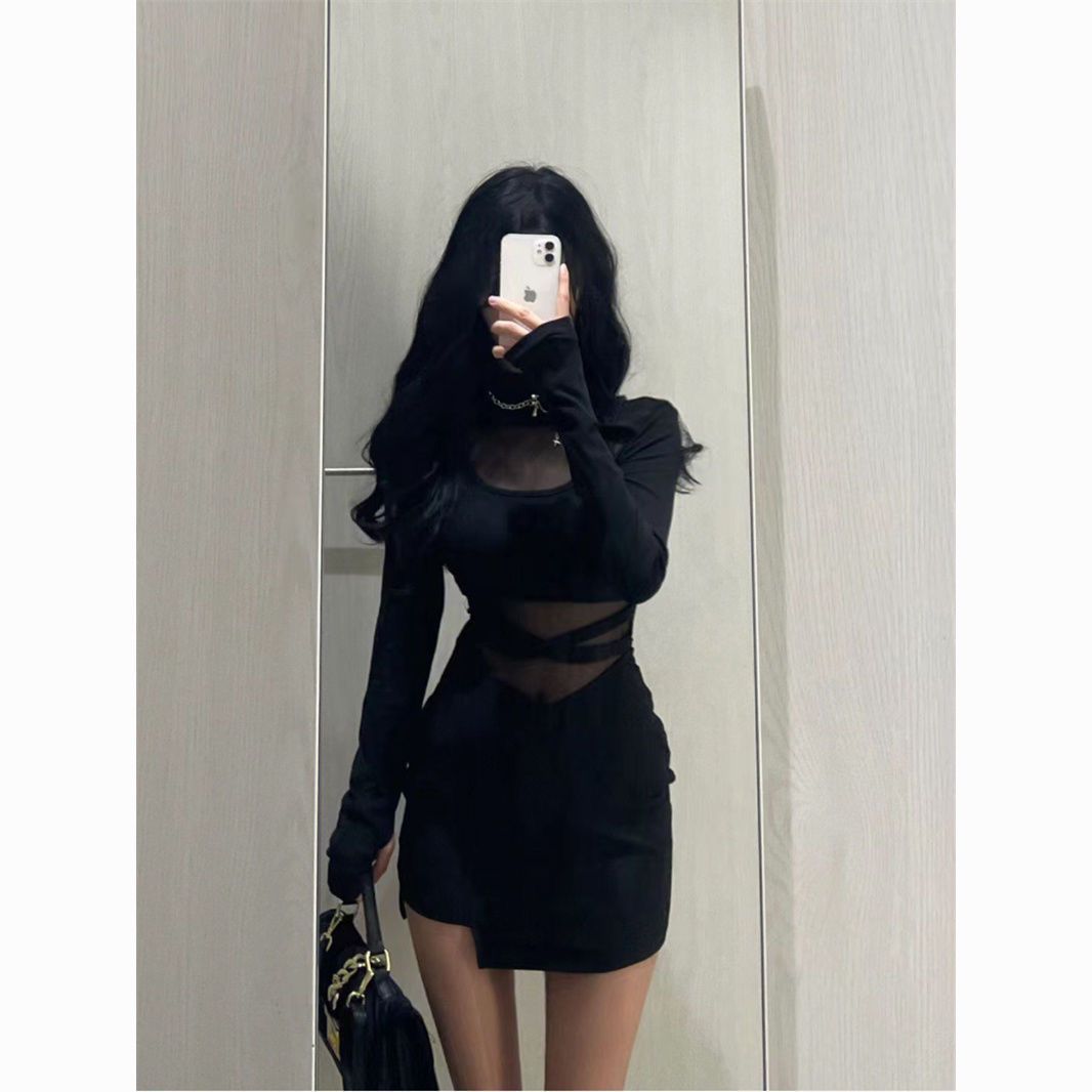 섹시한 스파이스 소녀 마이크로 관점 블랙 원피스 여성의 봄과 가을 새로운 메쉬 바느질 순수한 성숙한 엉덩이 원피스 꽉스토어 가기