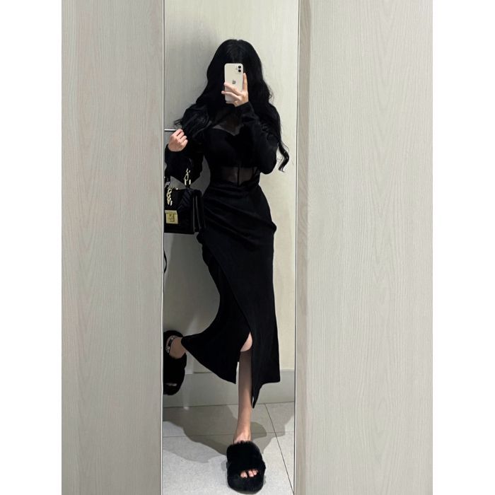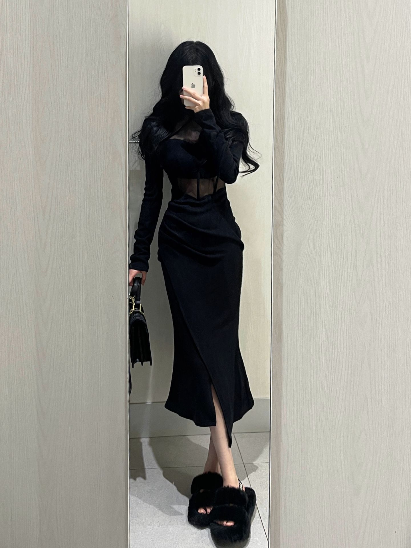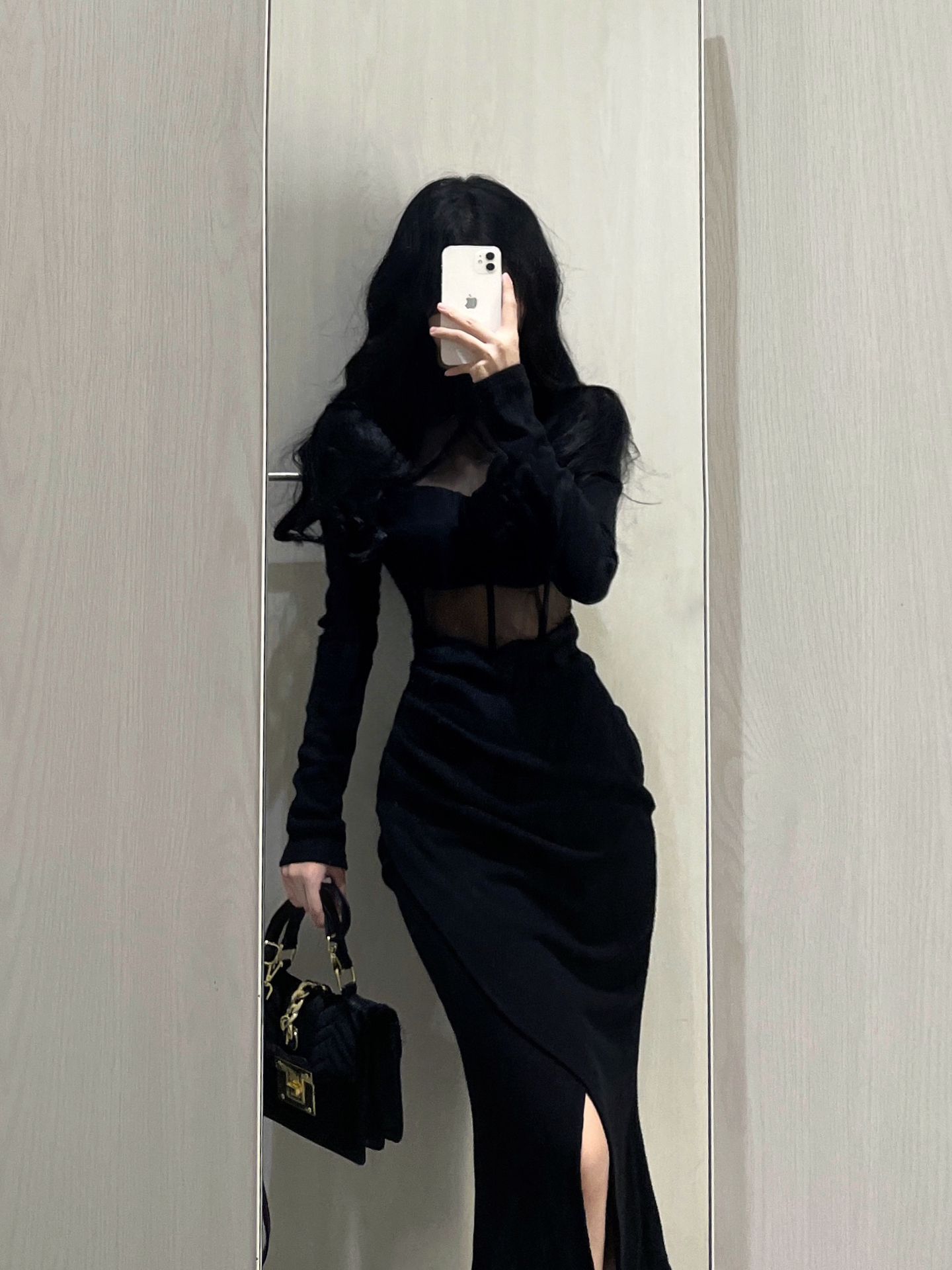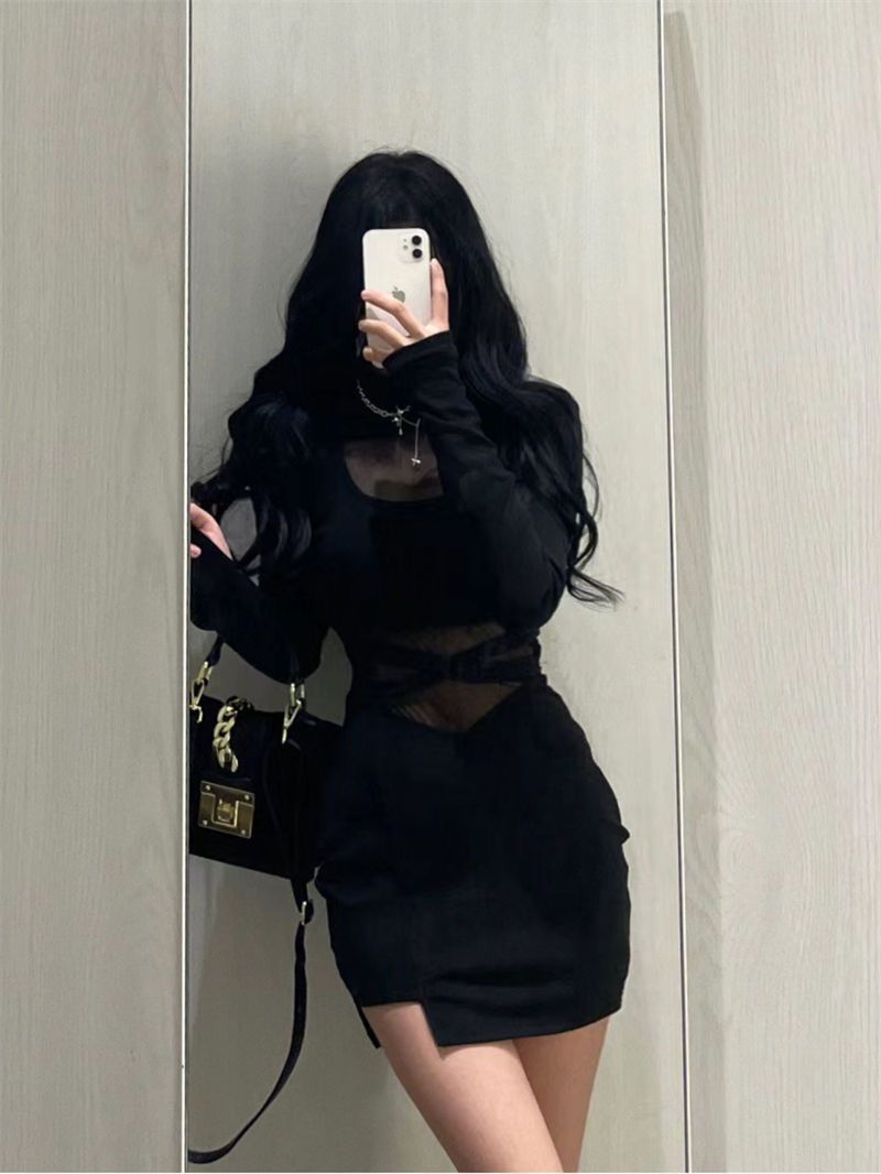 섹시한 스파이스 소녀 마이크로 관점 블랙 원피스 여성의 봄과 가을 새로운 메쉬 바느질 순수한 성숙한 엉덩이 원피스 꽉스토어 가기