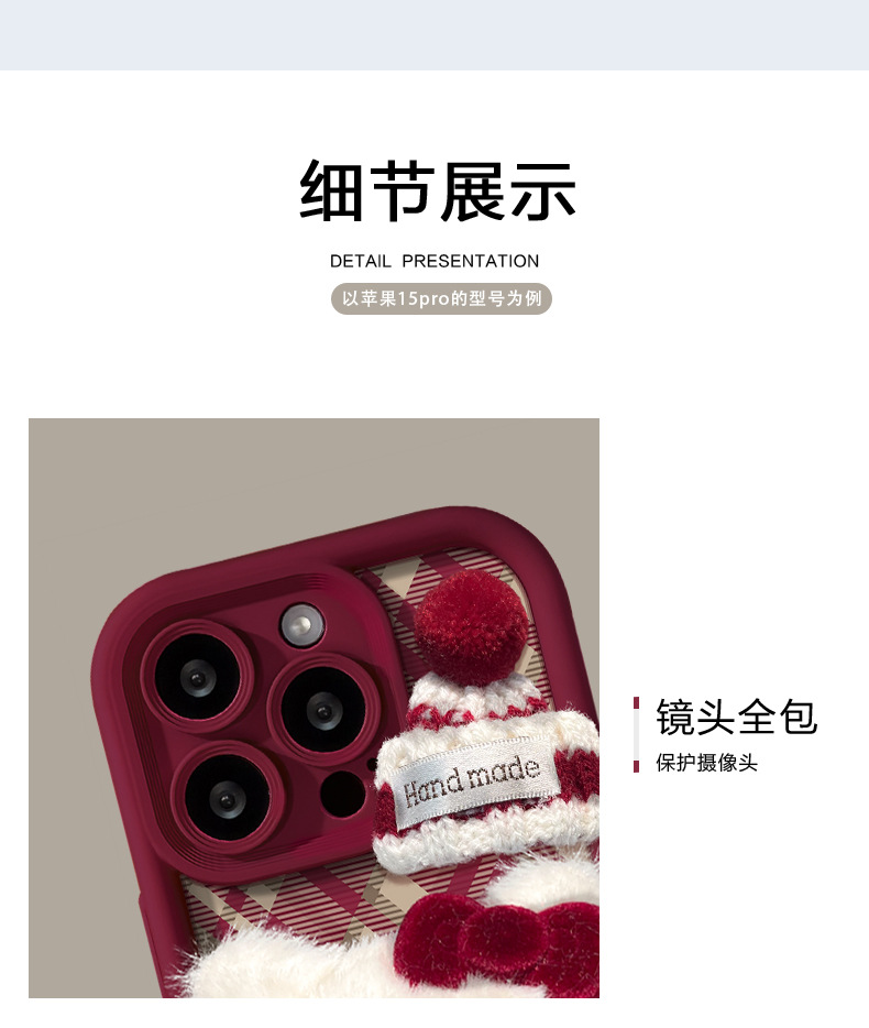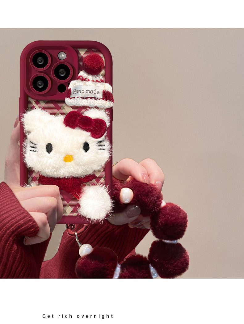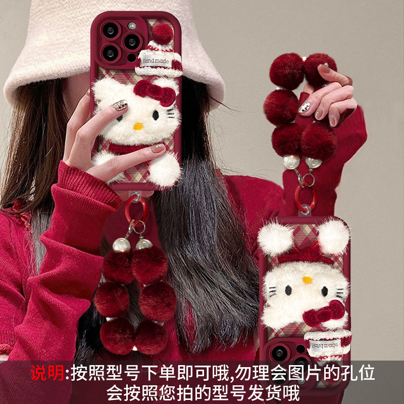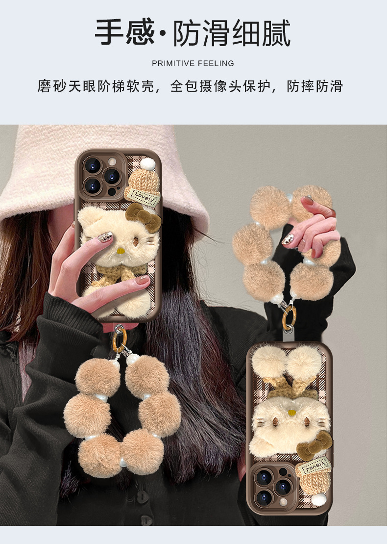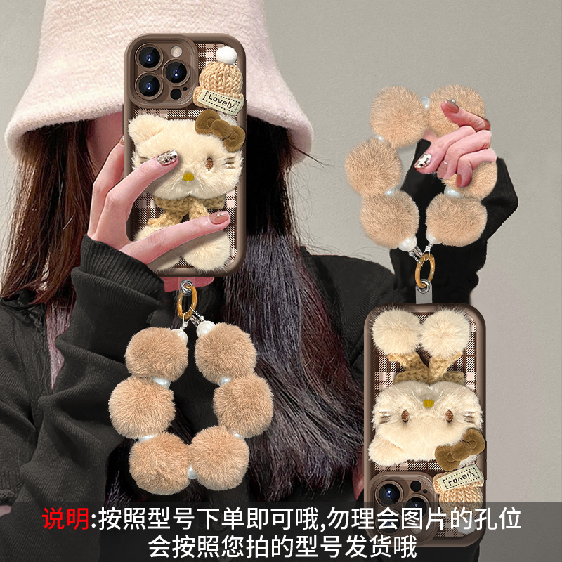 애플 16 양가죽 휴대폰 케이스에 적합한 플러시 고양이 인형 팔찌, 가을 겨울 15pro 무광 실리콘 13/17