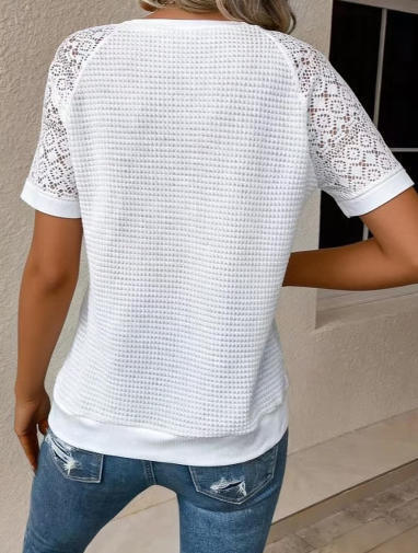 국경 간 대외 무역 제조 업체 유럽과 미국 2025 새로운 단색 레이스 긴팔 중공 라운드 넥 캐주얼 여성 티셔츠 탑