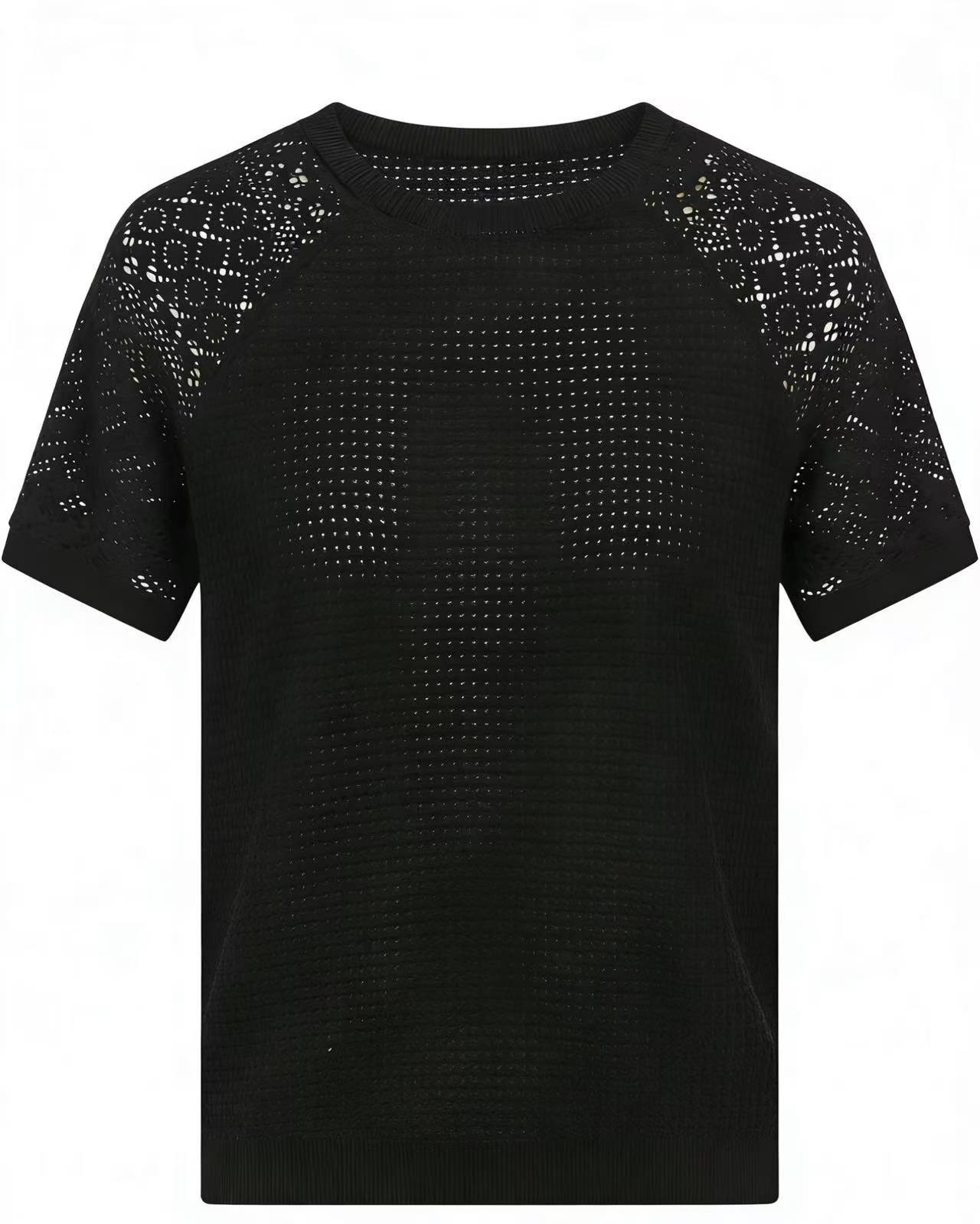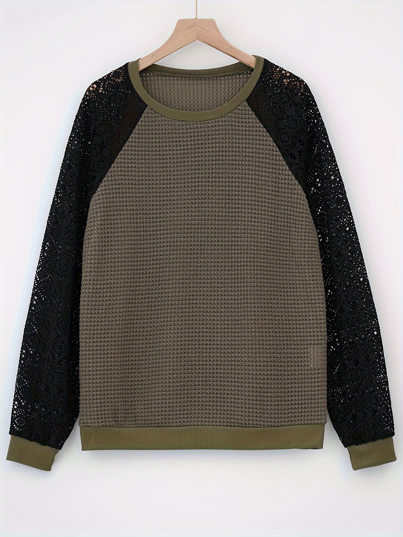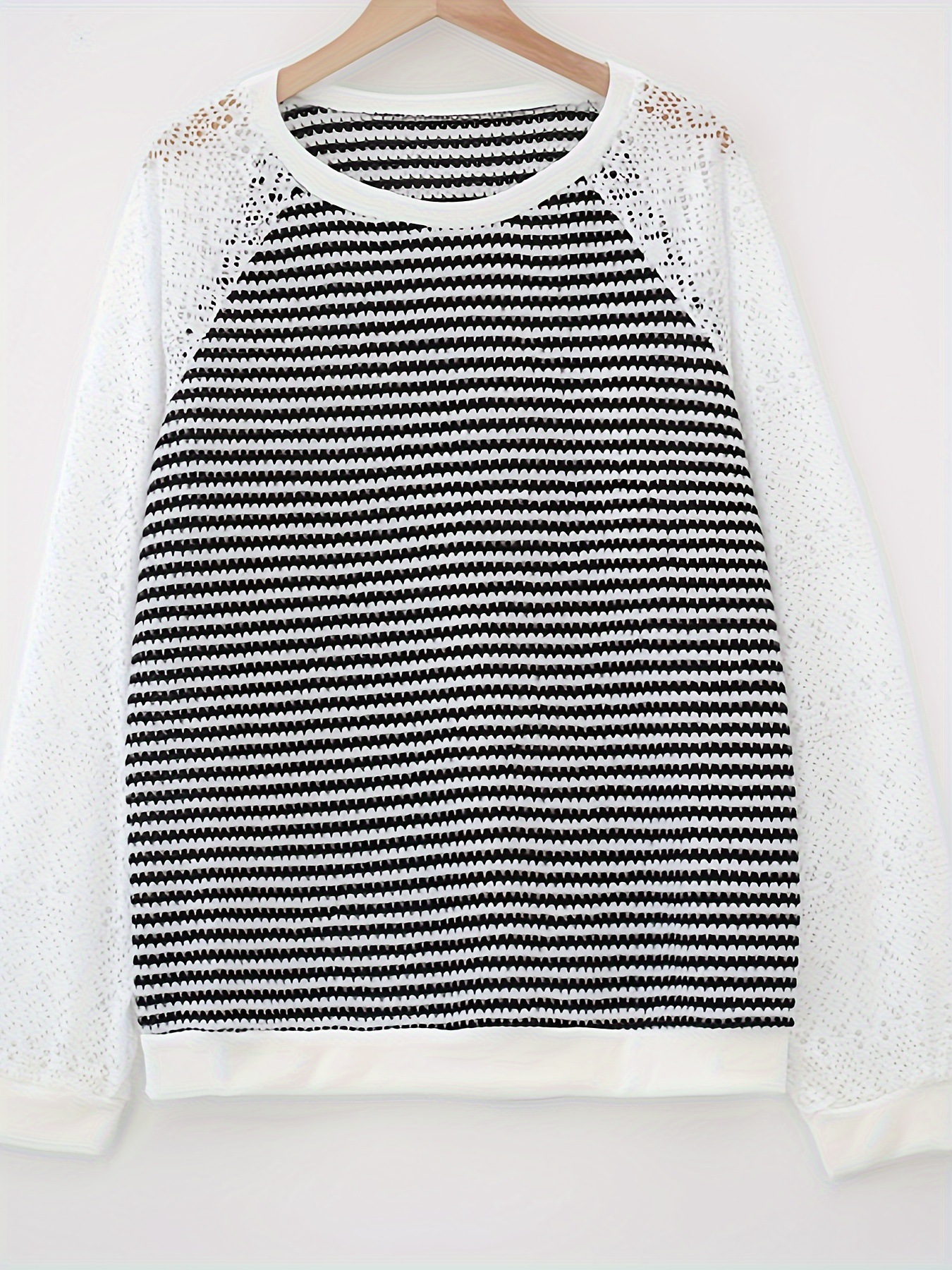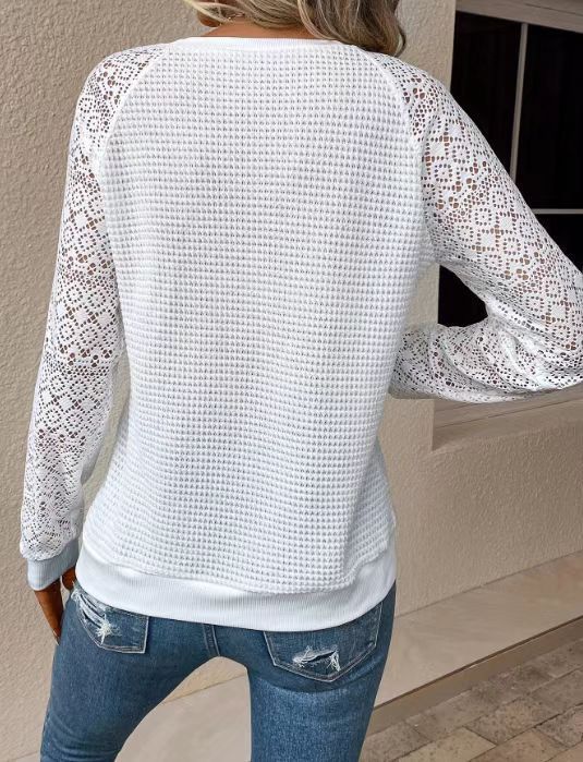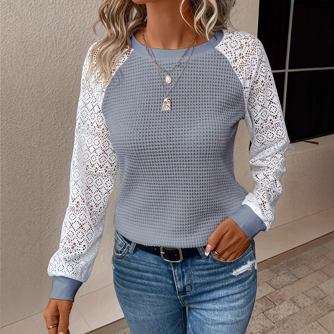 국경 간 대외 무역 제조 업체 유럽과 미국 2025 새로운 단색 레이스 긴팔 중공 라운드 넥 캐주얼 여성 티셔츠 탑스토어 가기