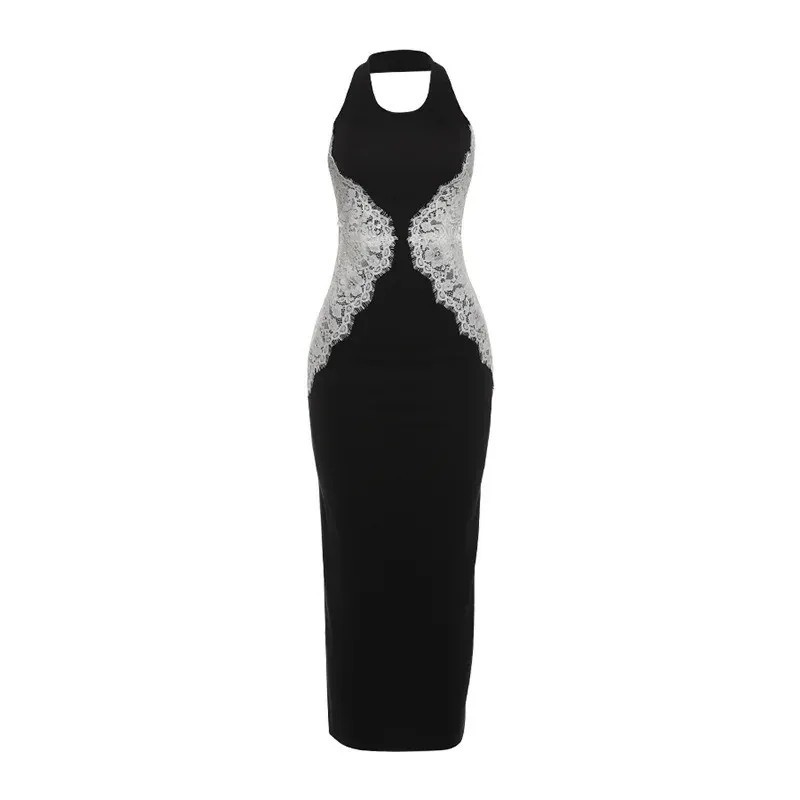 2025 신상품 해외 여성복 섹시한 홀터넥 스플라이싱 롱 드레스 백리스 명사 스타일 슬림핏 레이스 유럽 및 미국 스타일 원피스스토어 가기