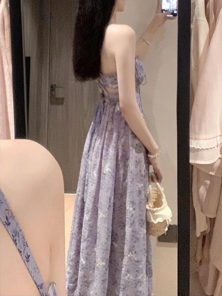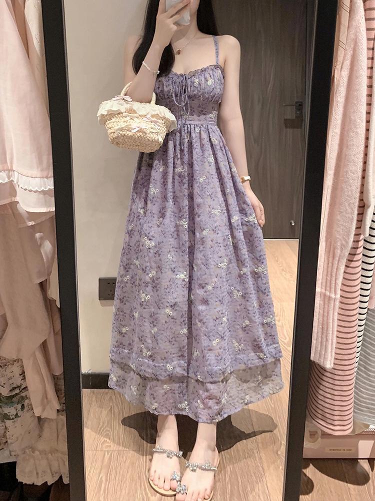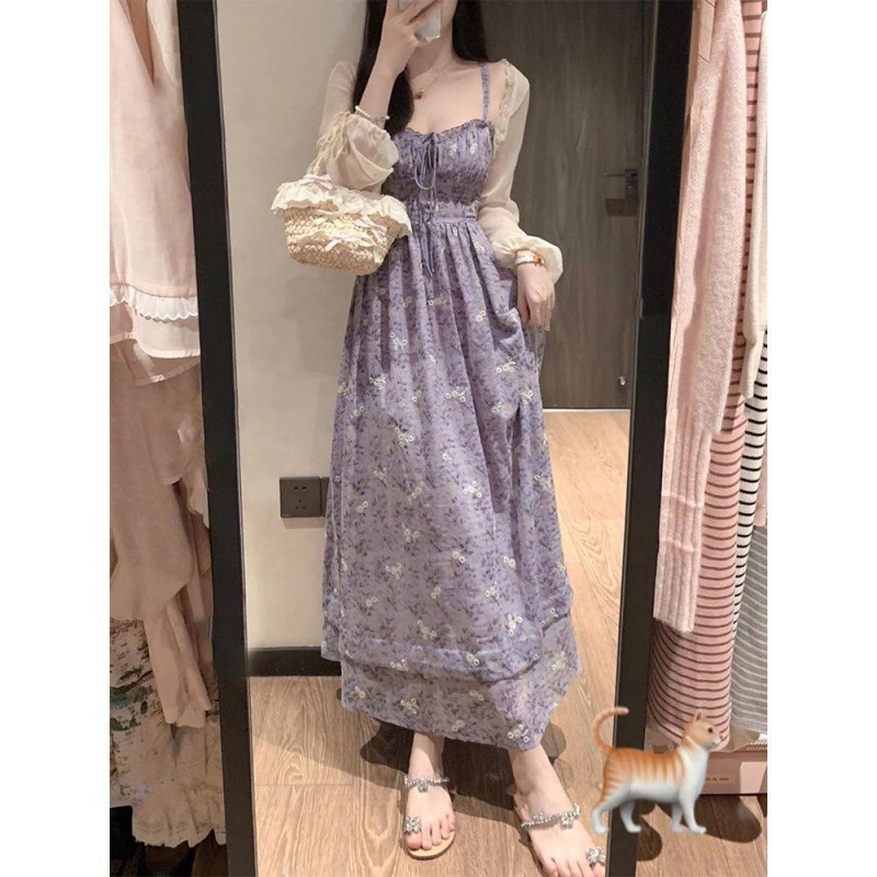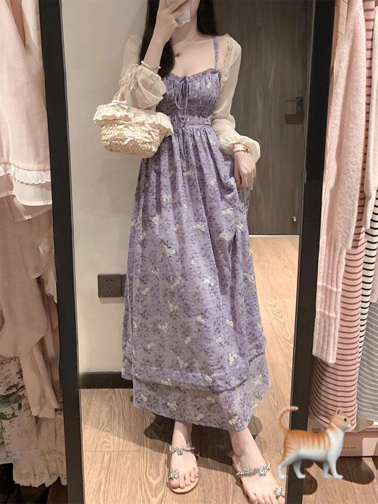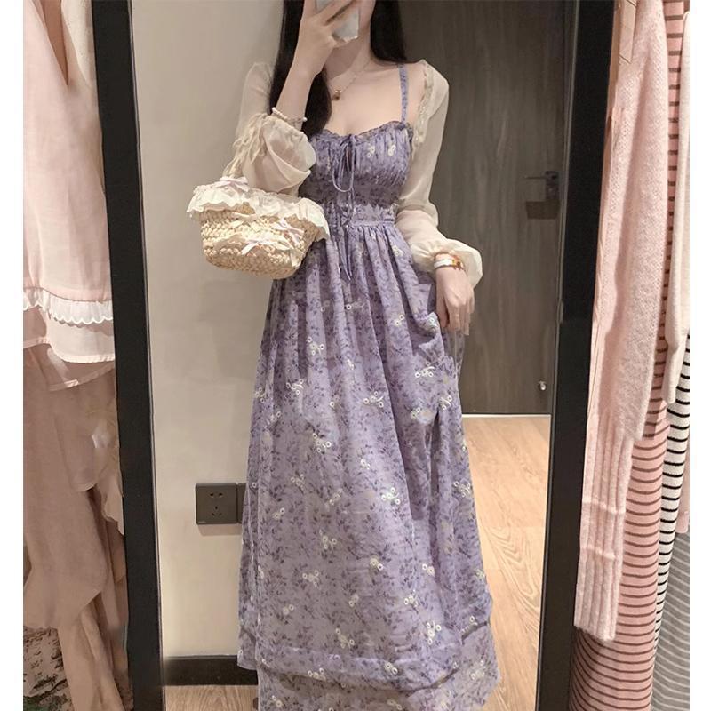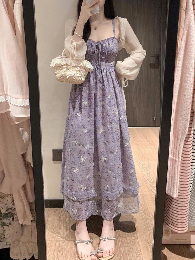 여름 보라색 슈퍼 페어리 타이트 허리 스트랩 꽃 긴 원피스 서양식 시대 감소 슬링 원피스 얇은 카디건 세트스토어 가기