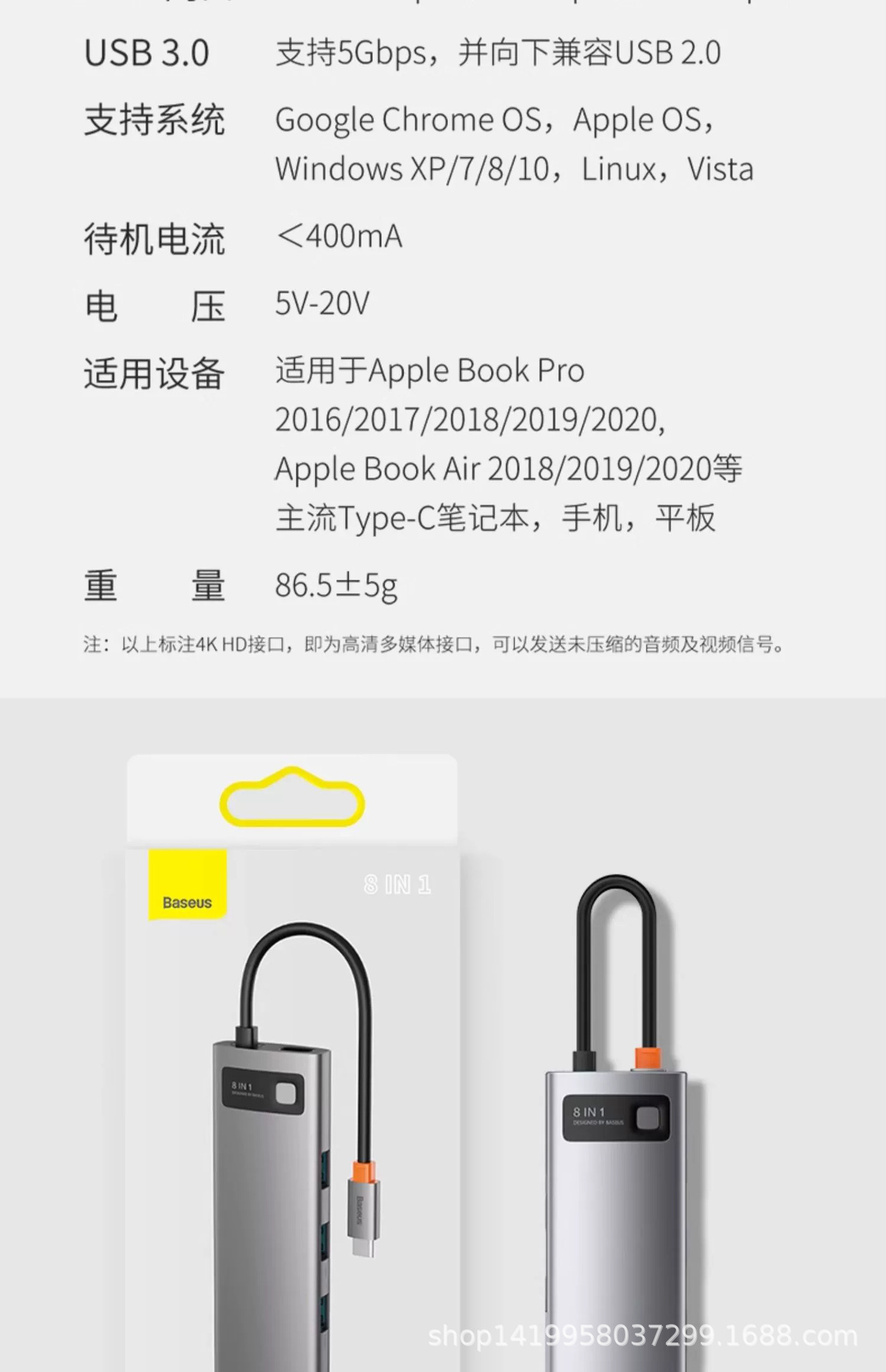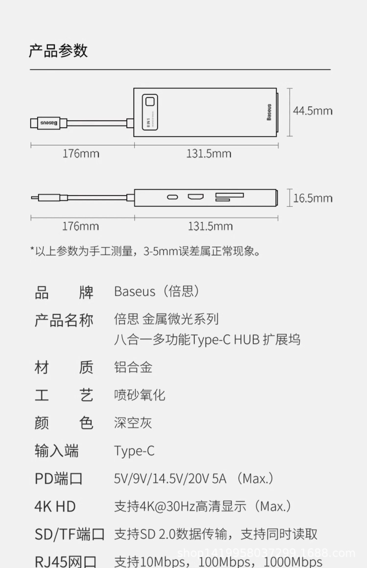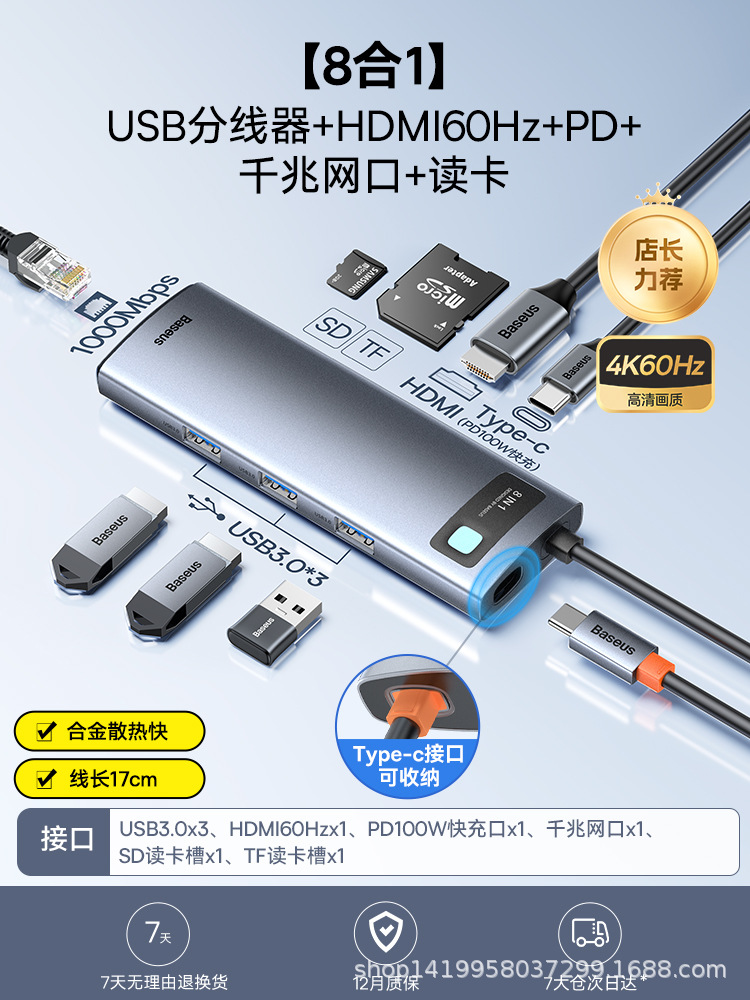 • [메탈 쉬머 8-in-1] 업그레이드된 HDMI60Hz+USB3.0x3+PD+기가비트 이더넷 포트+카드 판독