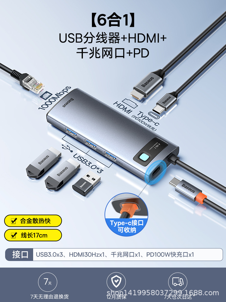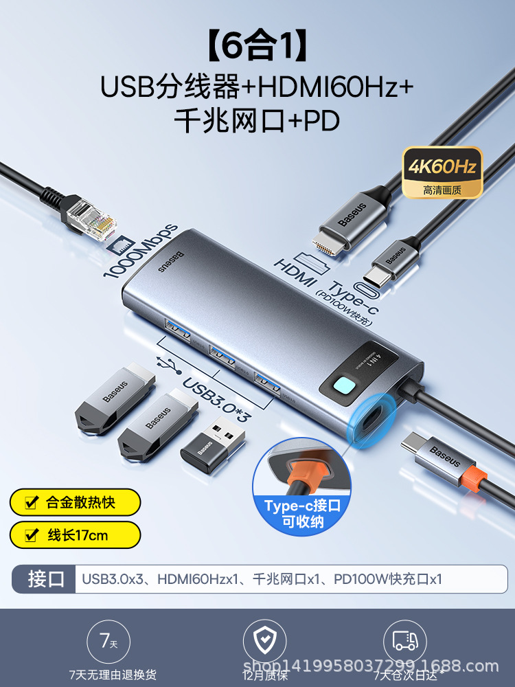 • 메탈 쉬머【6 in 1】(Type-C to HDMI*1+USB3.0*3+PD*1+RJ45*1)
