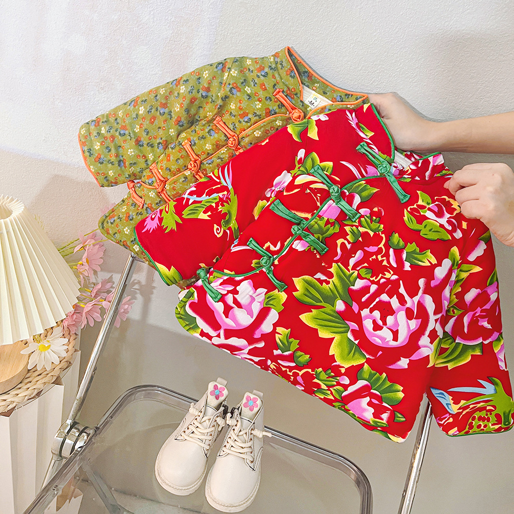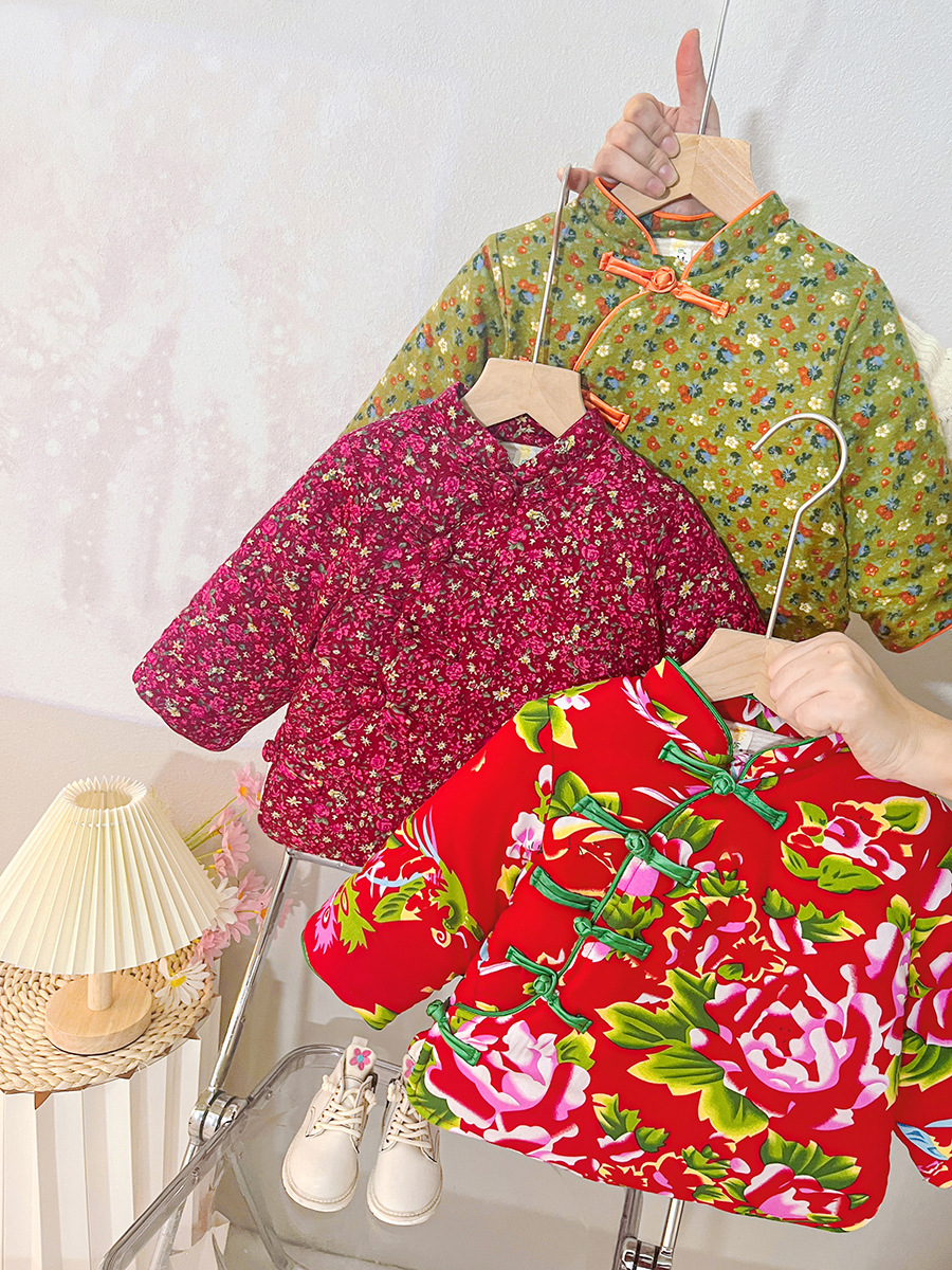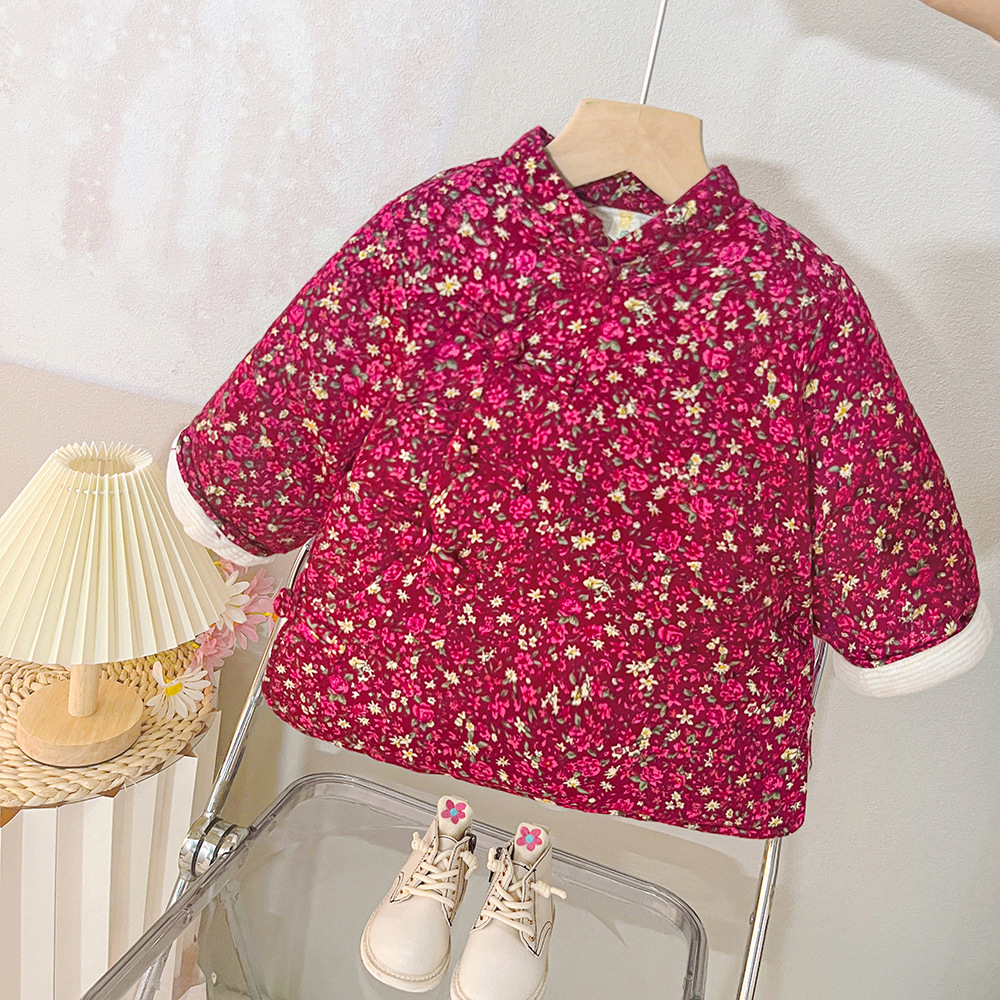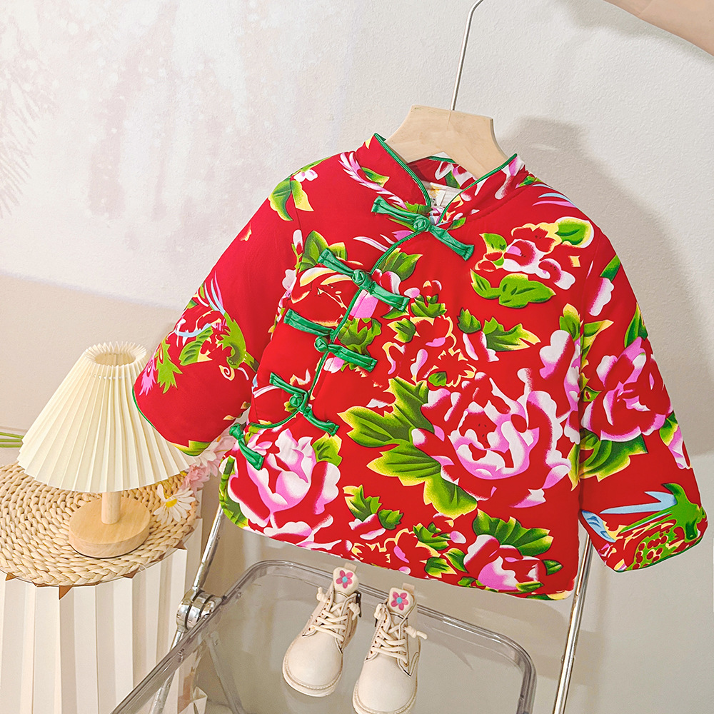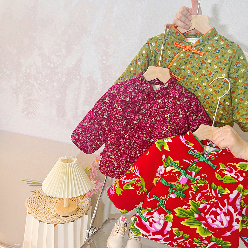소녀 기모 두꺼운 코트 동북 꽃 장식 코트 아기 소녀 빈티지 코튼 패딩 코트 사이버 레드 탑 윈터 코트