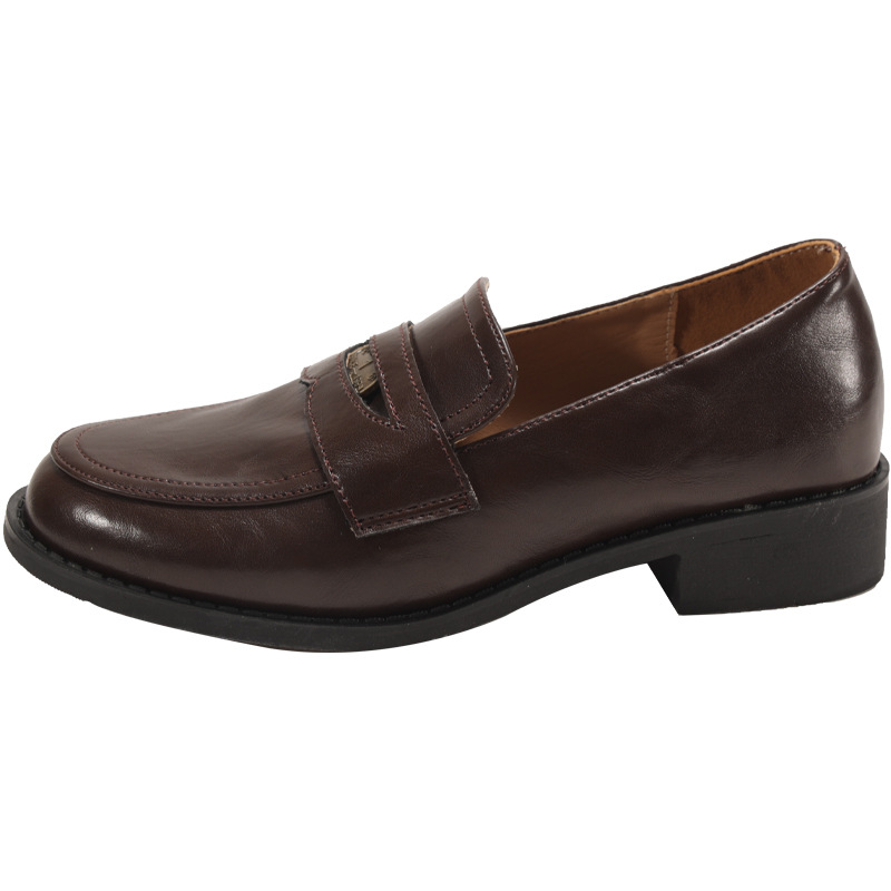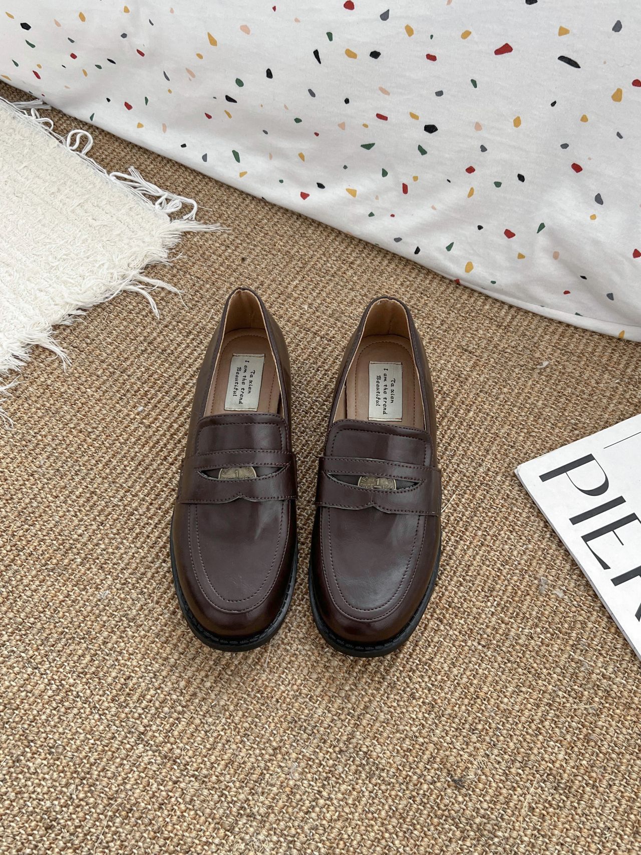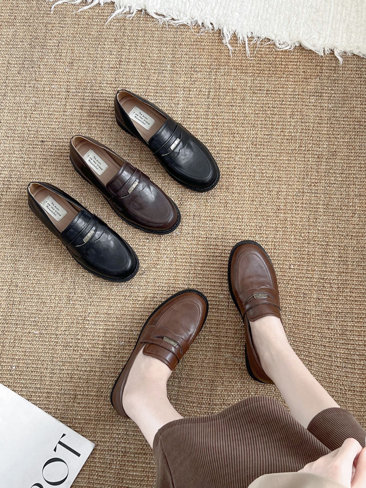 빈티지 다크 브라운 로퍼 여성용 봄 및 가을 콩 신발 슬립 온 블랙 싱글 레이어 신발 두꺼운 힐 여성 신발 영국 가죽 신발스토어 가기