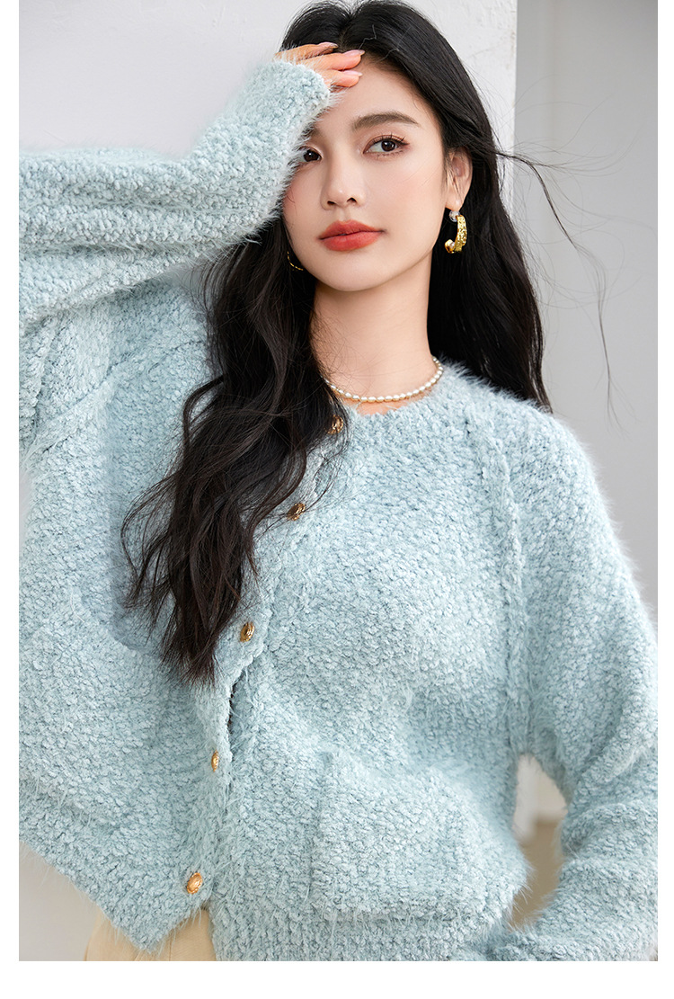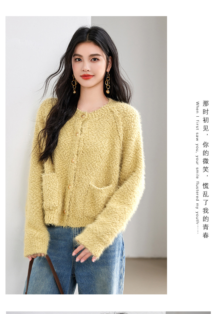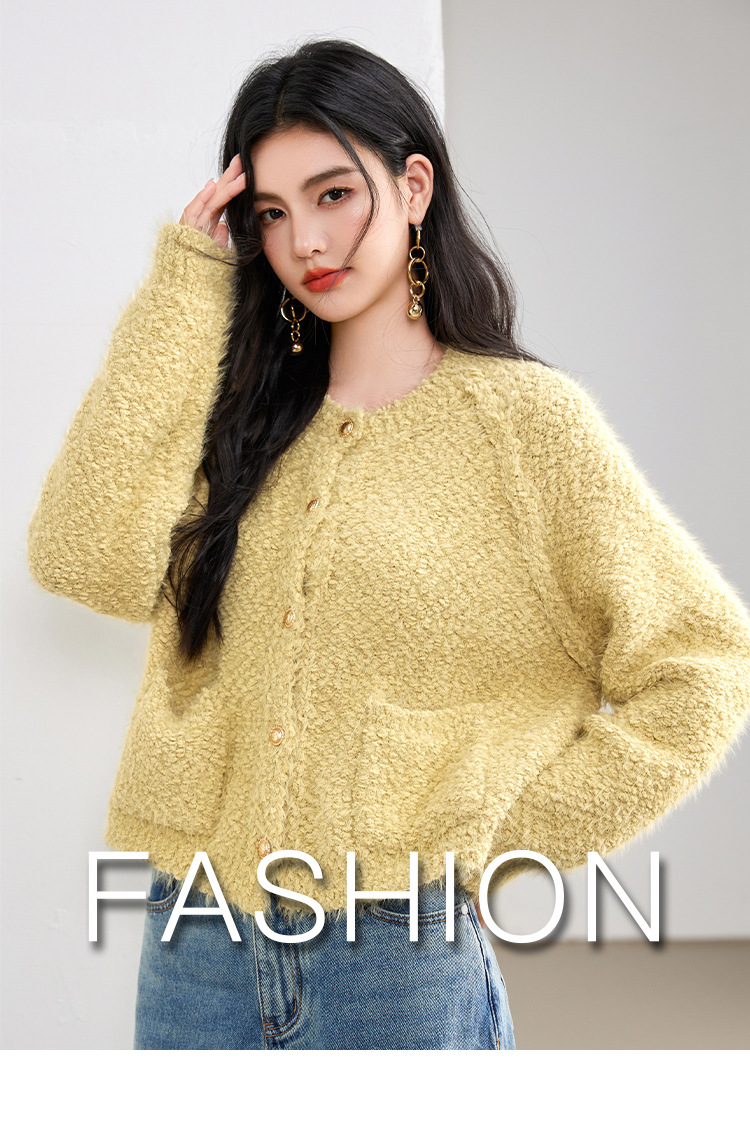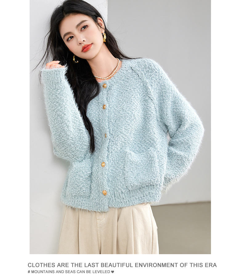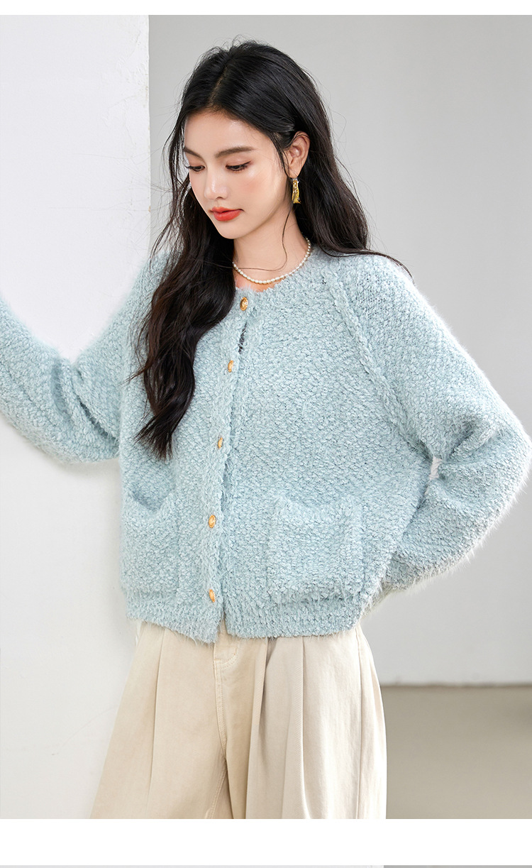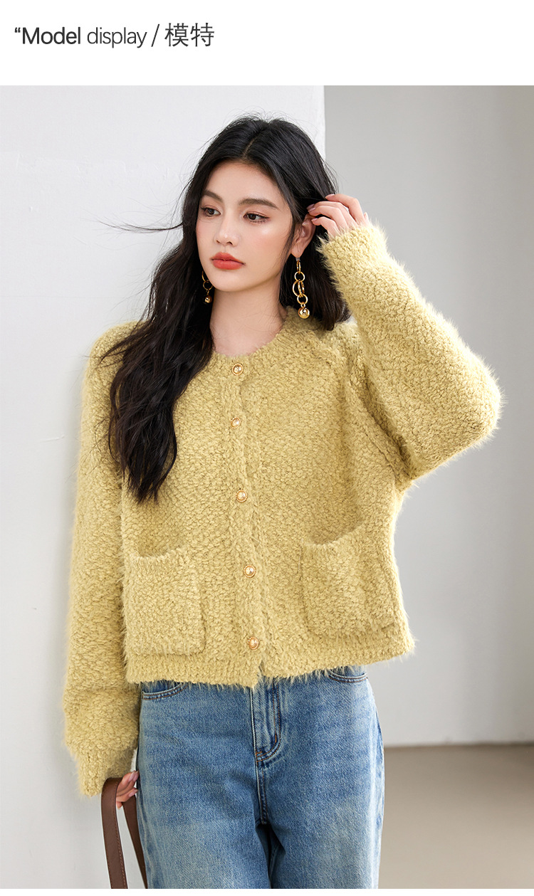 게으른 스타일 부드러운 왁스 양모 여성 의류 2024 겨울 새로운 과립 더블 포켓 카디건 라운드 넥 작은 니트 스웨터스토어 가기