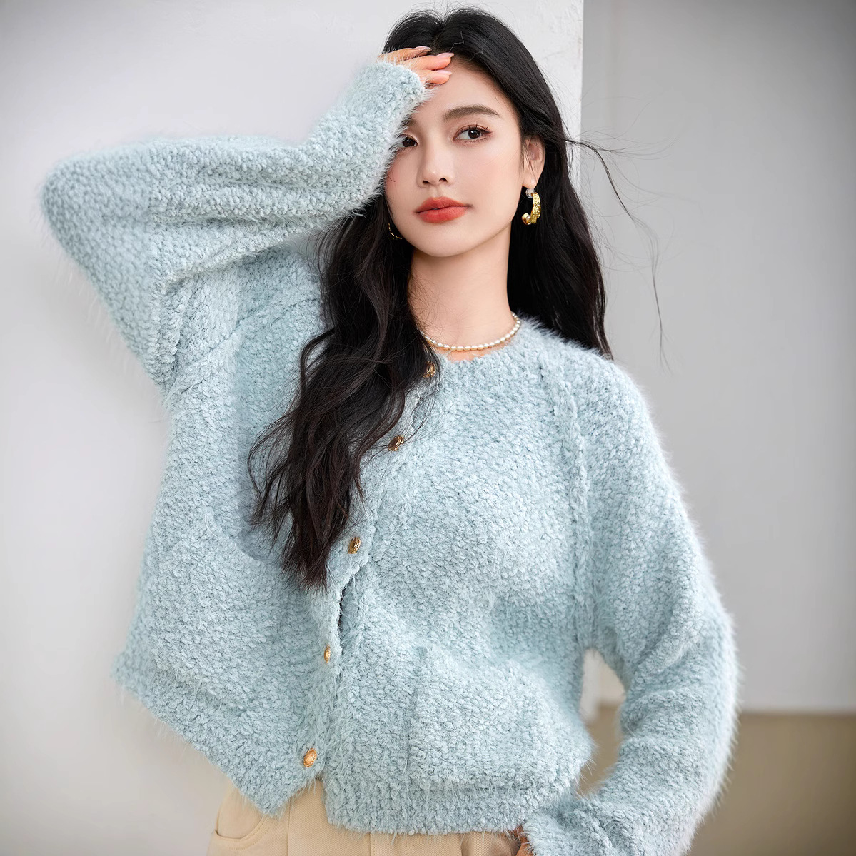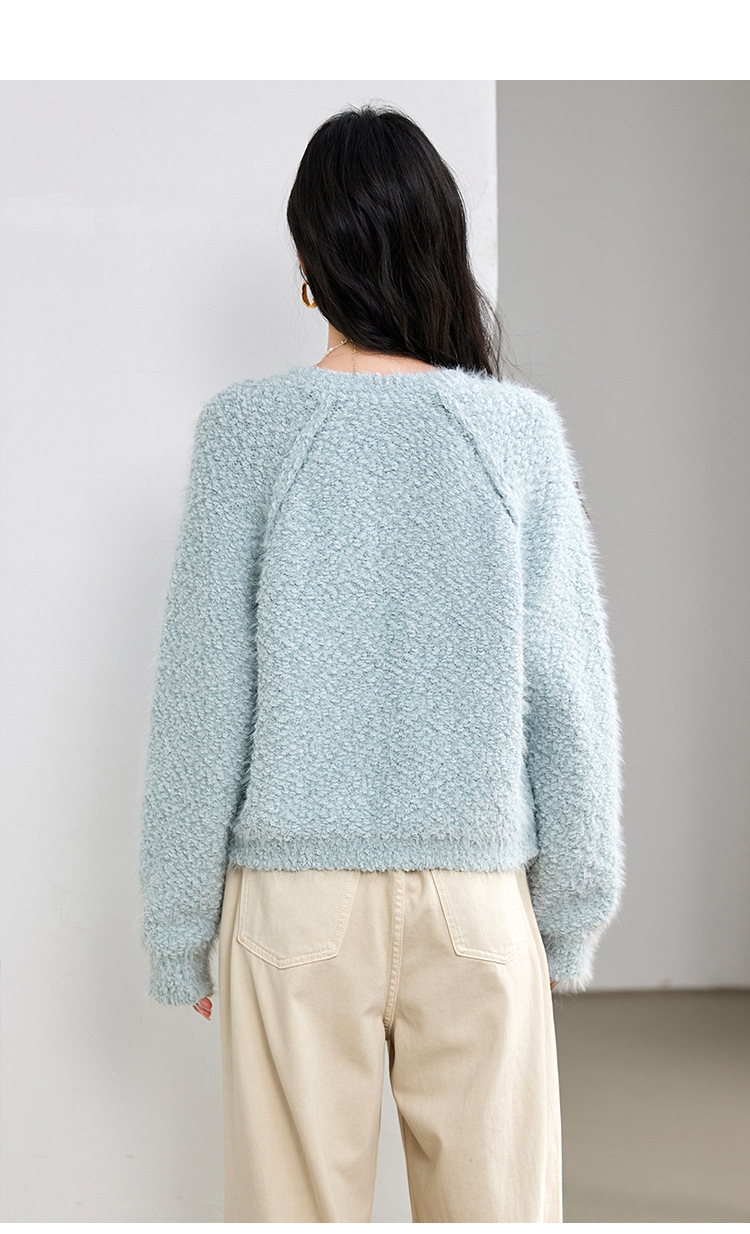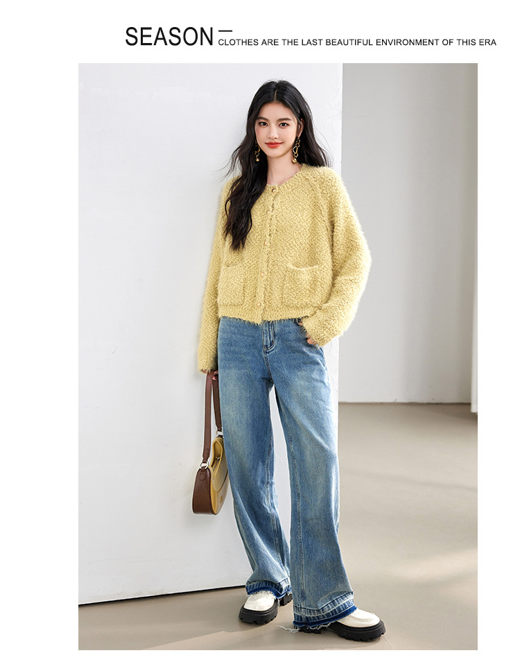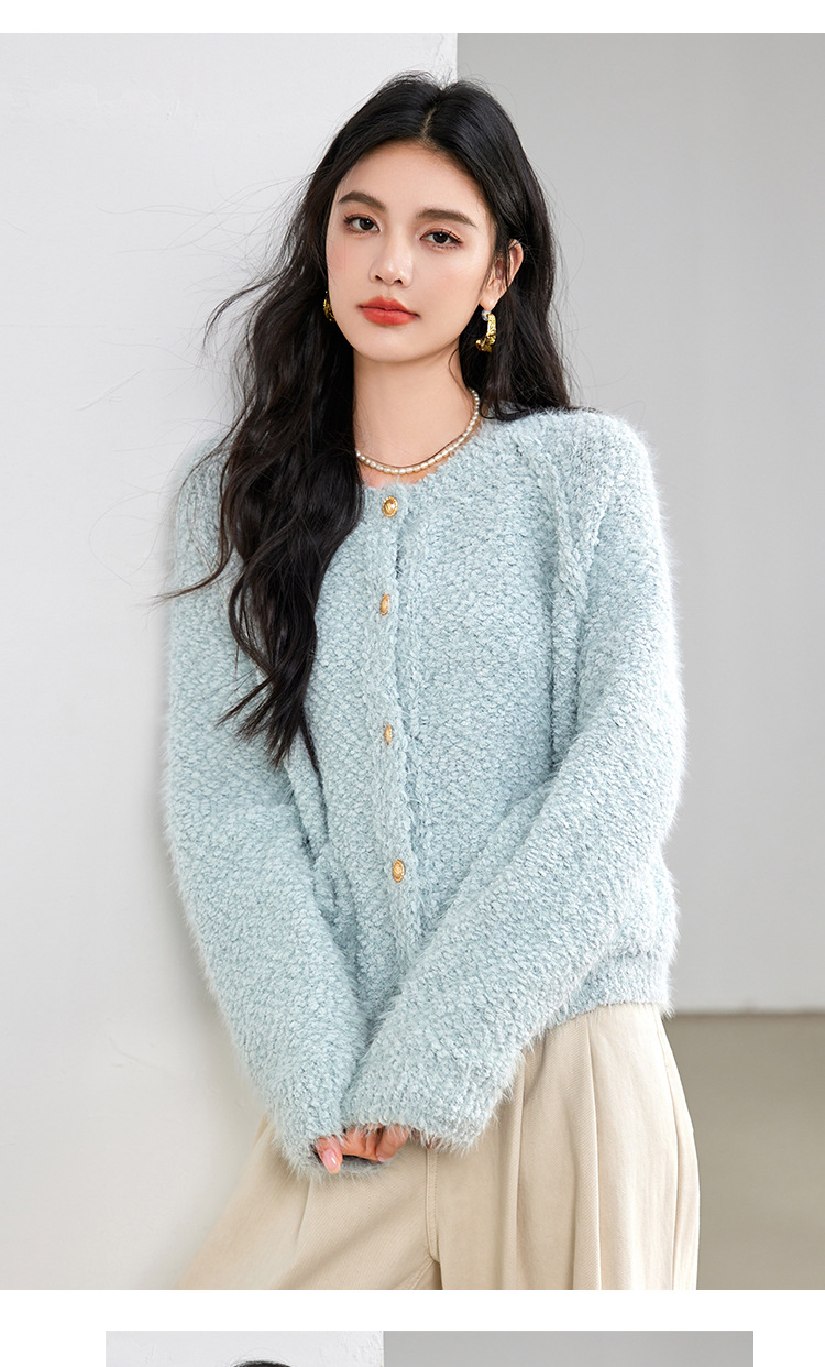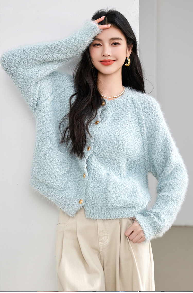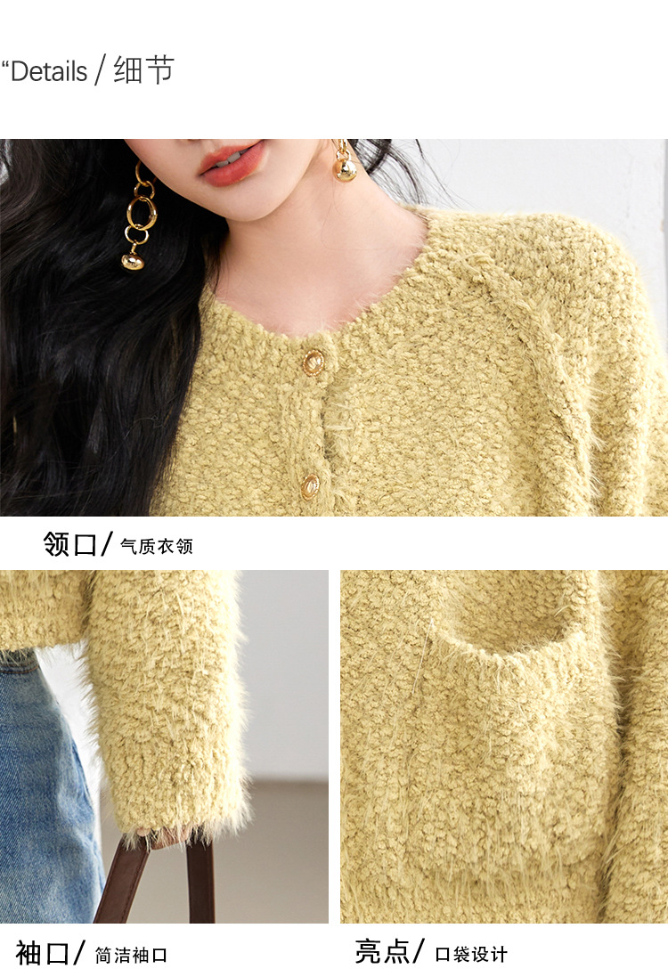 게으른 스타일 부드러운 왁스 양모 여성 의류 2024 겨울 새로운 과립 더블 포켓 카디건 라운드 넥 작은 니트 스웨터스토어 가기