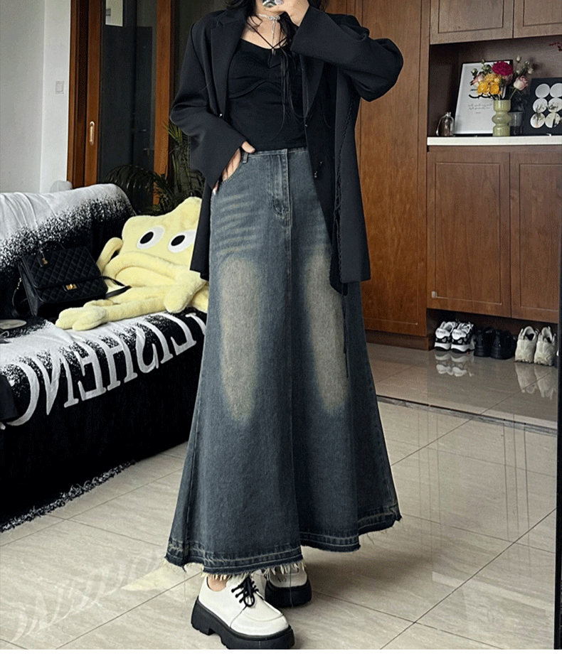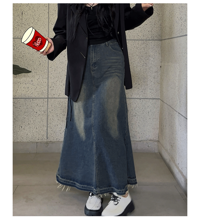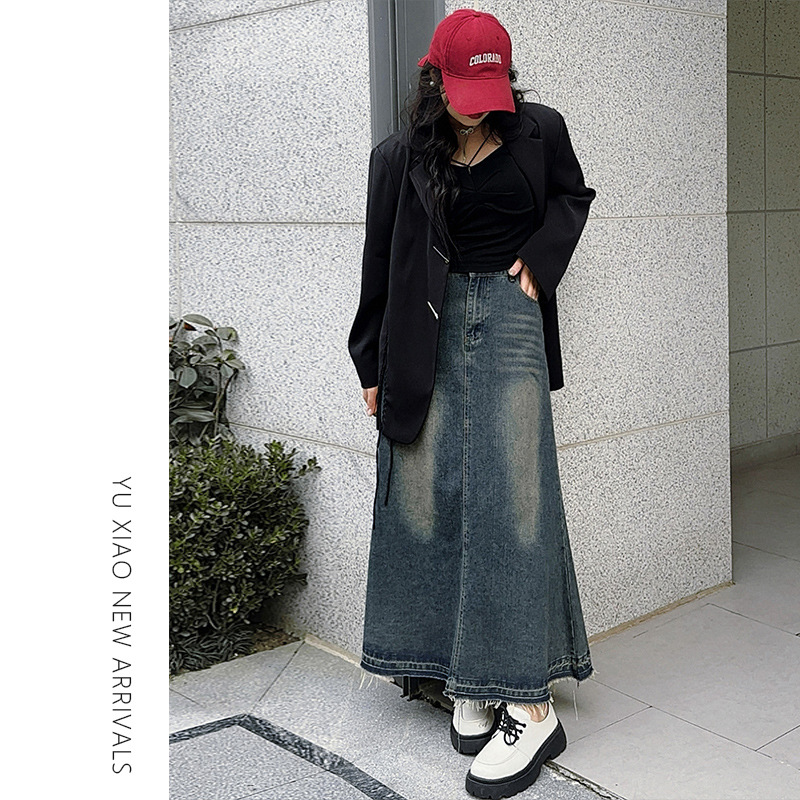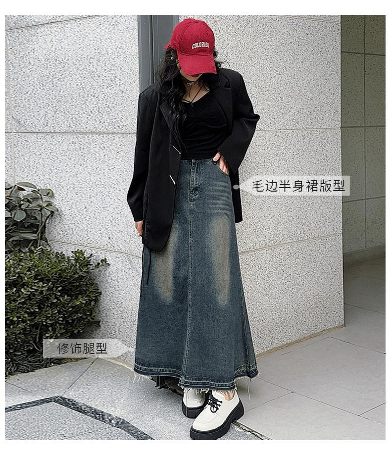 빈티지 블루 데님 스커트 여성의 가을과 겨울 높은 허리 플러스 사이즈 슬리밍 통통녀 복부를 덮는 엉덩이 중간 길이 A 라인 스커트스토어 가기