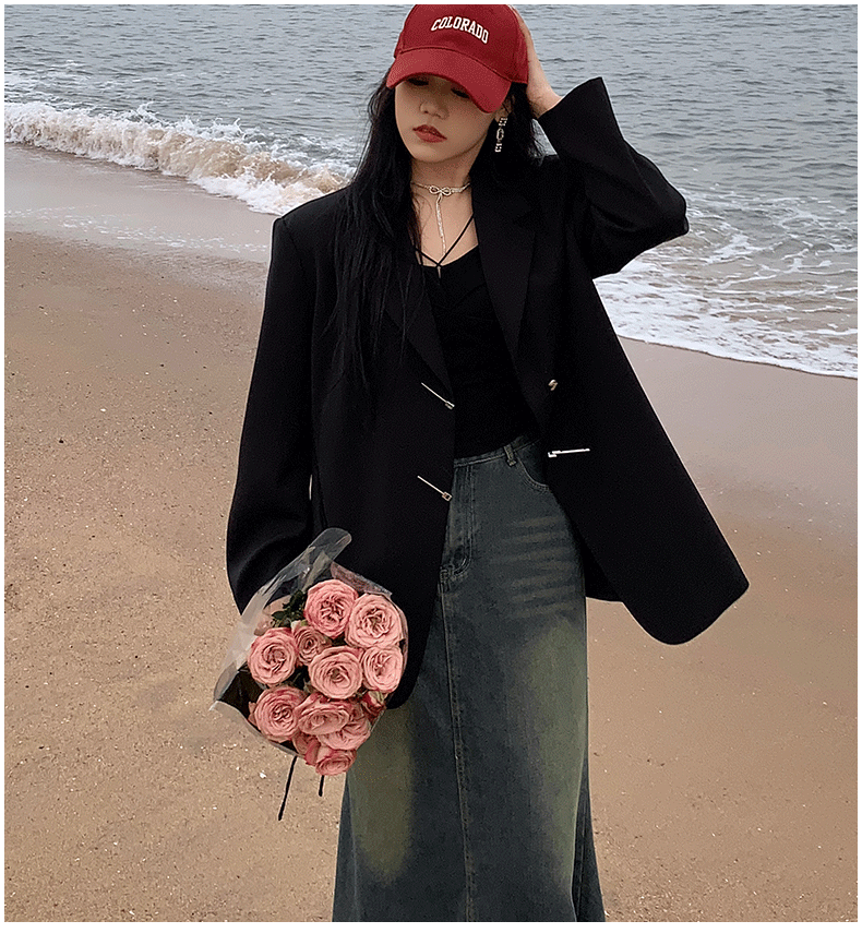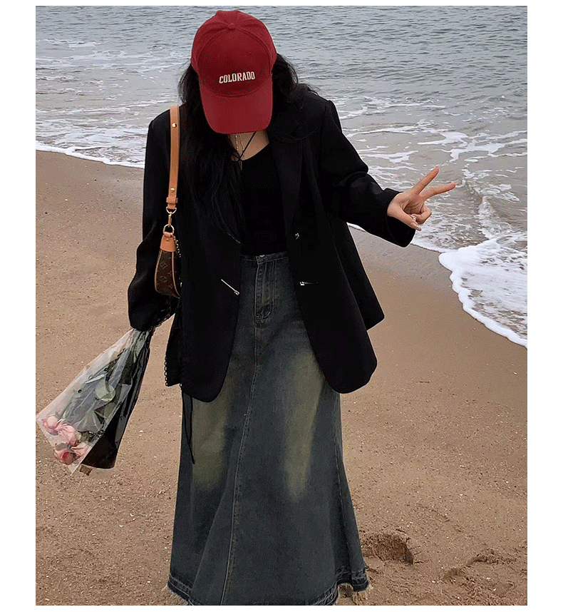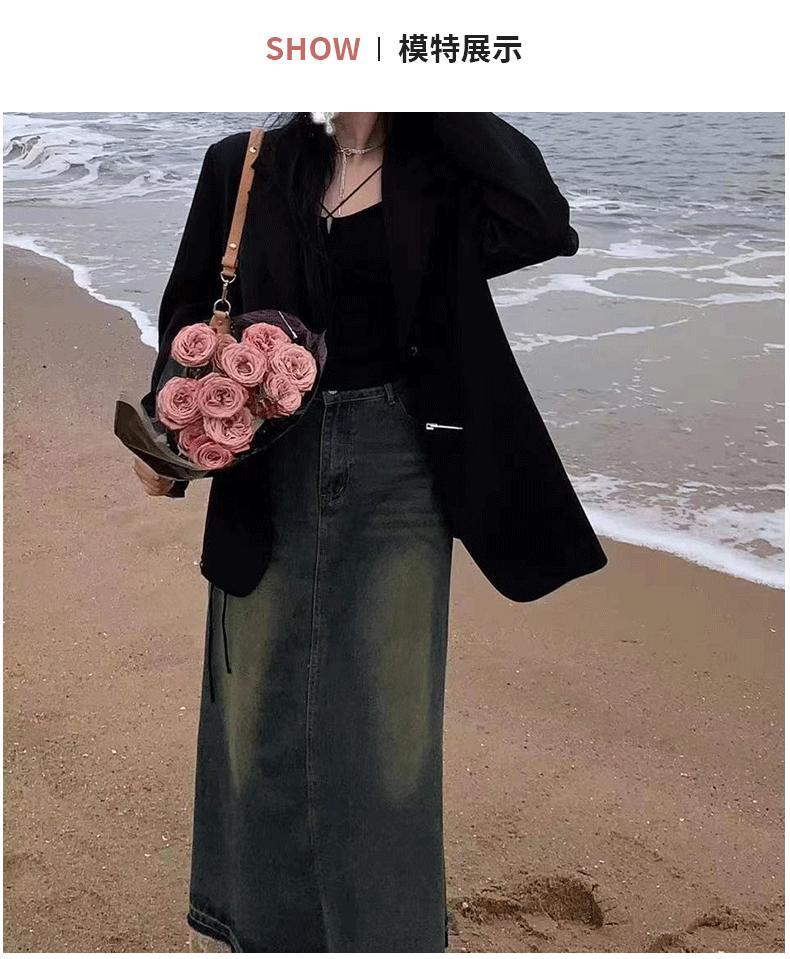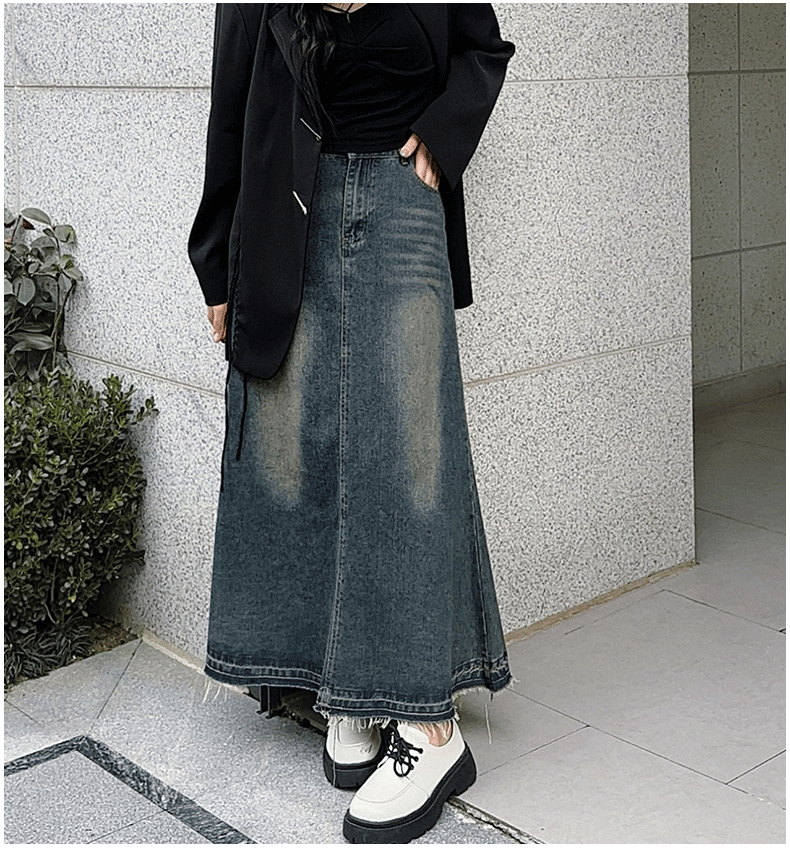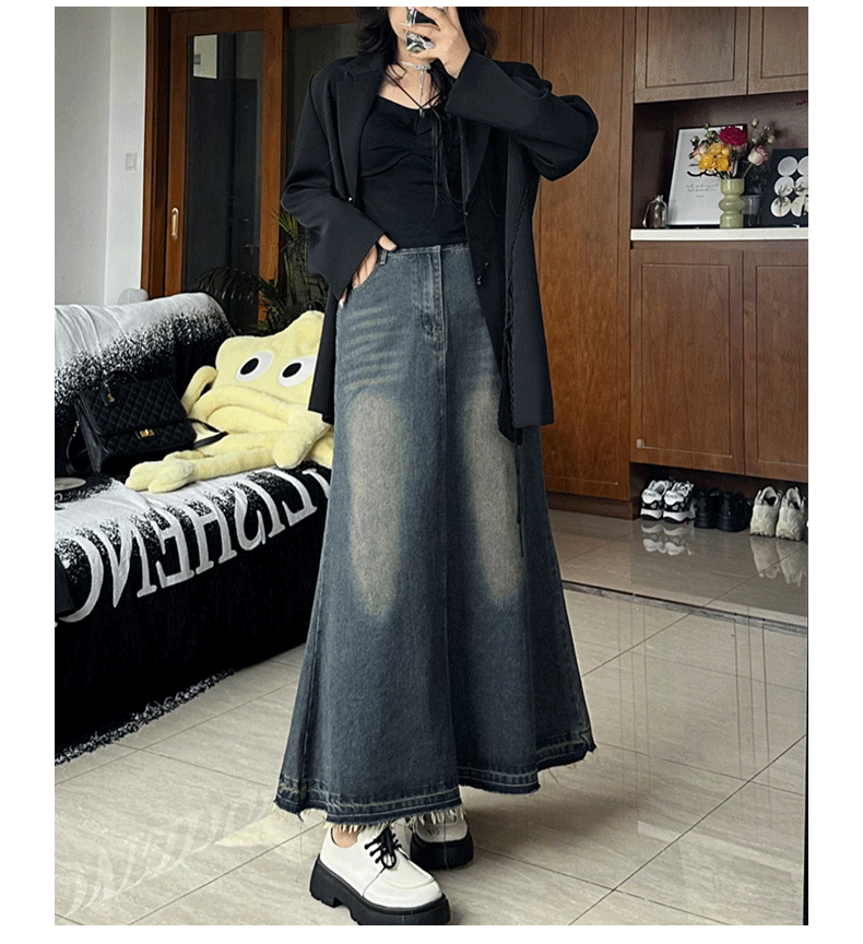 빈티지 블루 데님 스커트 여성의 가을과 겨울 높은 허리 플러스 사이즈 슬리밍 통통녀 복부를 덮는 엉덩이 중간 길이 A 라인 스커트스토어 가기
