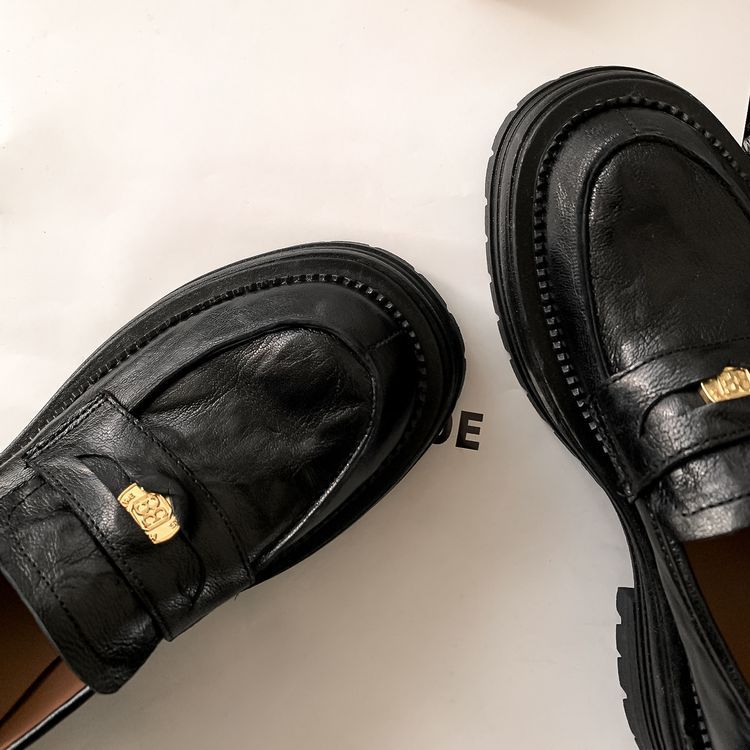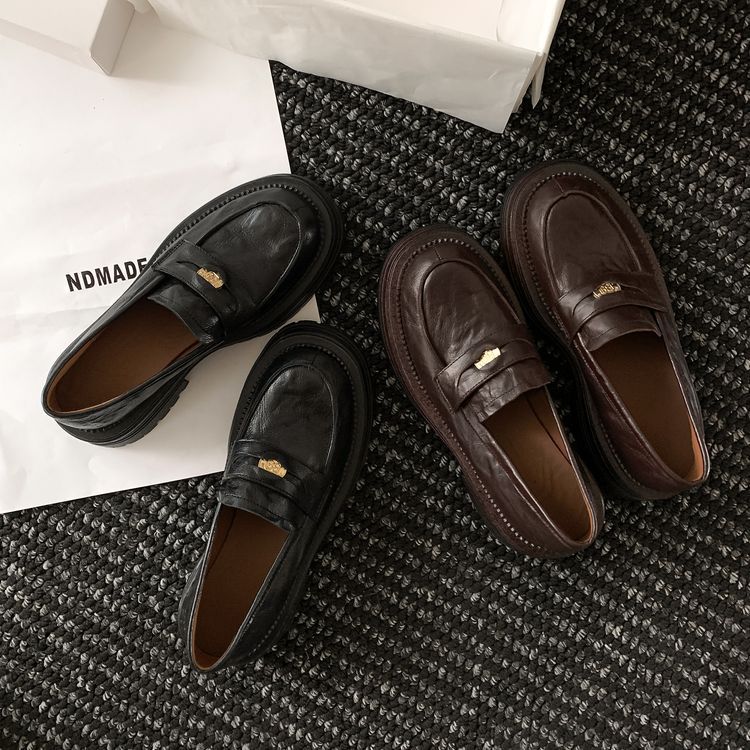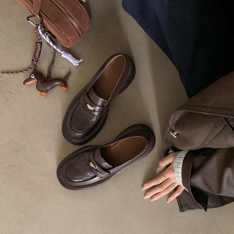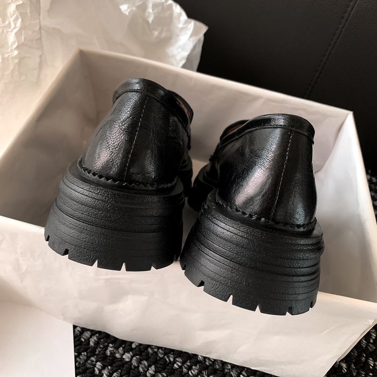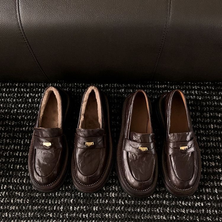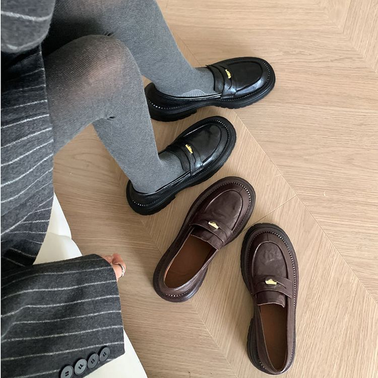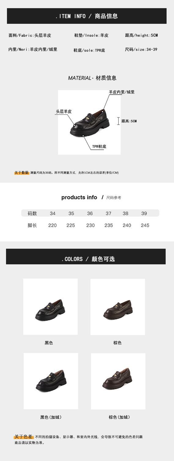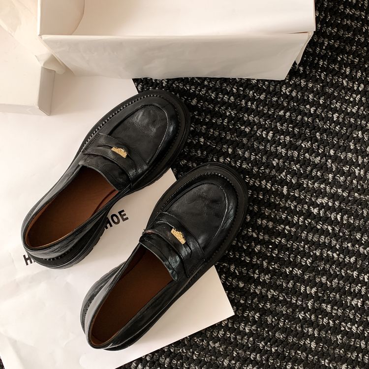 양가죽 두꺼운 밑창 로퍼 여성용 작은 가죽 신발 가을 및 겨울 새로운 라운드 토 미드 힐 슬리브 로우 탑 딥 입 싱글 레이어 신발 여성용스토어 가기