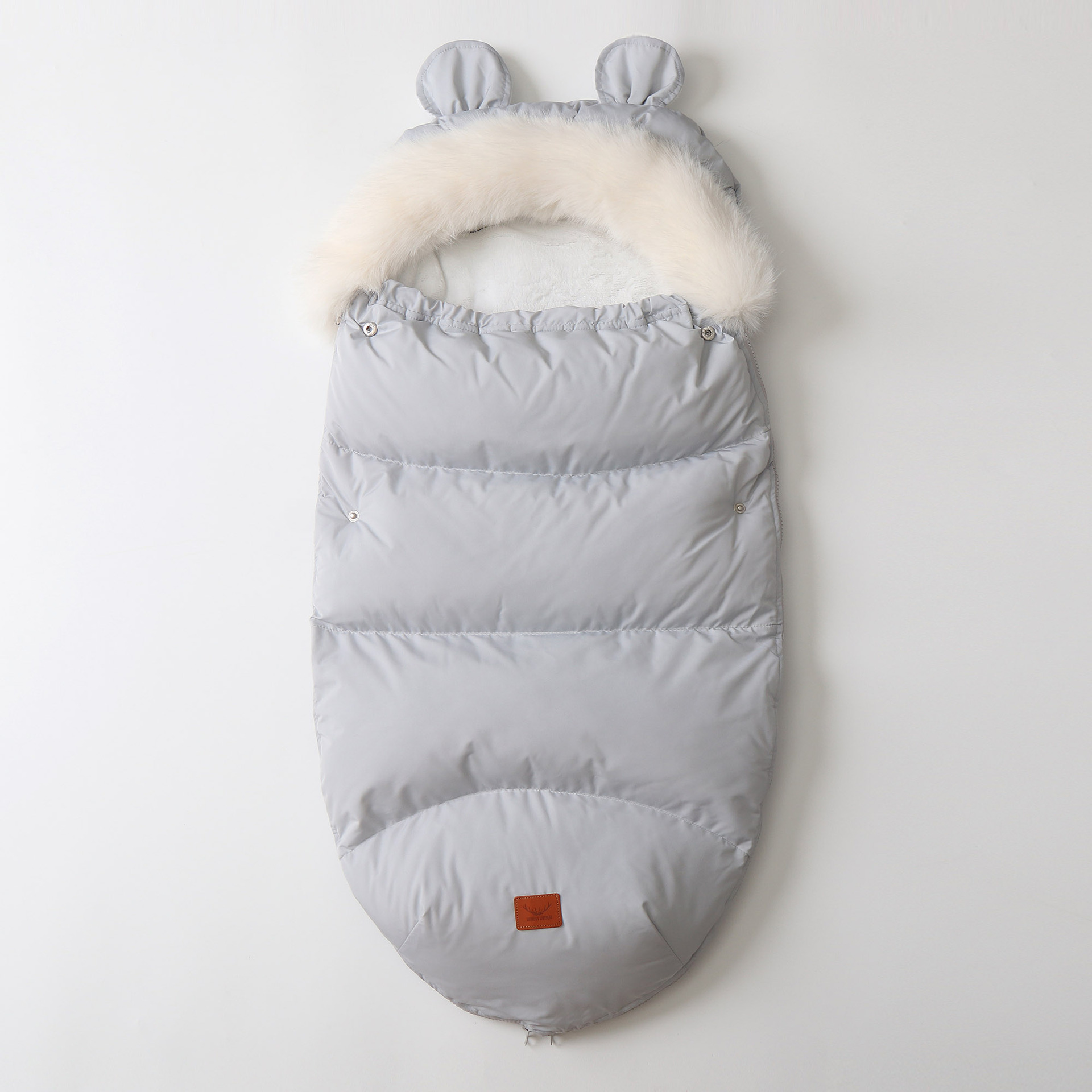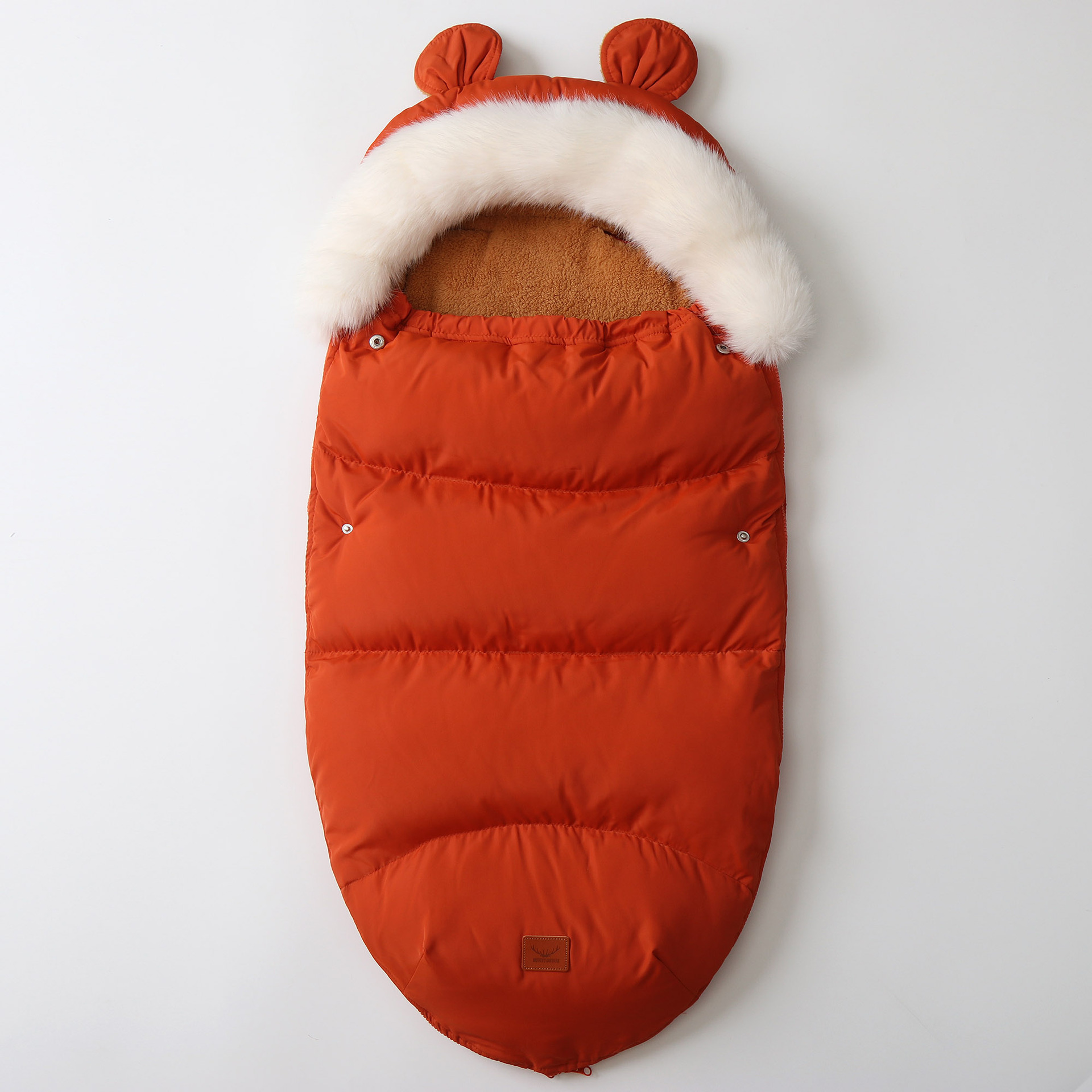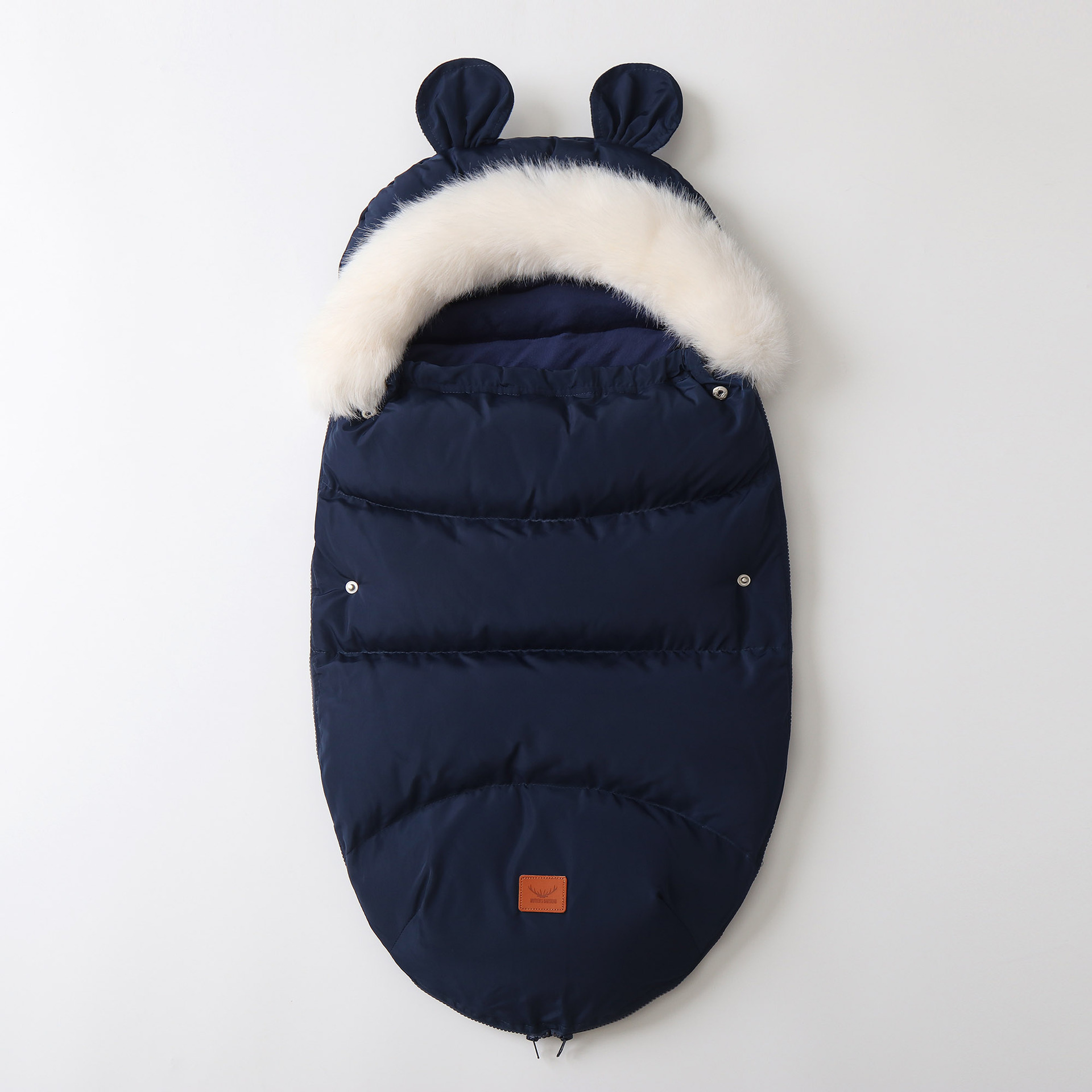 高品质睡袋,填充厚实羽绒棉,厚实保暖,内里摇粒绒,非常柔软,拉链可以一直开到脚边,方便换纸尿裤。领口位置可以翻上去,也可以卷起来,好看又实用。背面有五个孔,方便婴儿车的安全带固定,真的是好看又实用。两个小熊耳朵超级萌,毛领可以脱卸,出口品质,长期供货。