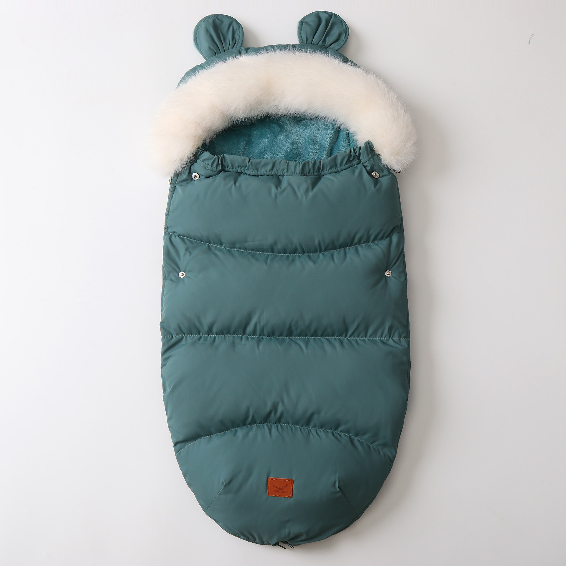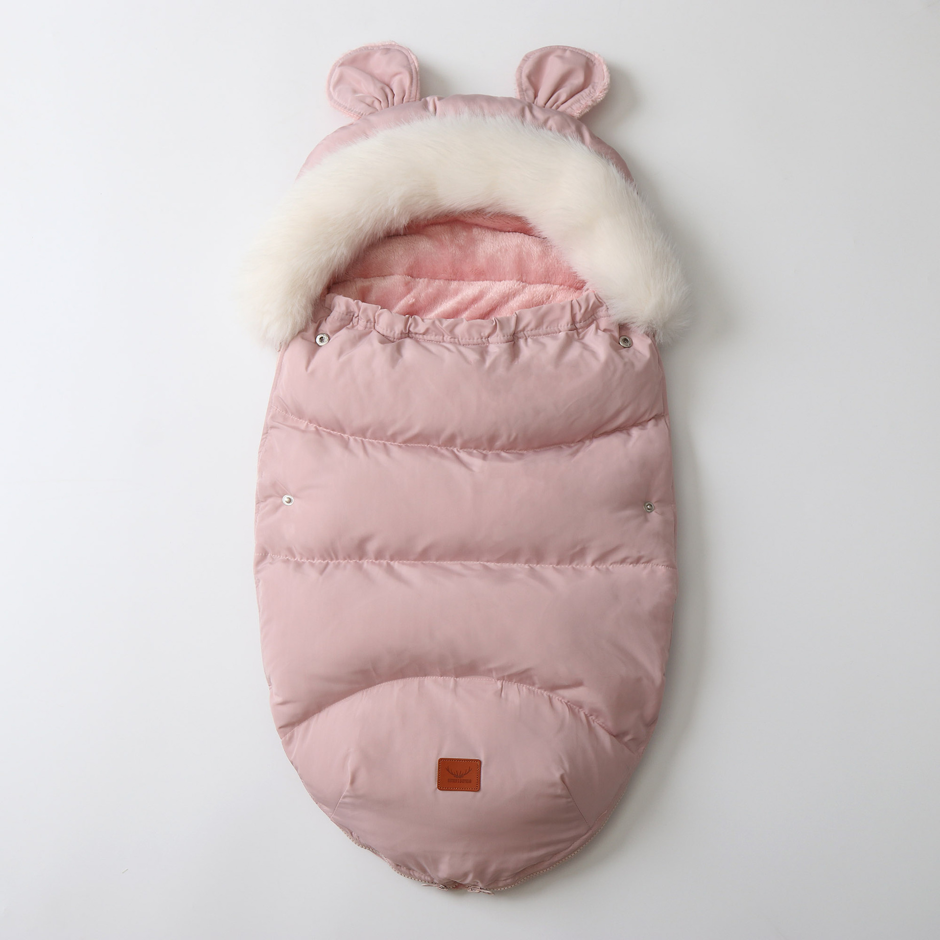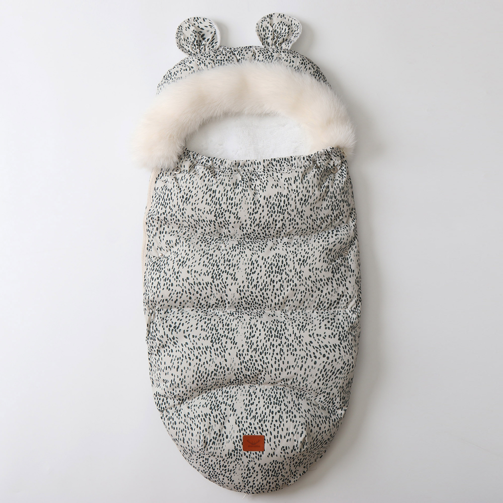 高品质睡袋,填充厚实羽绒棉,厚实保暖,内里摇粒绒,非常柔软,拉链可以一直开到脚边,方便换纸尿裤。领口位置可以翻上去,也可以卷起来,好看又实用。背面有五个孔,方便婴儿车的安全带固定,真的是好看又实用。两个小熊耳朵超级萌,毛领可以脱卸,出口品质,长期供货。