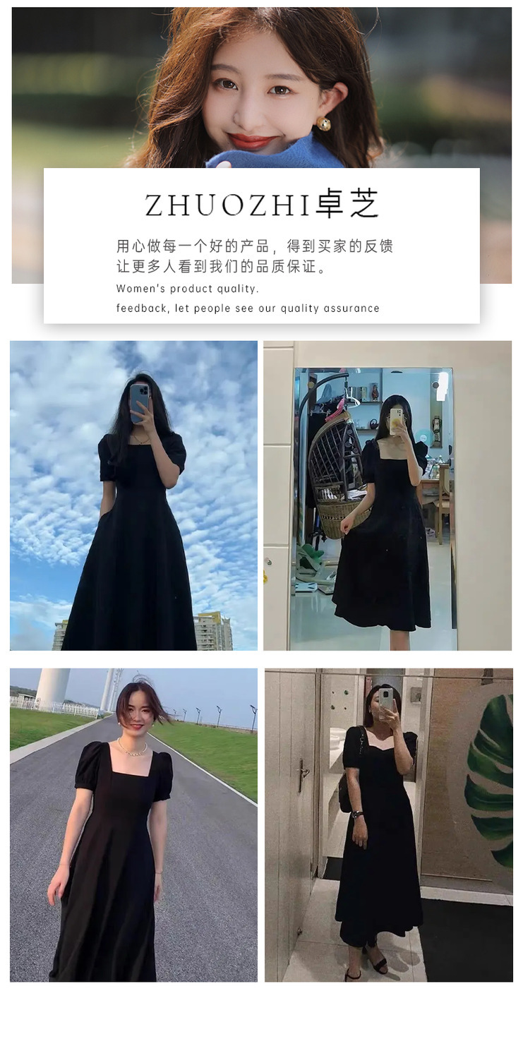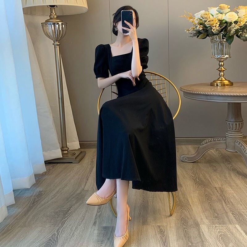 여름 프랑스 광장 칼라 퍼프 슬리브 블랙 원피스 여성의 2024 여름 새로운 헵번 블랙 스완 스커트스토어 가기