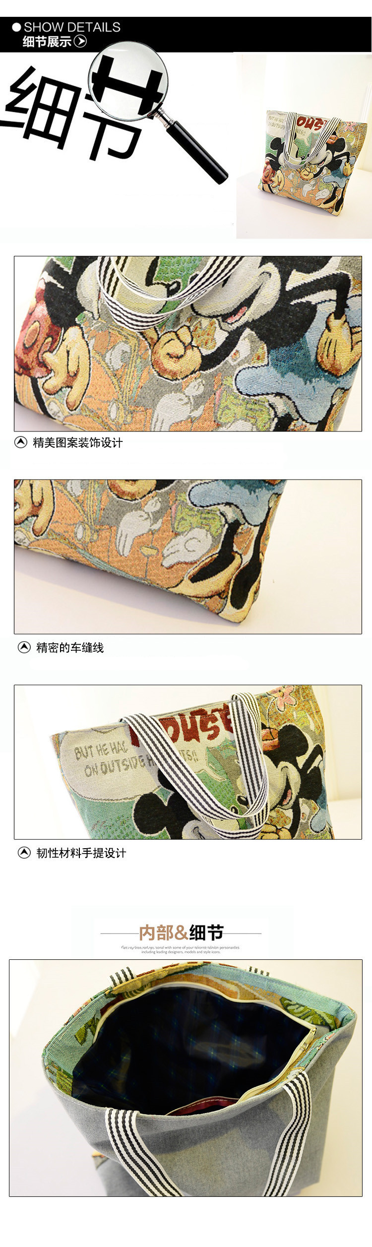 미키 마우스 곰 토끼 자수 가방 모든 경기 캐주얼 작업 쇼핑 단거리 여행 대용량 휴대용 어깨 가방스토어 가기