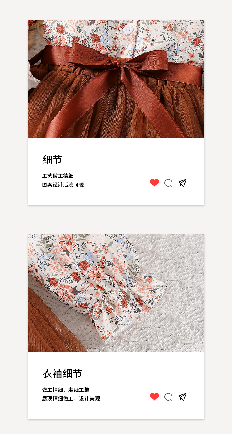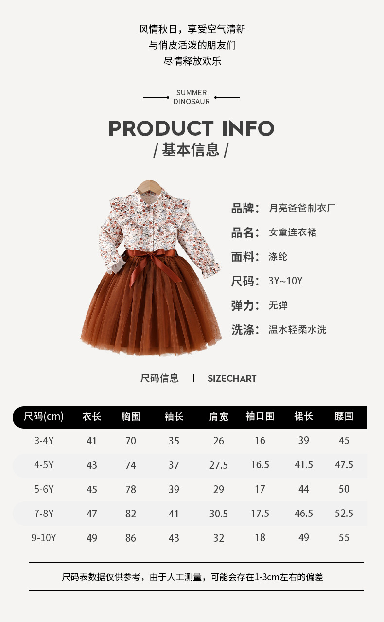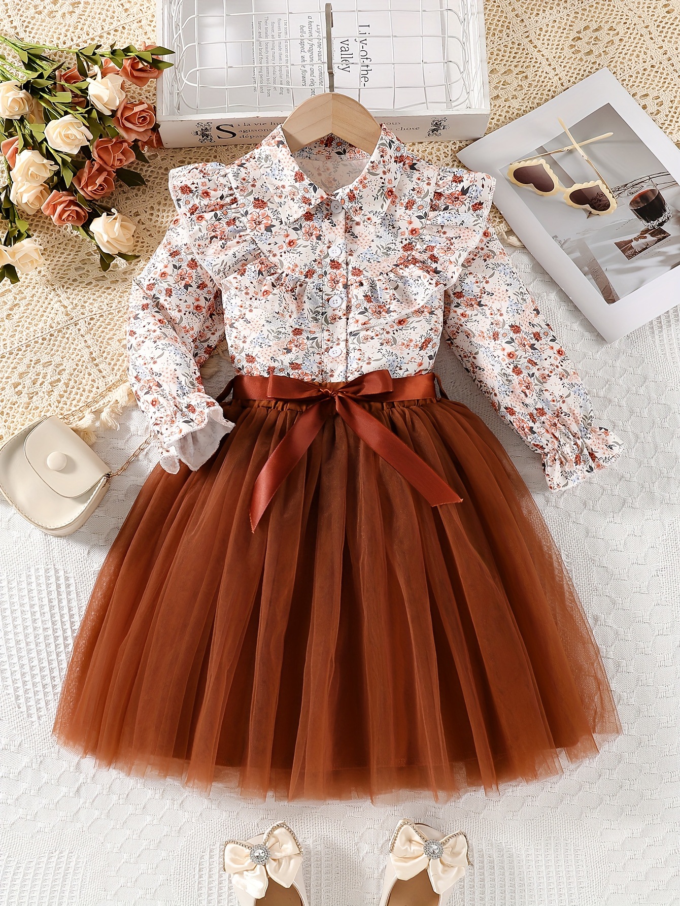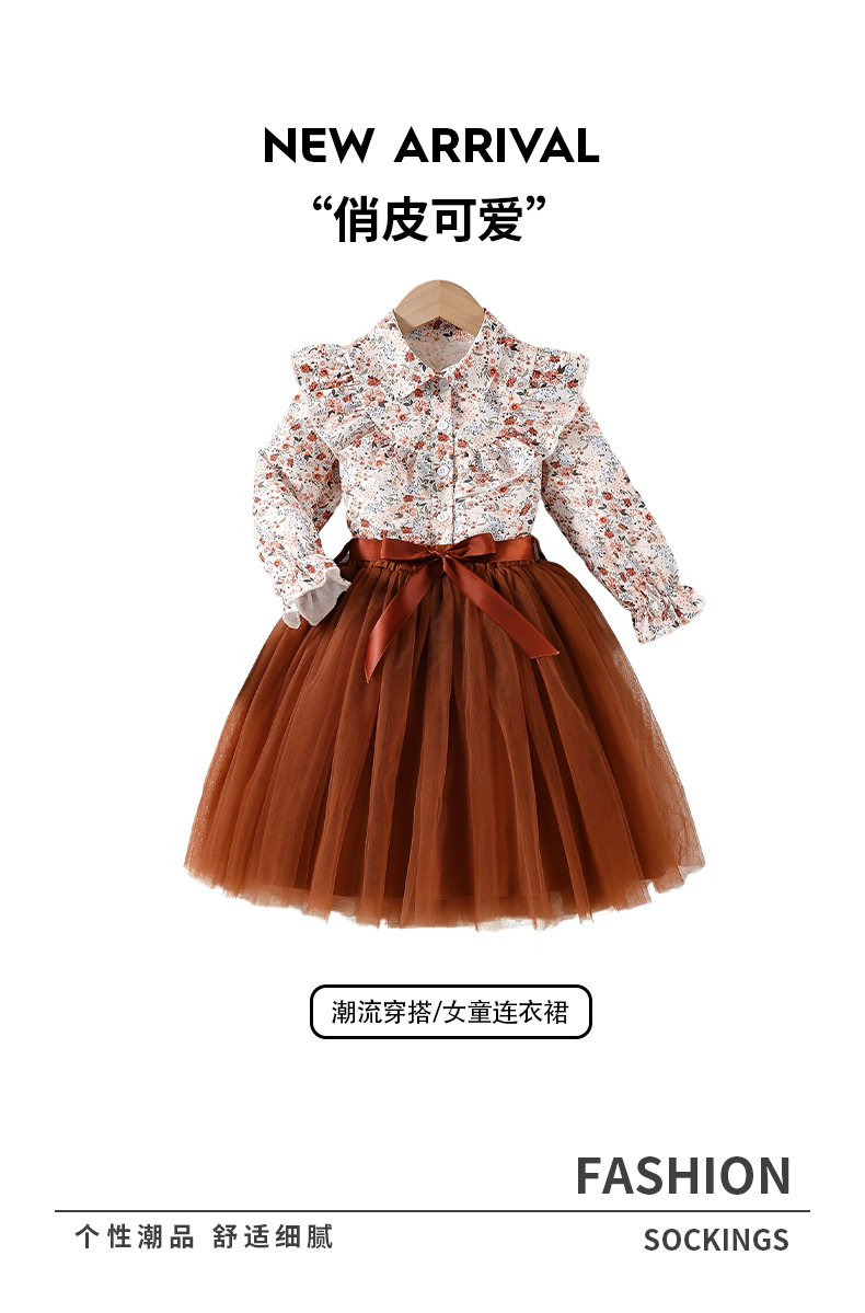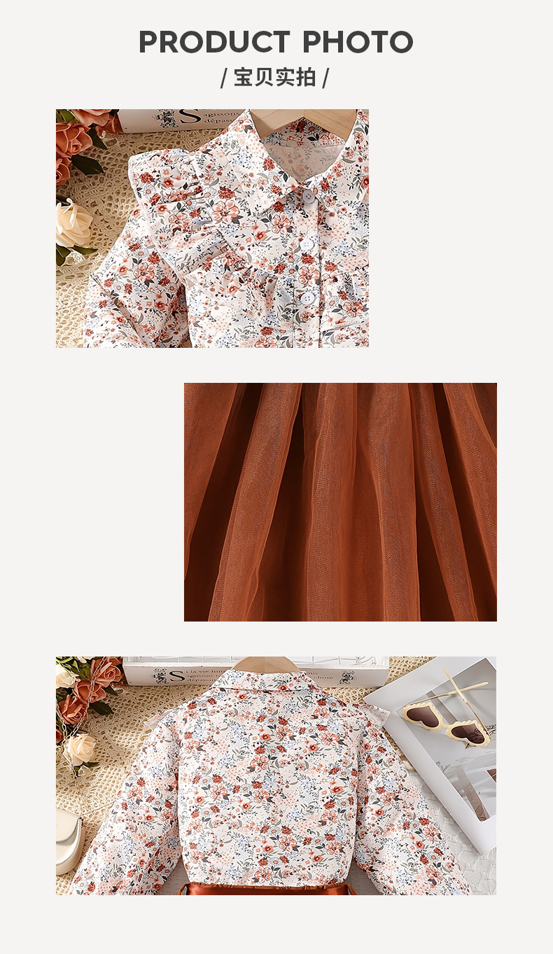 여아용 투피스 세트, 목가적인 작은 꽃무늬, 리본 벨트, 러플 칼라, 귀여운 아동용 거즈 스커트스토어 가기