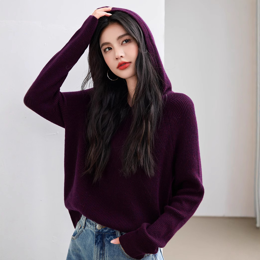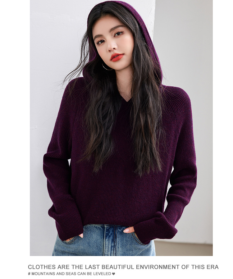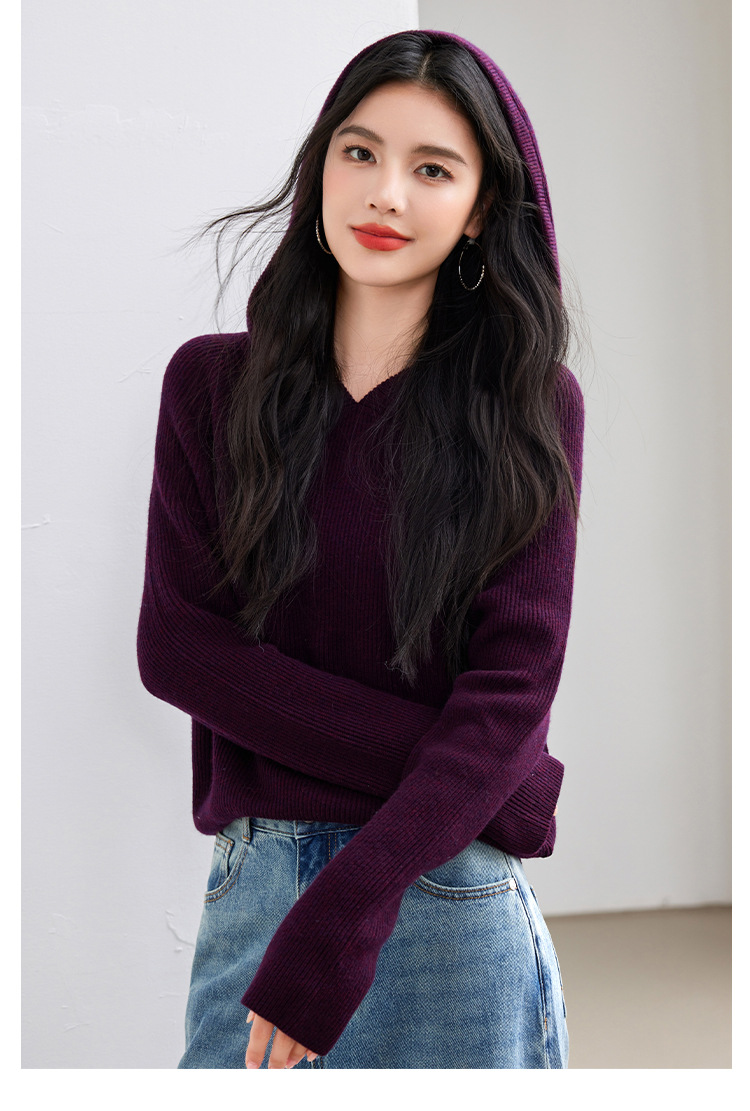 2024 년 겨울 새 한국 패션 게으른 보라색 디자인 센스 스웨터 후드 풀오버 짧은 니트 후드