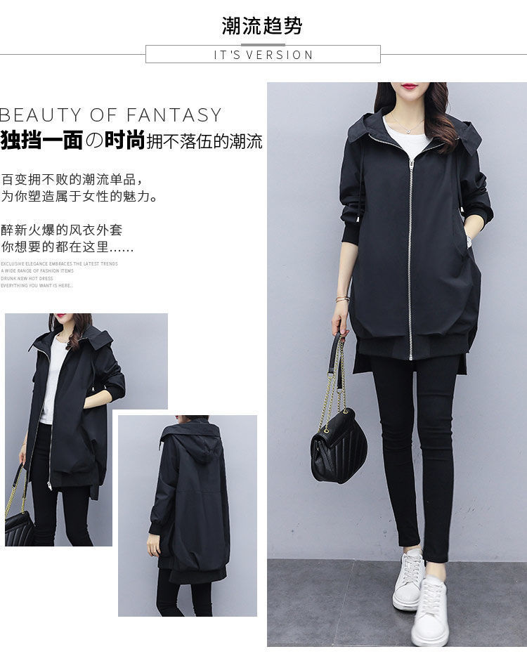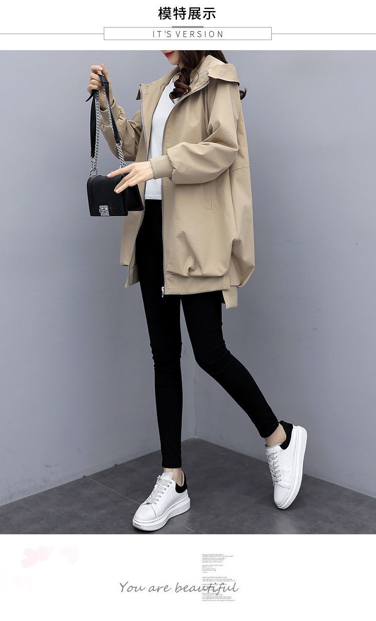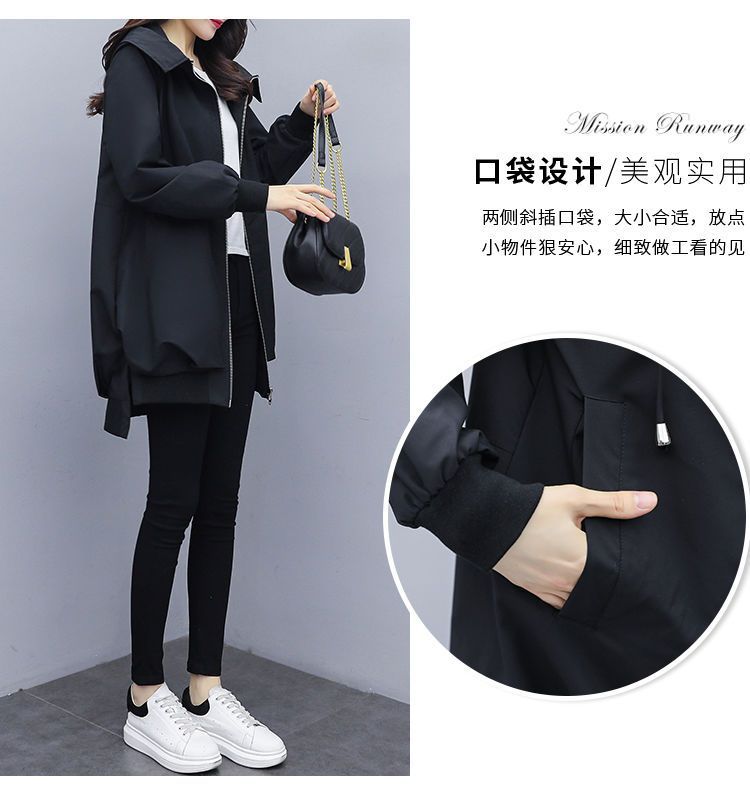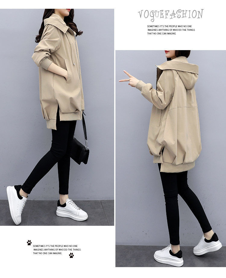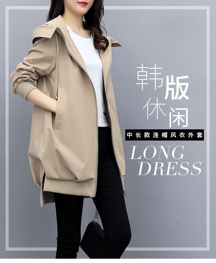 봄과 가을 한국식 카키 느슨한 캐주얼 후드 코트 여성 중간 길이의 검은 우아한 코트