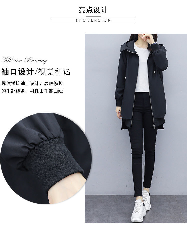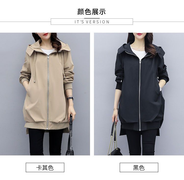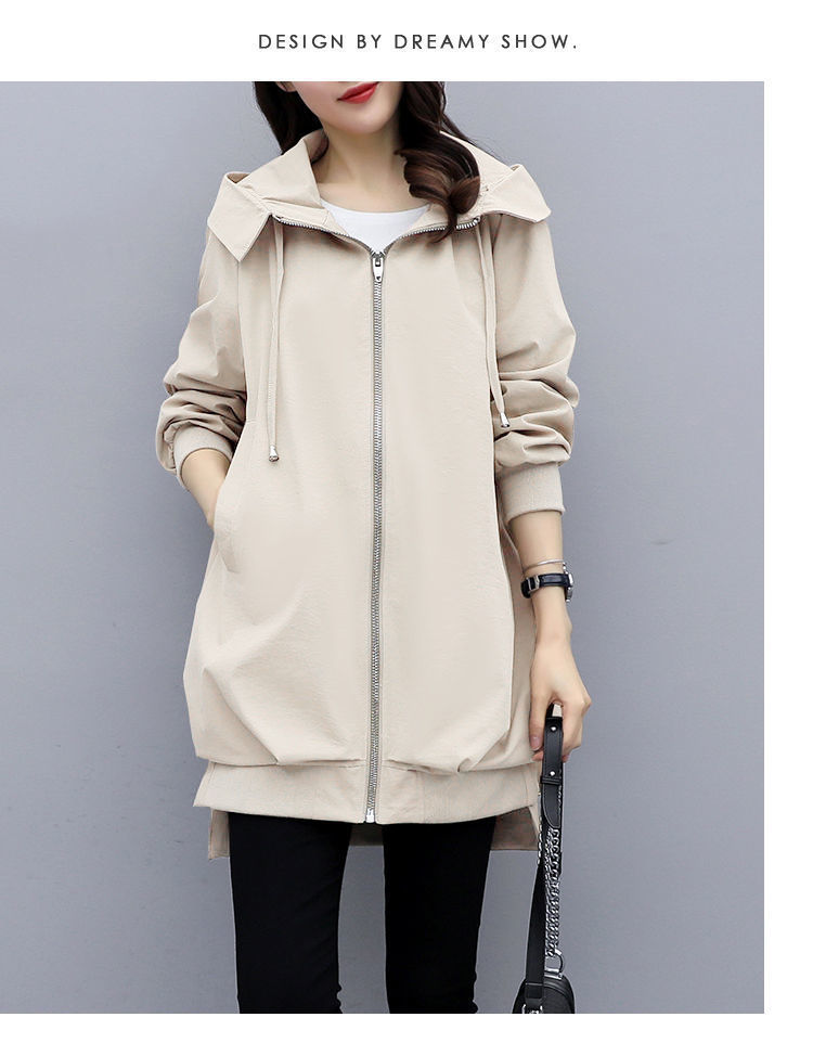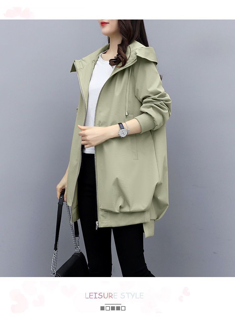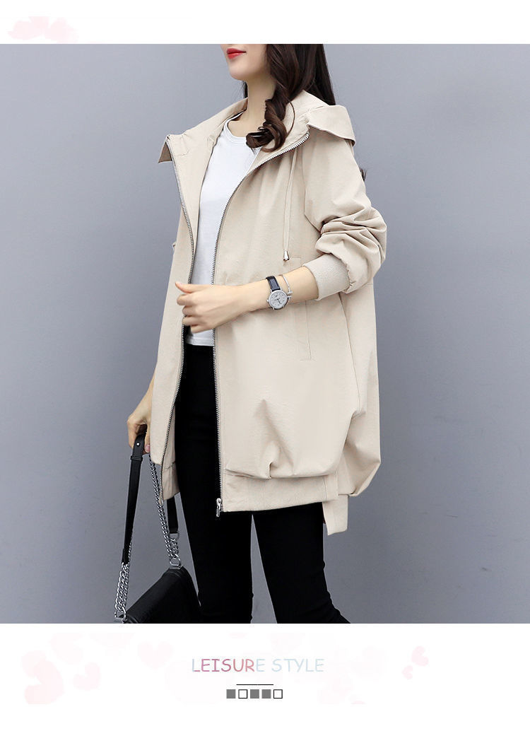 봄과 가을 한국식 카키 느슨한 캐주얼 후드 코트 여성 중간 길이의 검은 우아한 코트