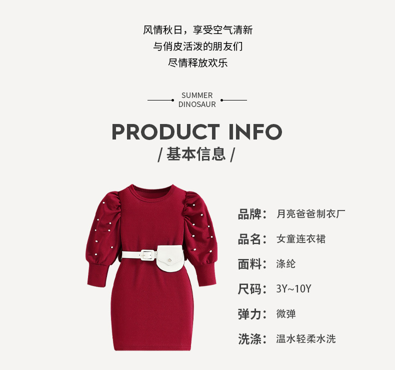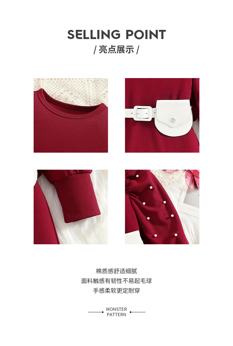 국경 간 레트로 소녀 원피스 붉은 둥근 목 랜턴 슬리브 벨트 포켓 진주 장식 가을과 겨울 어린이 치마스토어 가기