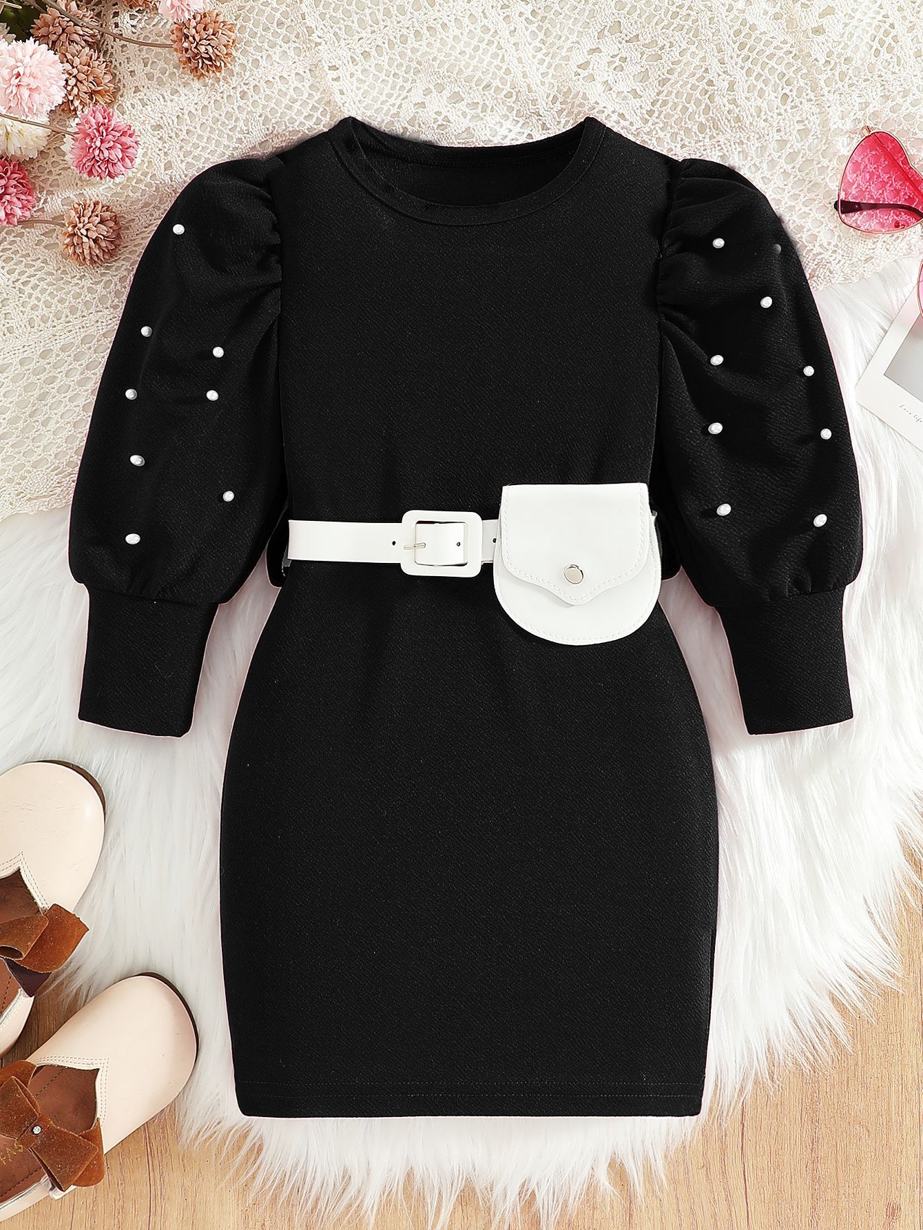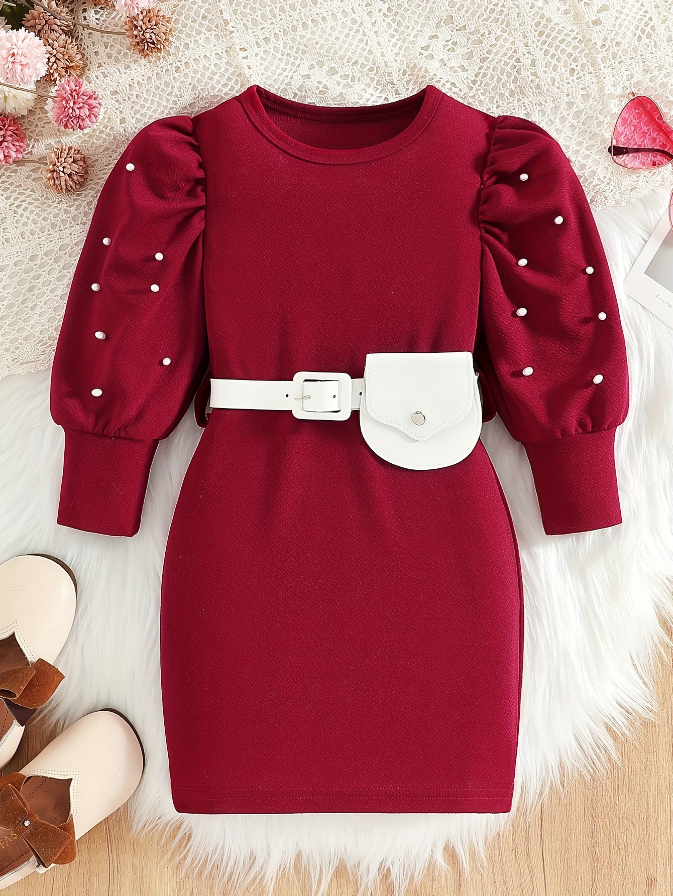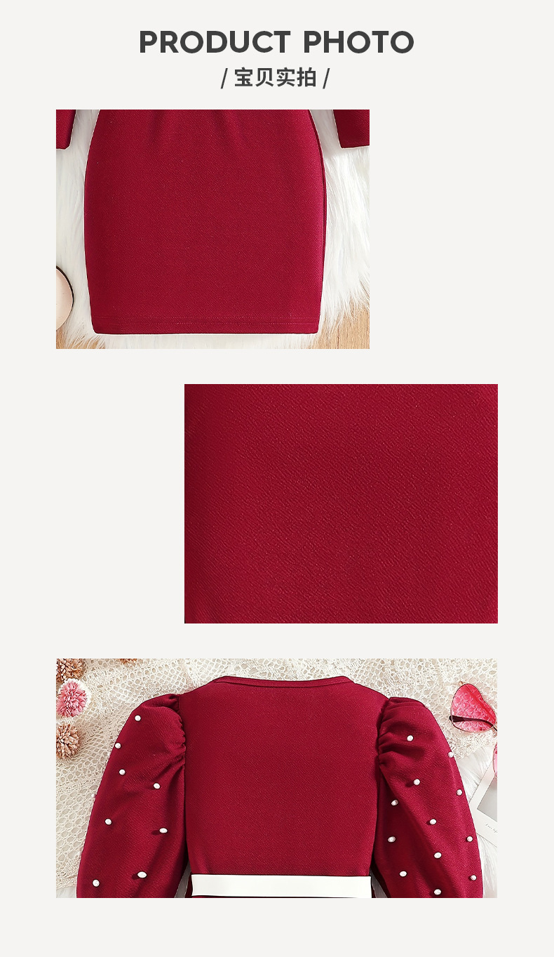 국경 간 레트로 소녀 원피스 붉은 둥근 목 랜턴 슬리브 벨트 포켓 진주 장식 가을과 겨울 어린이 치마