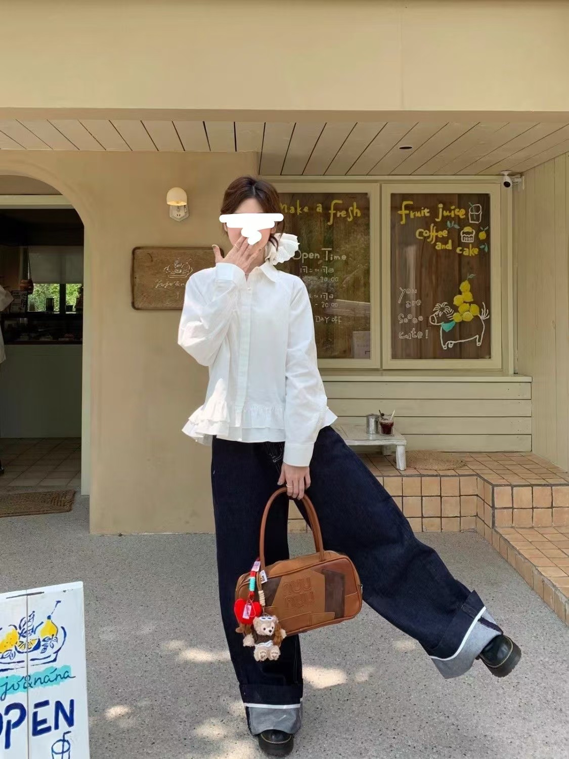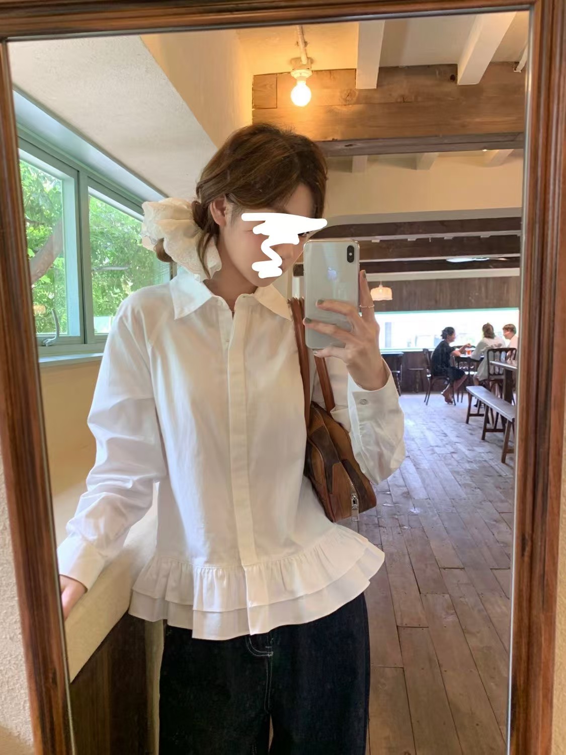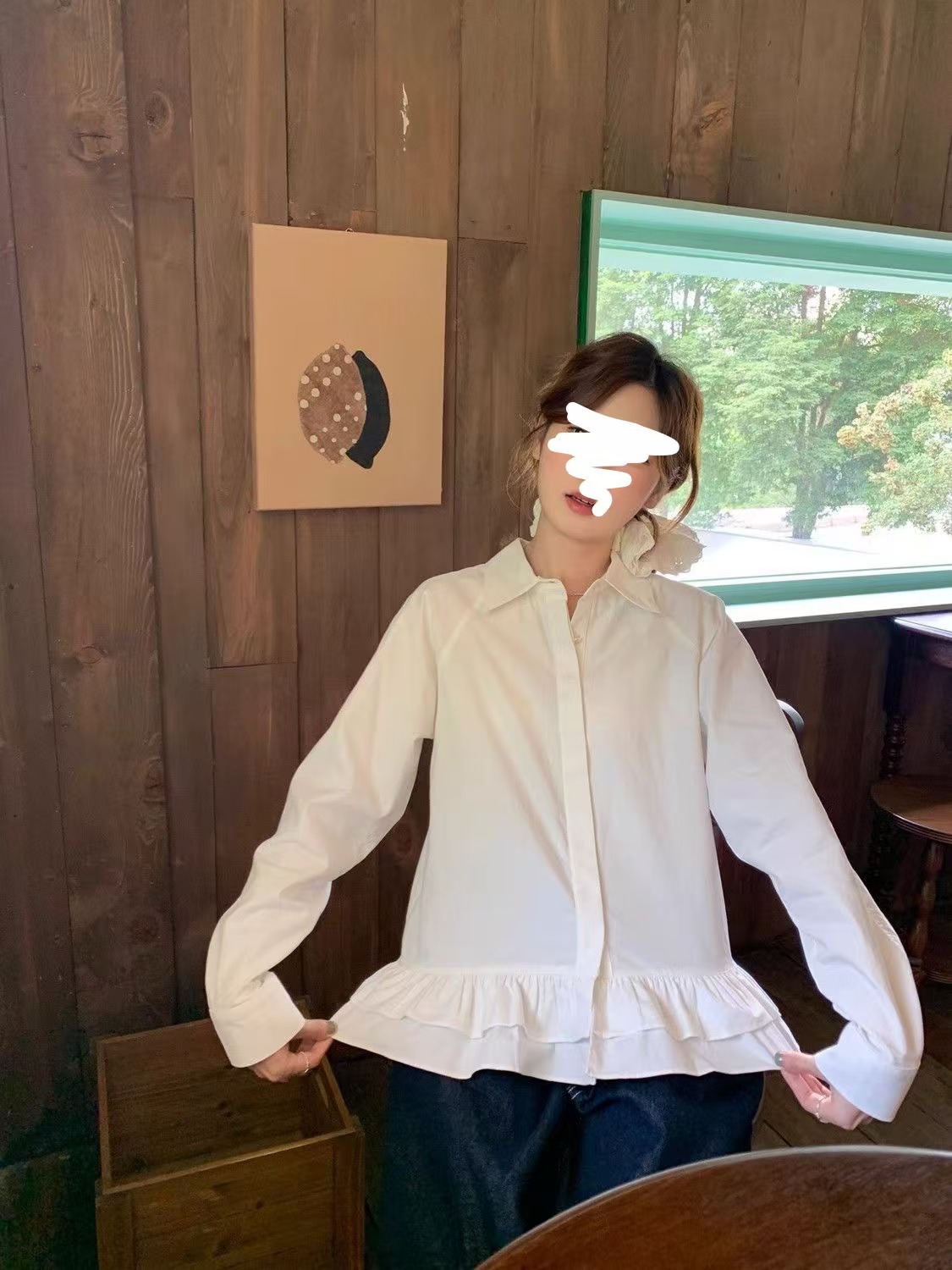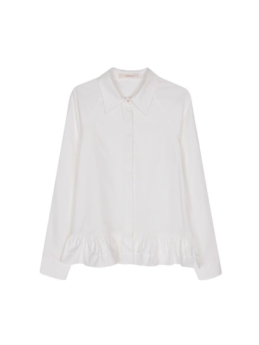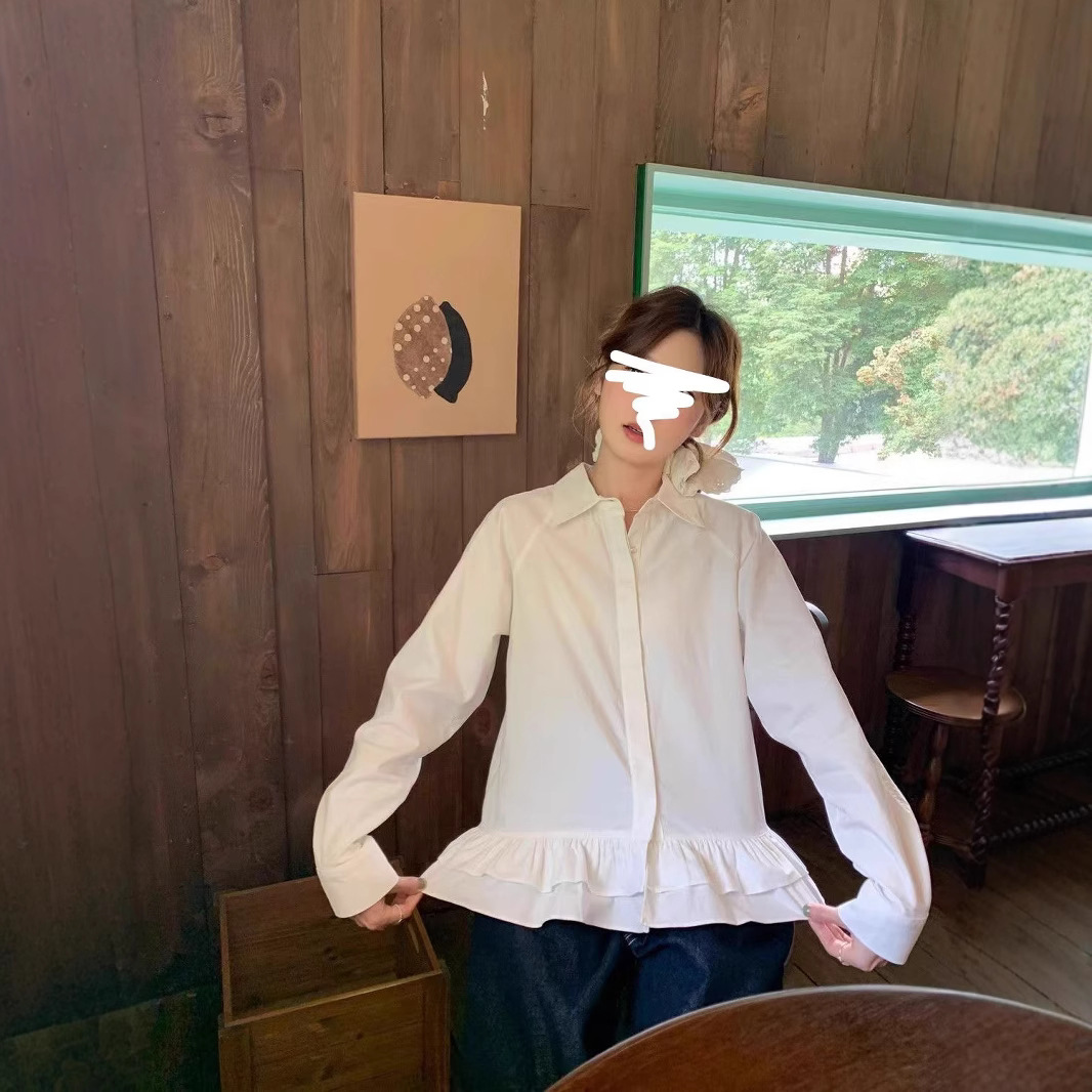 흰색 셔츠 여성 디자인 센스 러플 불규칙한 대학 스타일 셔츠 작은 우아한 스택 탑스토어 가기