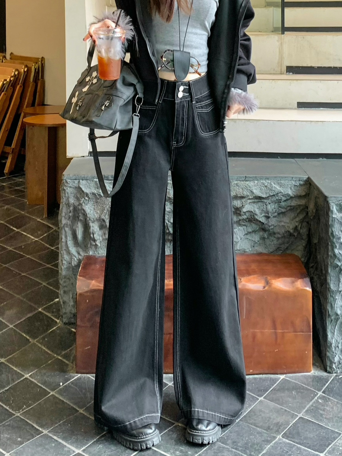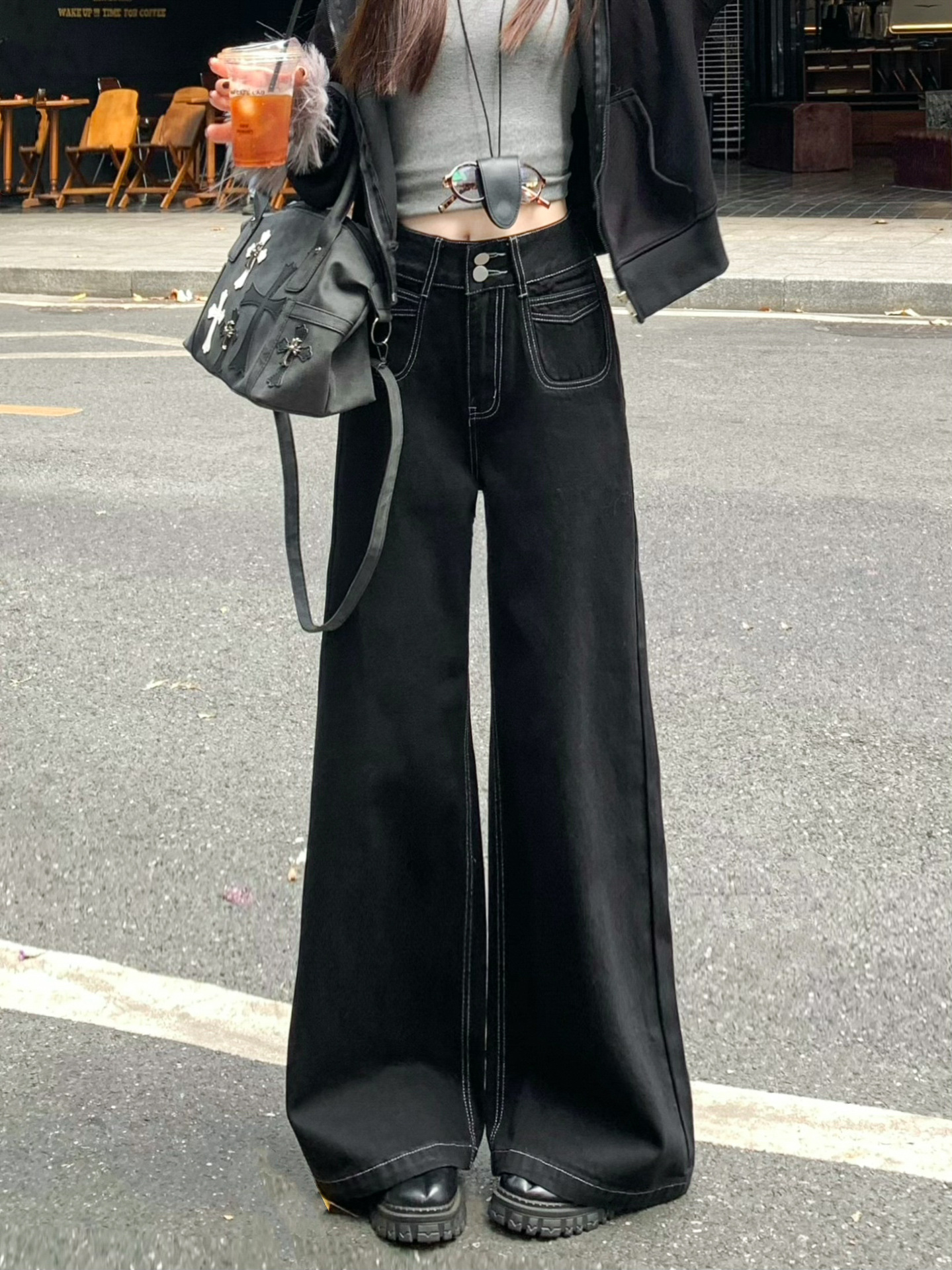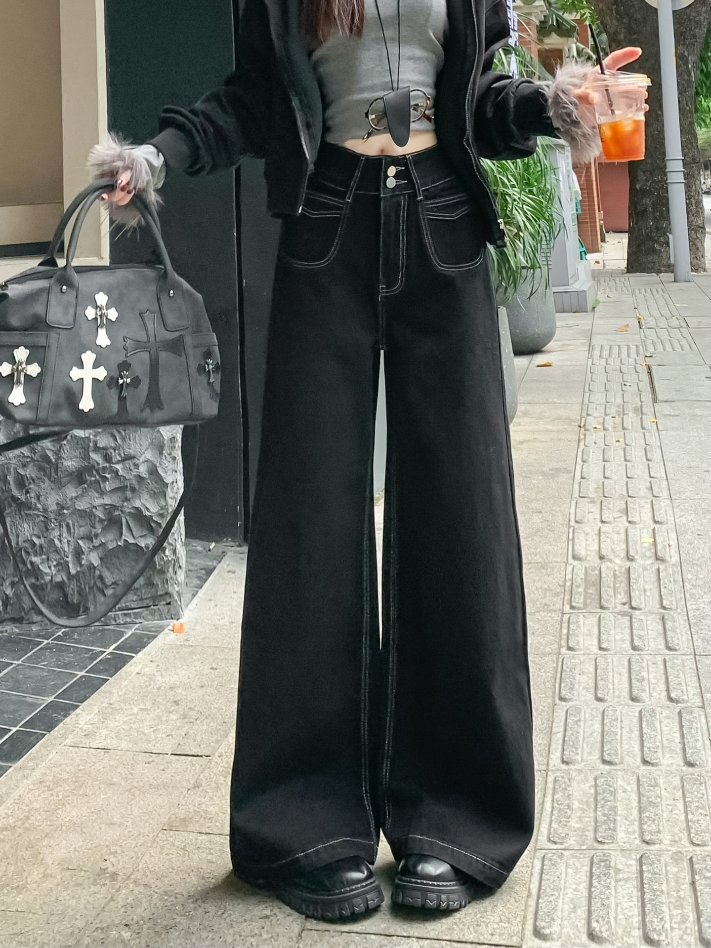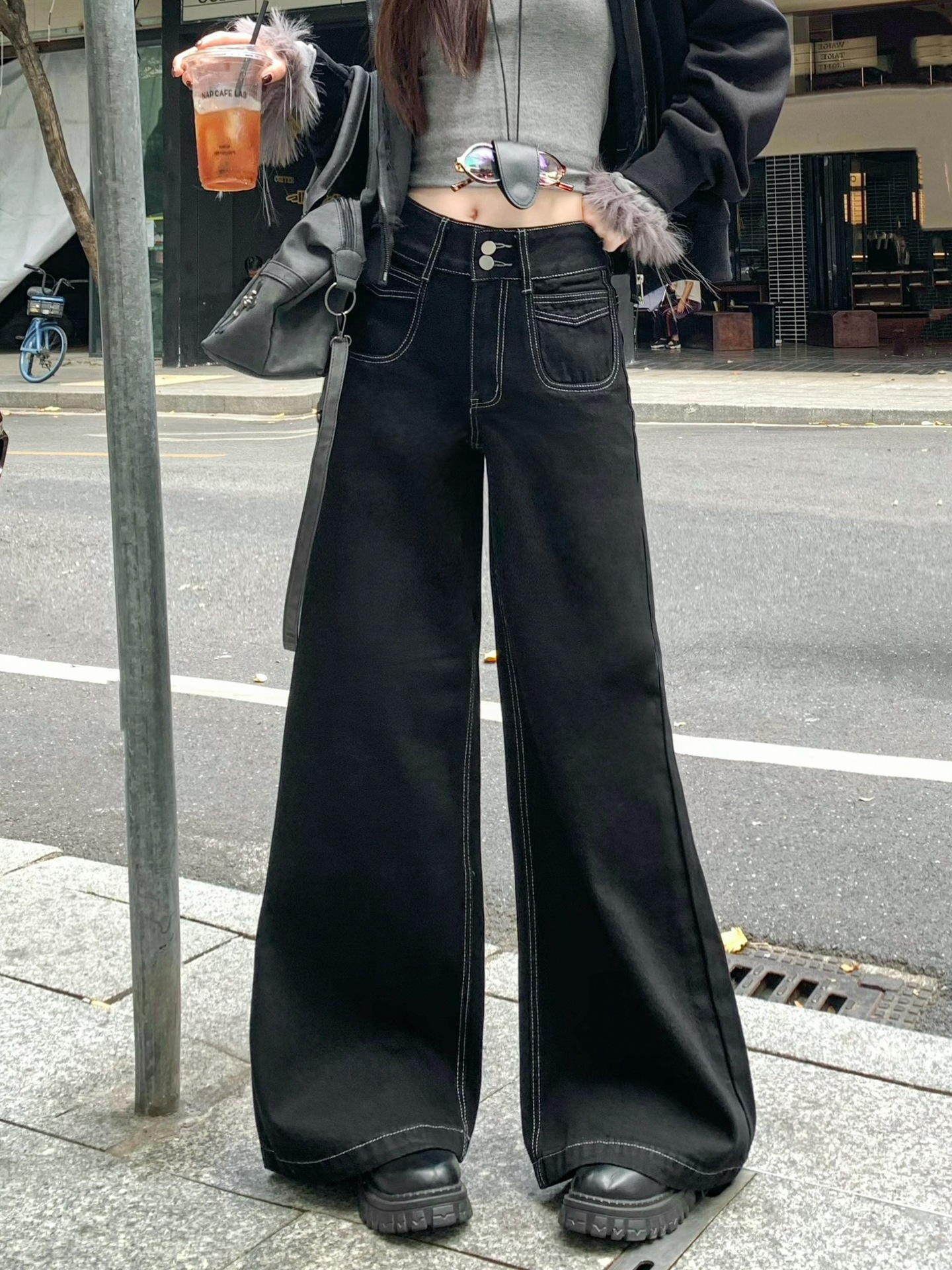 2025 새로운 블랙 더블 가슴 포켓 디자인 넓은 다리 청바지 여성의 봄 새로운 높은 허리 느슨한 걸레 바지스토어 가기
