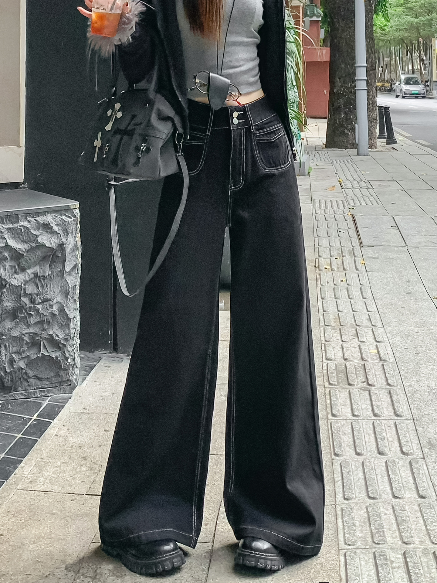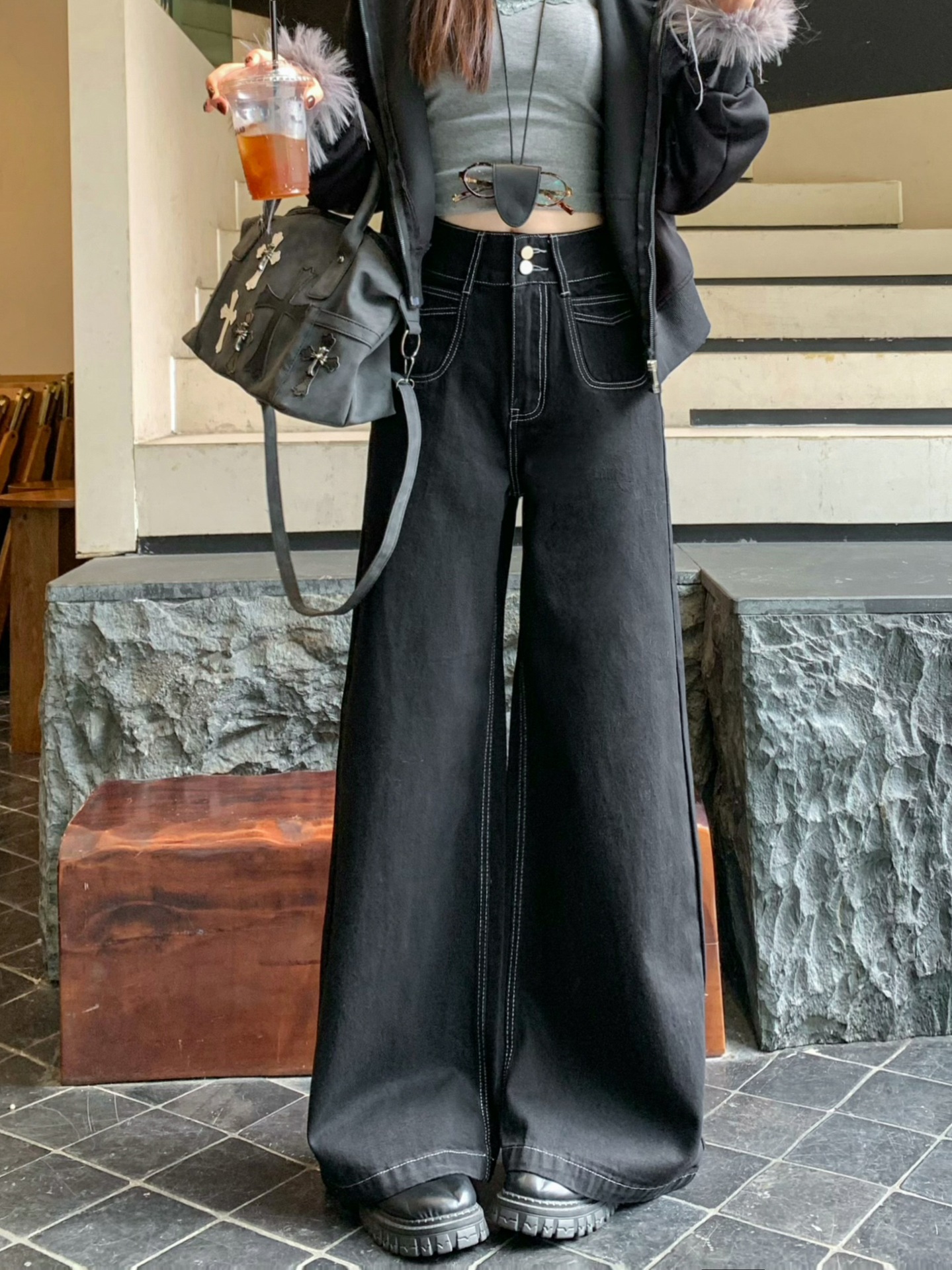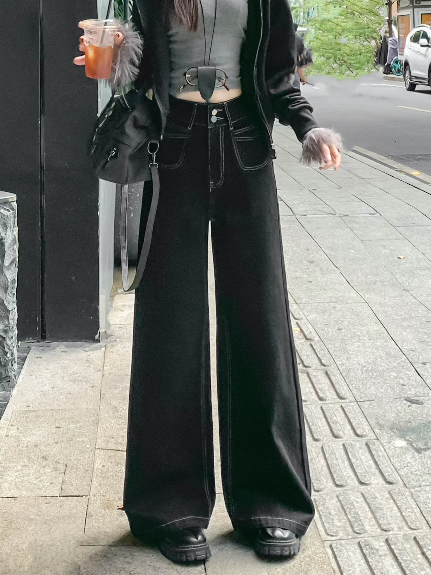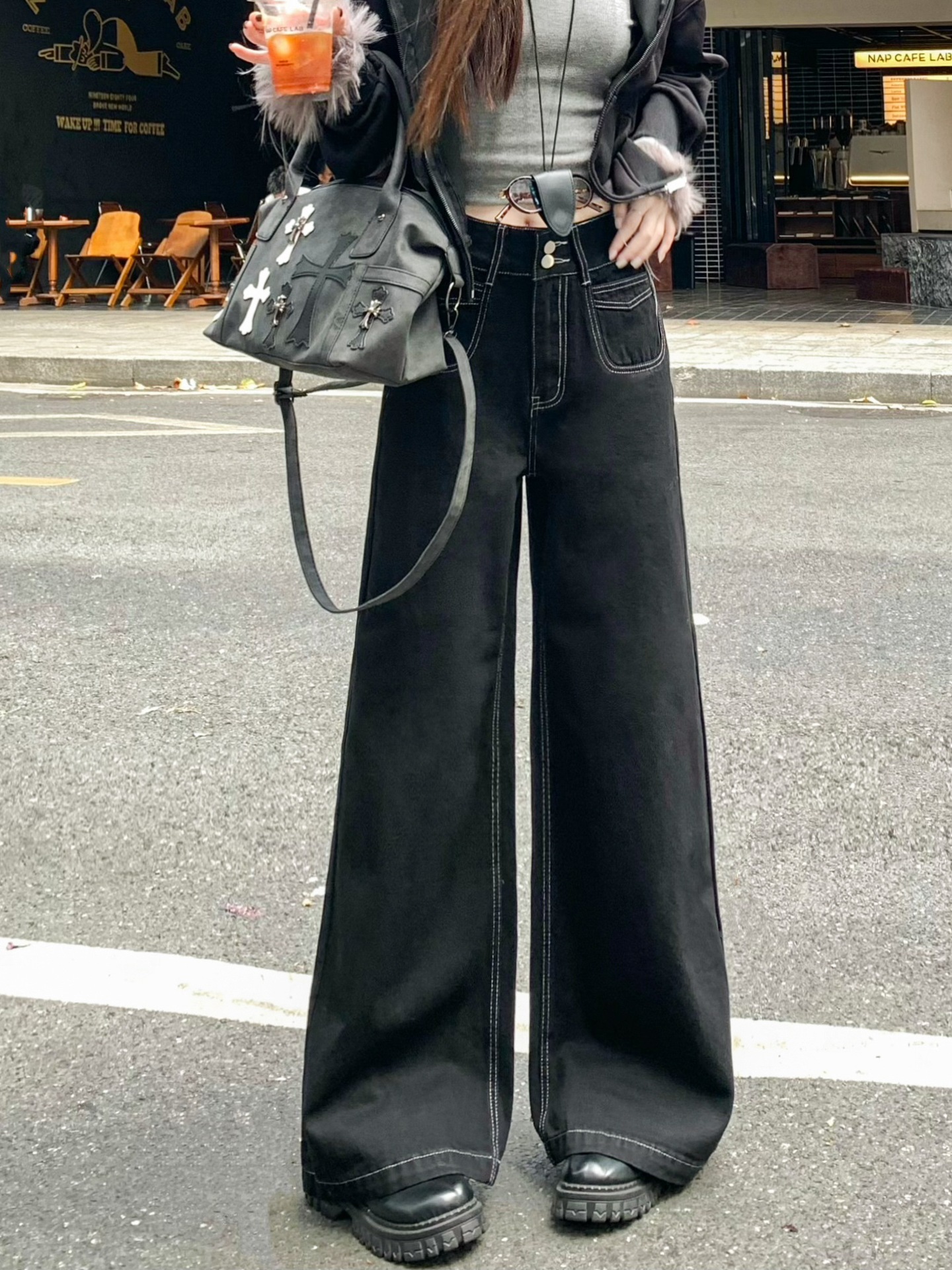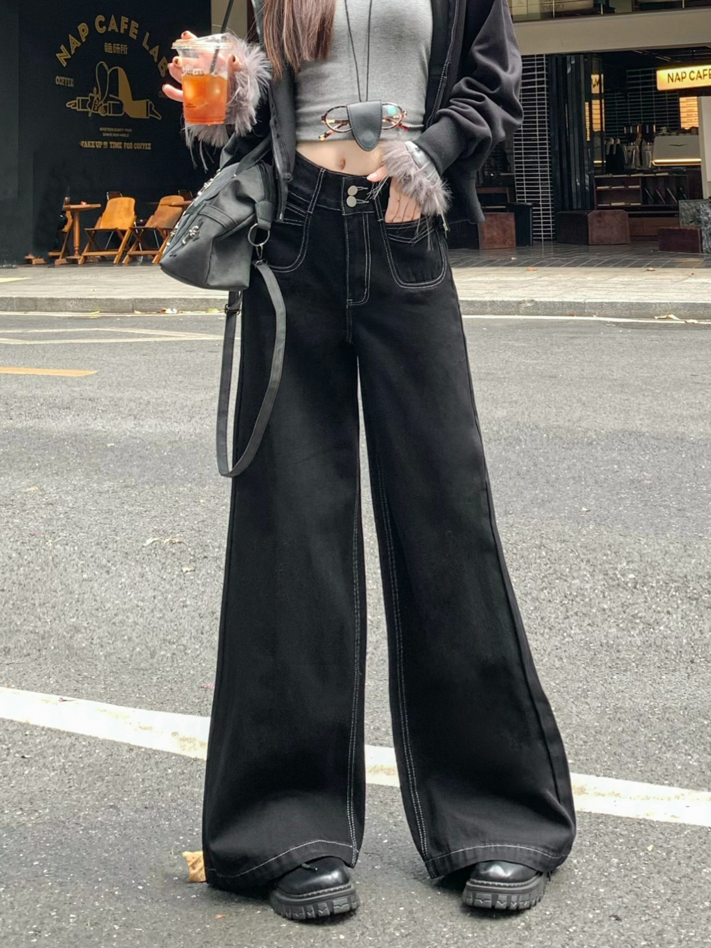 2025 새로운 블랙 더블 가슴 포켓 디자인 넓은 다리 청바지 여성의 봄 새로운 높은 허리 느슨한 걸레 바지스토어 가기