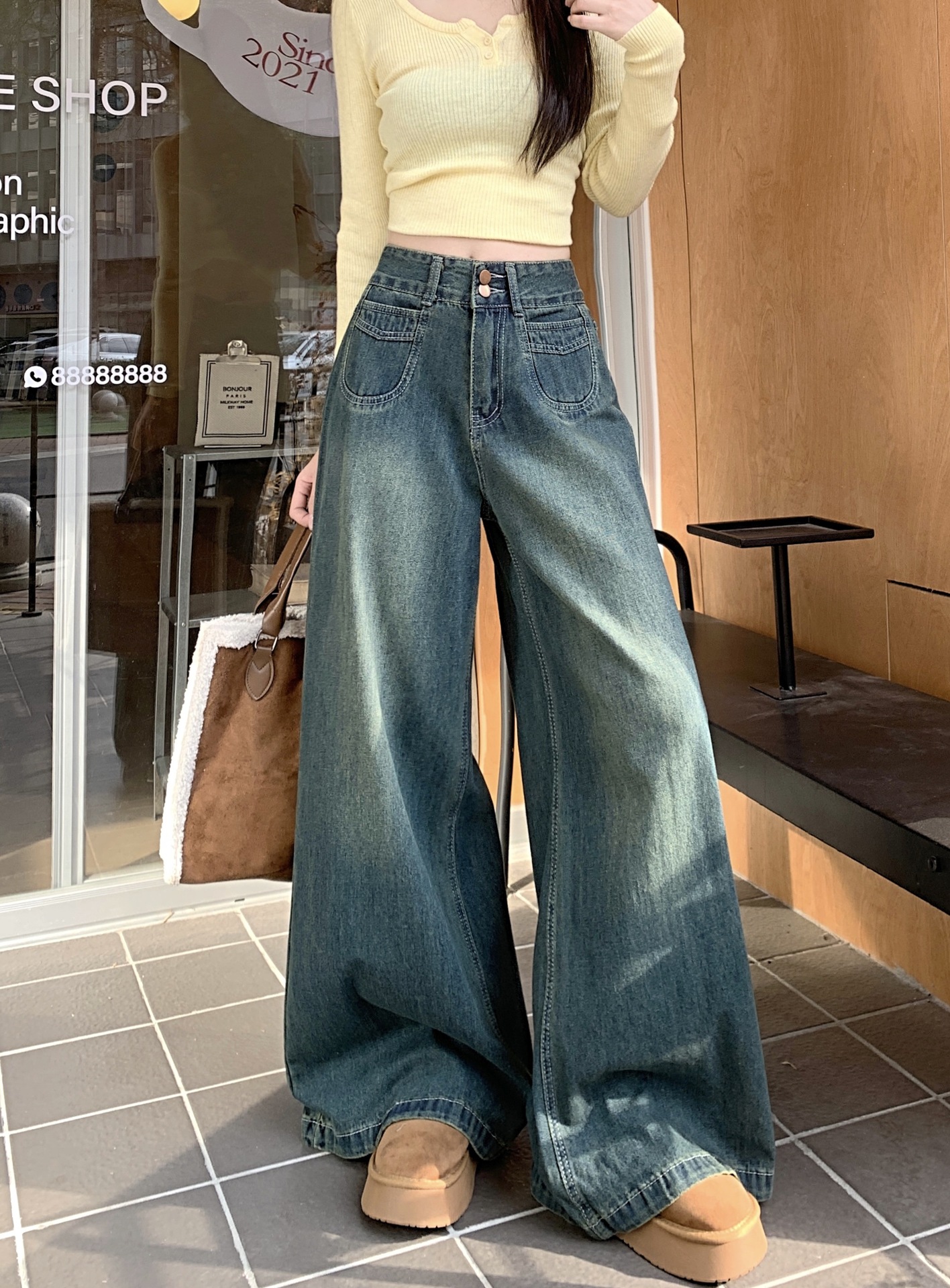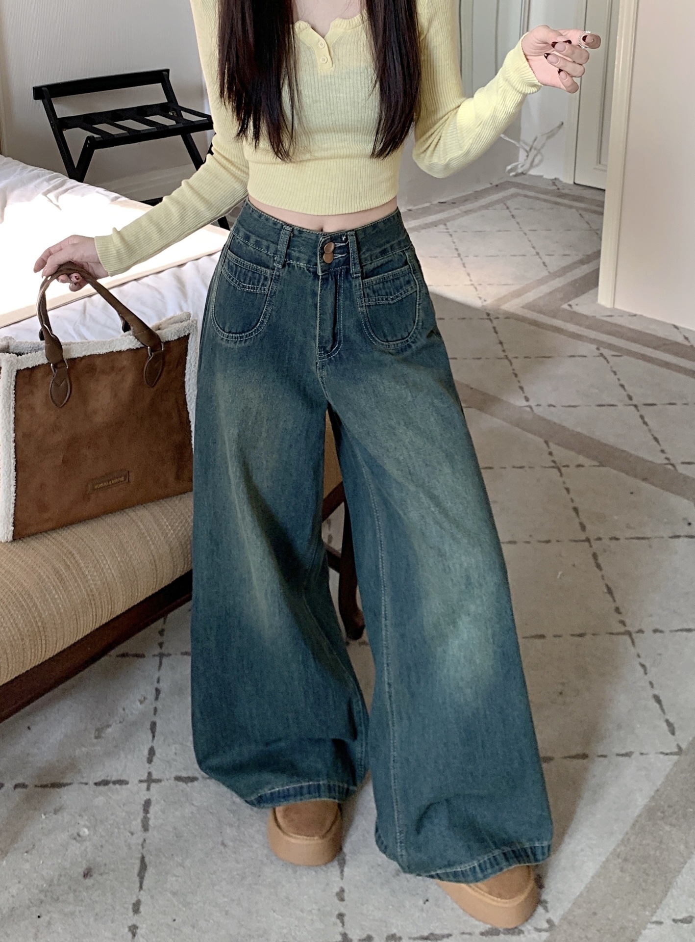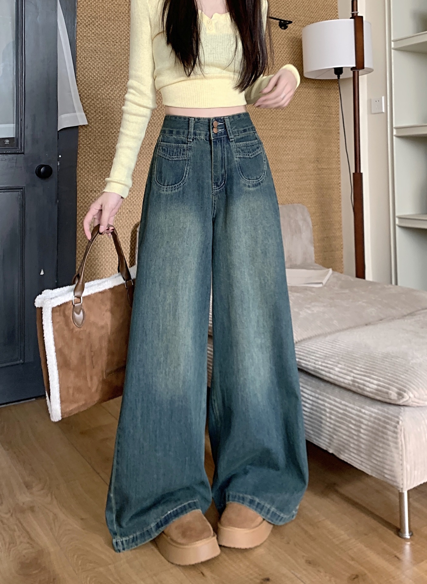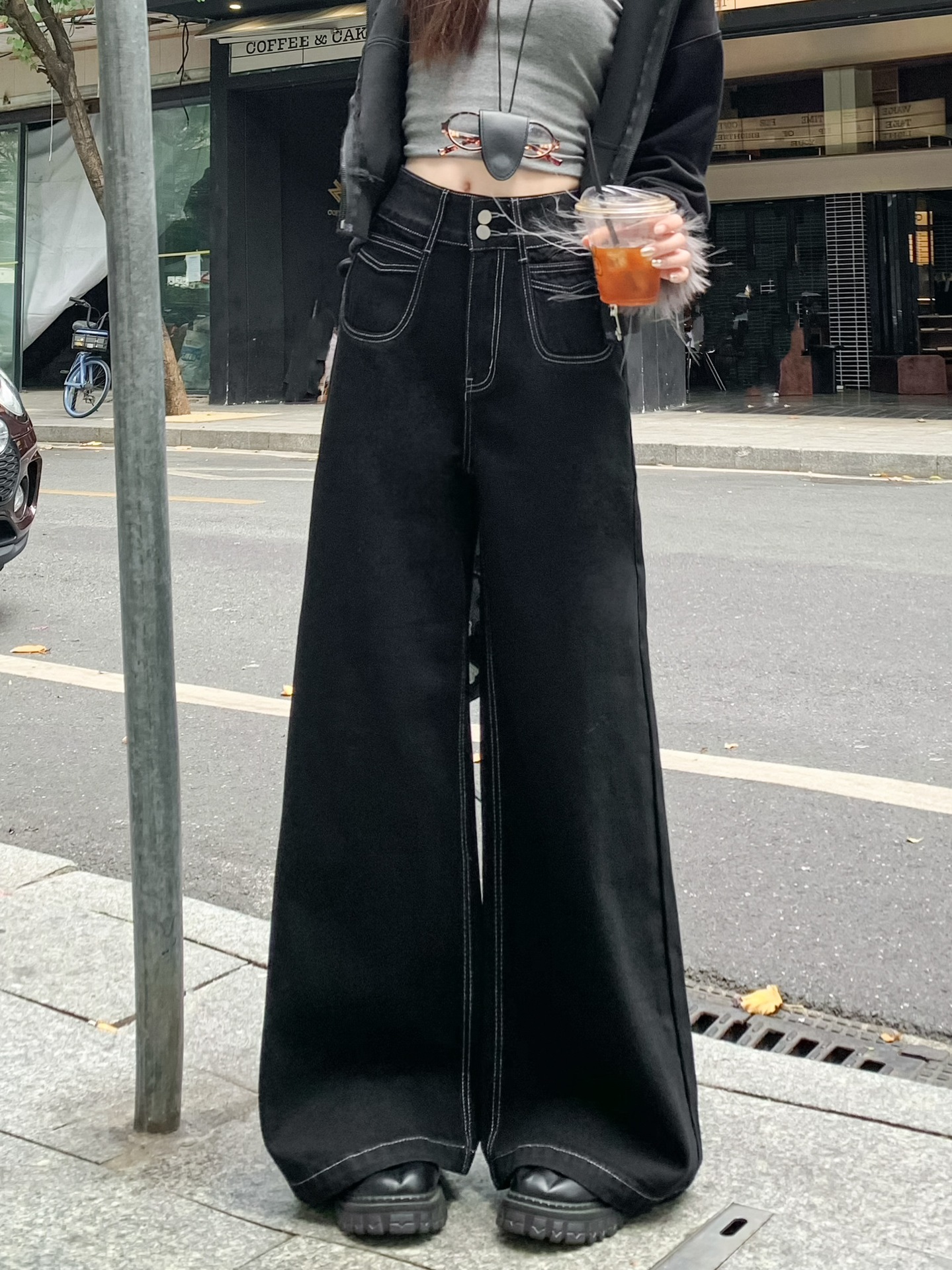 2025 새로운 블랙 더블 가슴 포켓 디자인 넓은 다리 청바지 여성의 봄 새로운 높은 허리 느슨한 걸레 바지스토어 가기