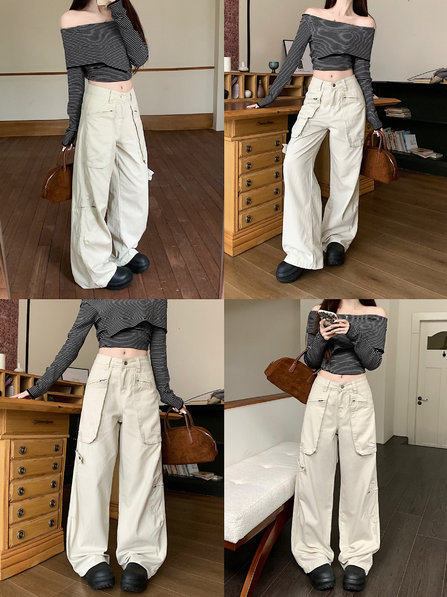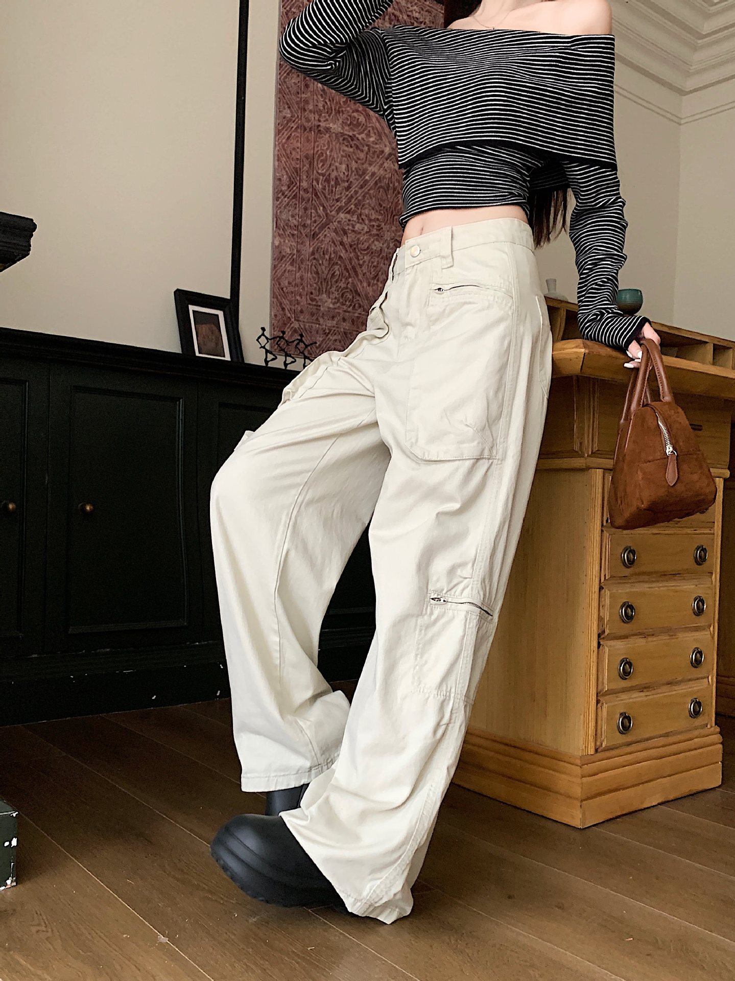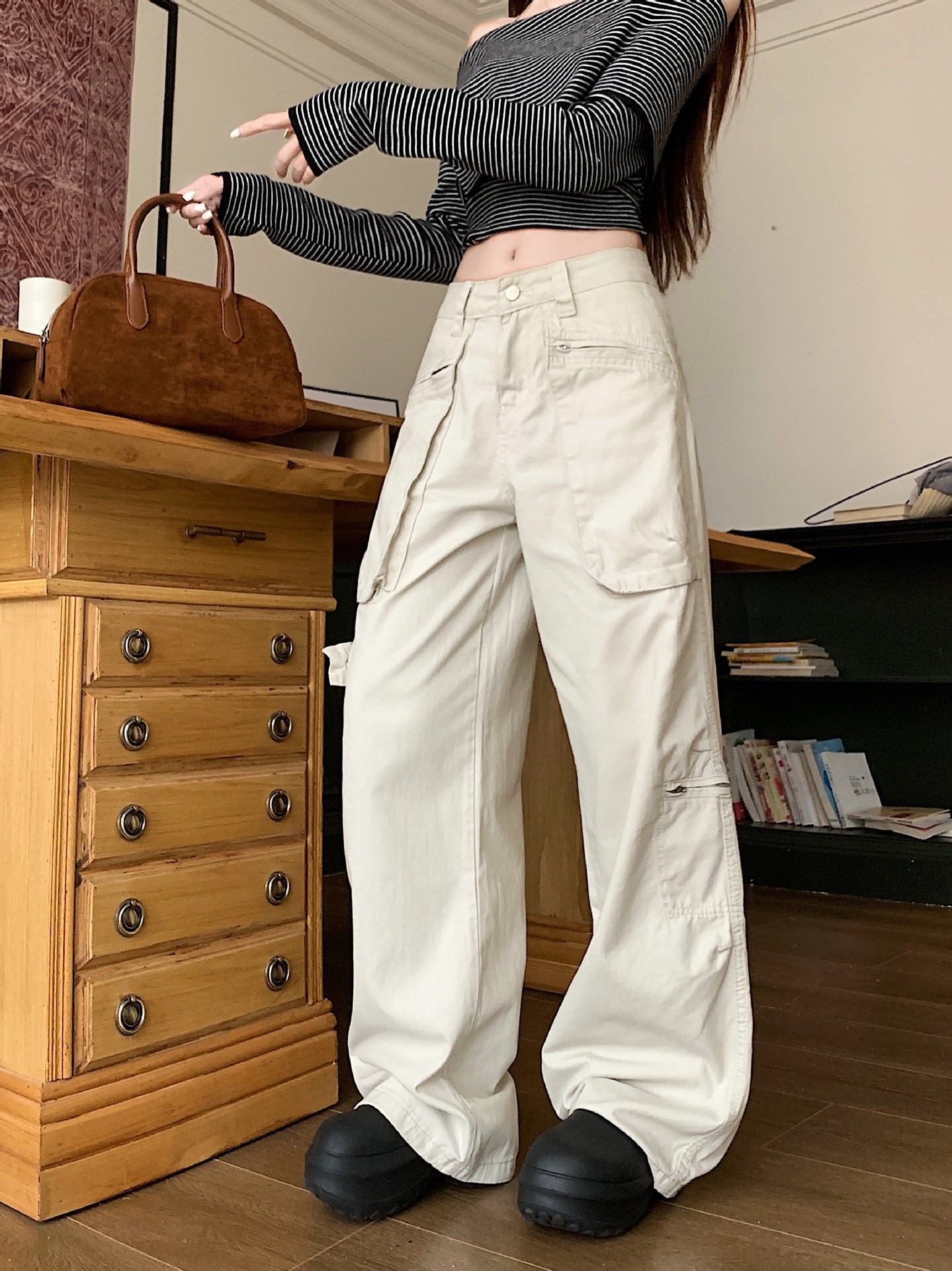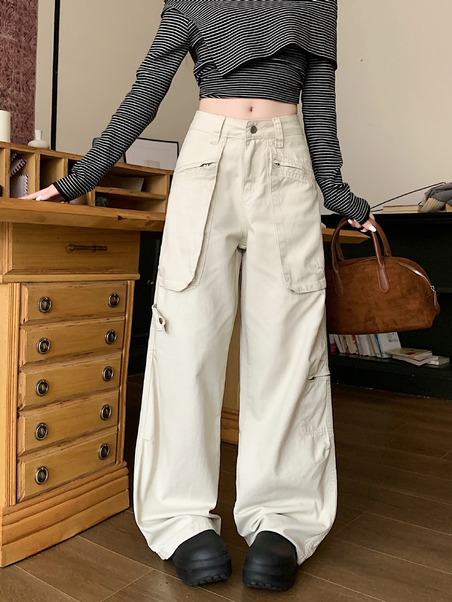 이른 봄 새로운 미국 스타일 레트로 아이보리 멀티 포켓 크레인 바지 여성의 새로운 거리 느슨한 주름 바지스토어 가기