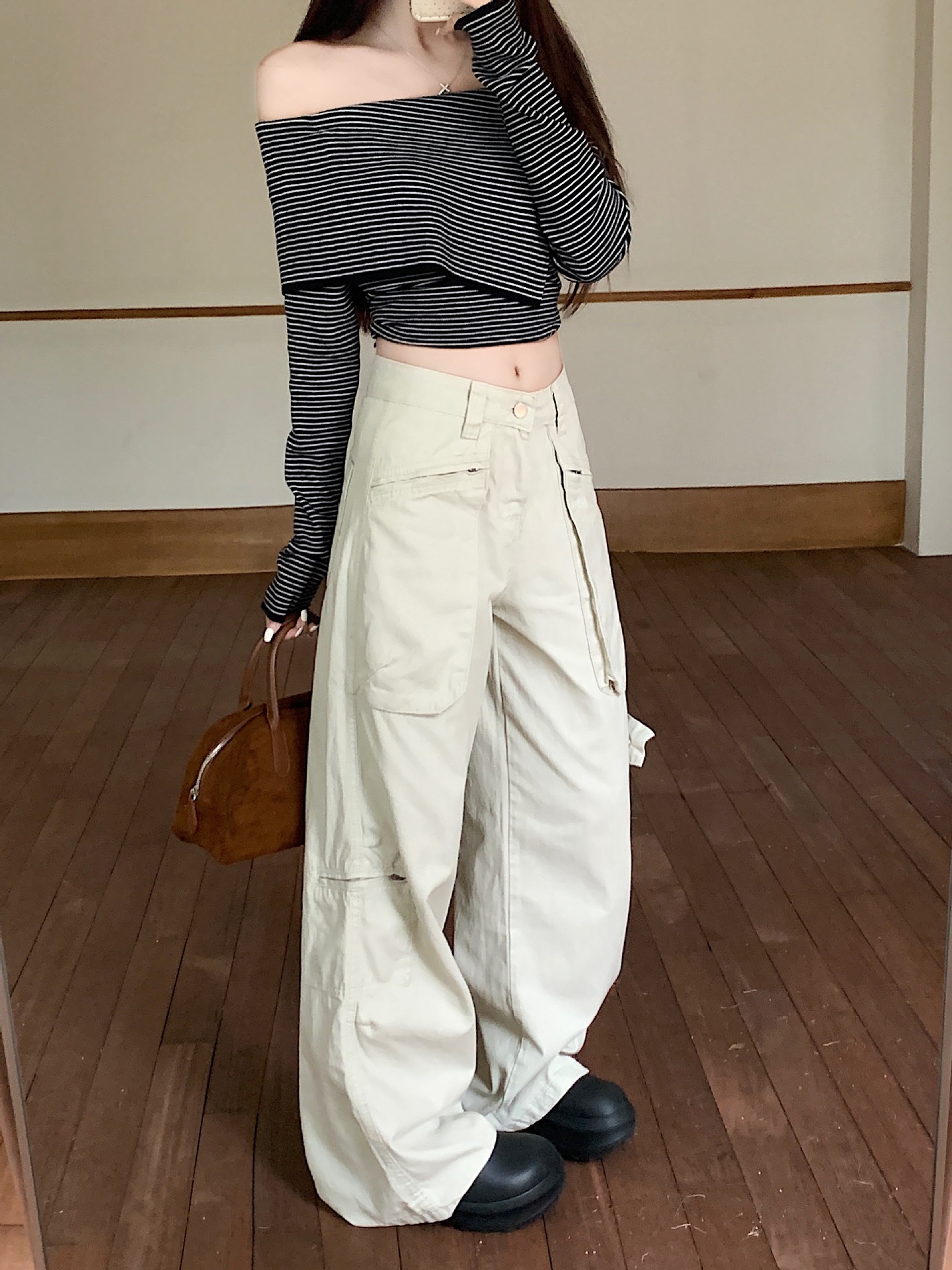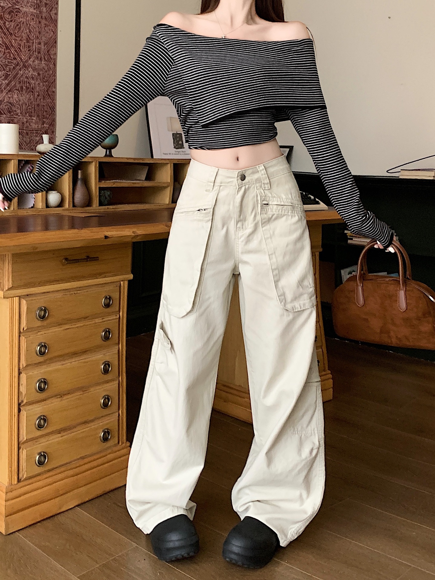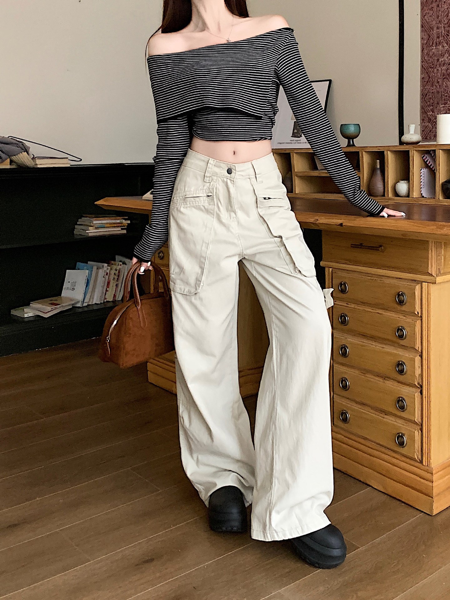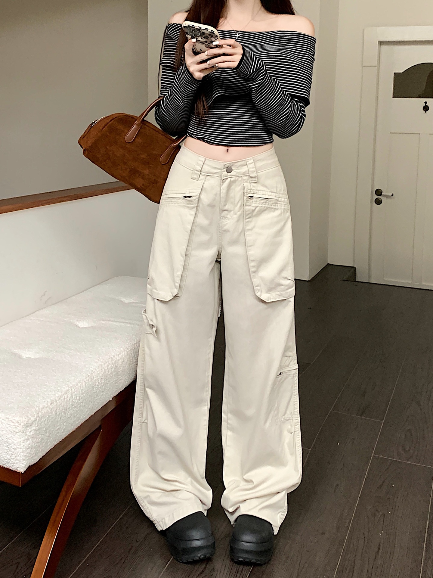 이른 봄 새로운 미국 스타일 레트로 아이보리 멀티 포켓 크레인 바지 여성의 새로운 거리 느슨한 주름 바지스토어 가기