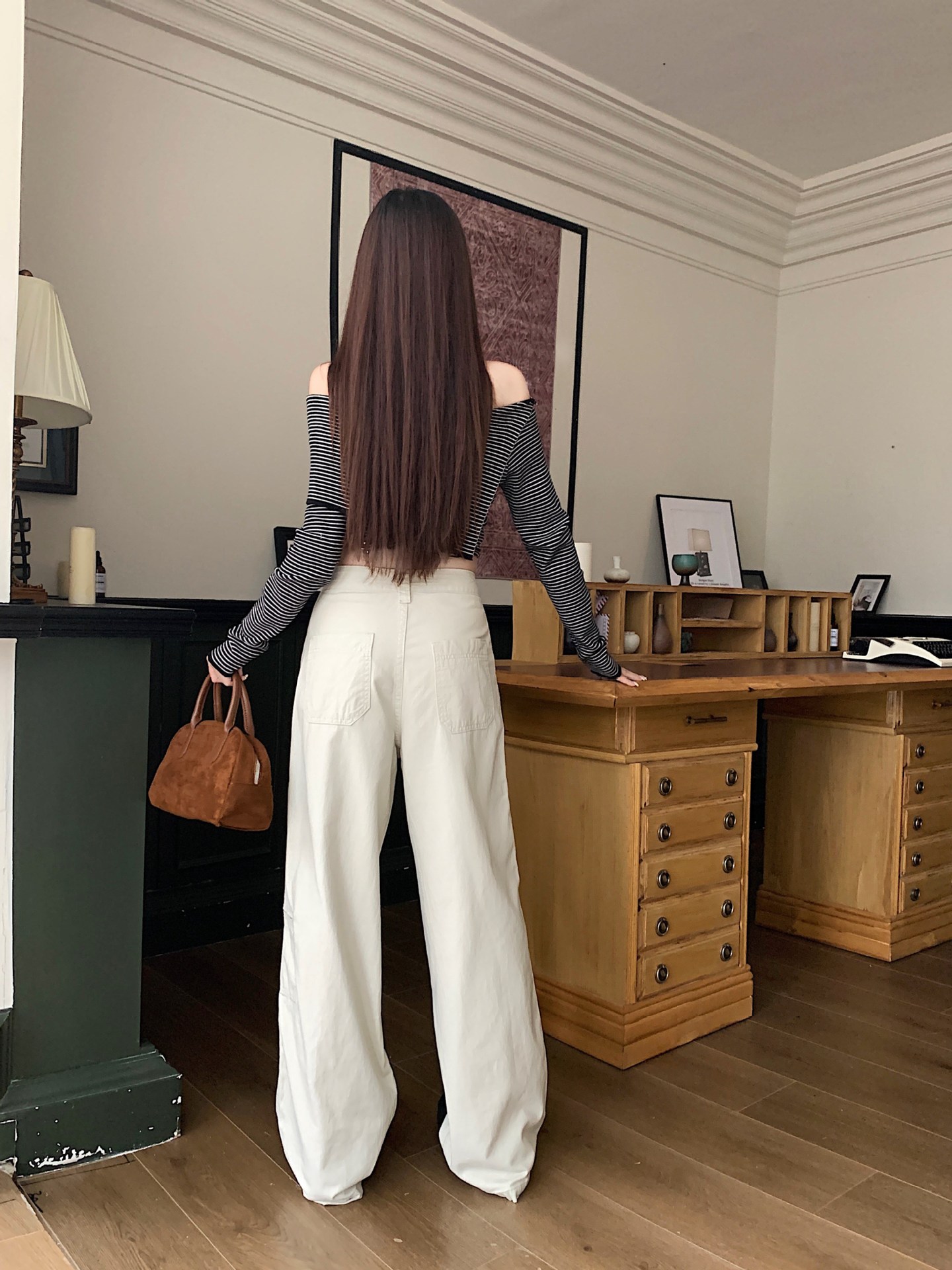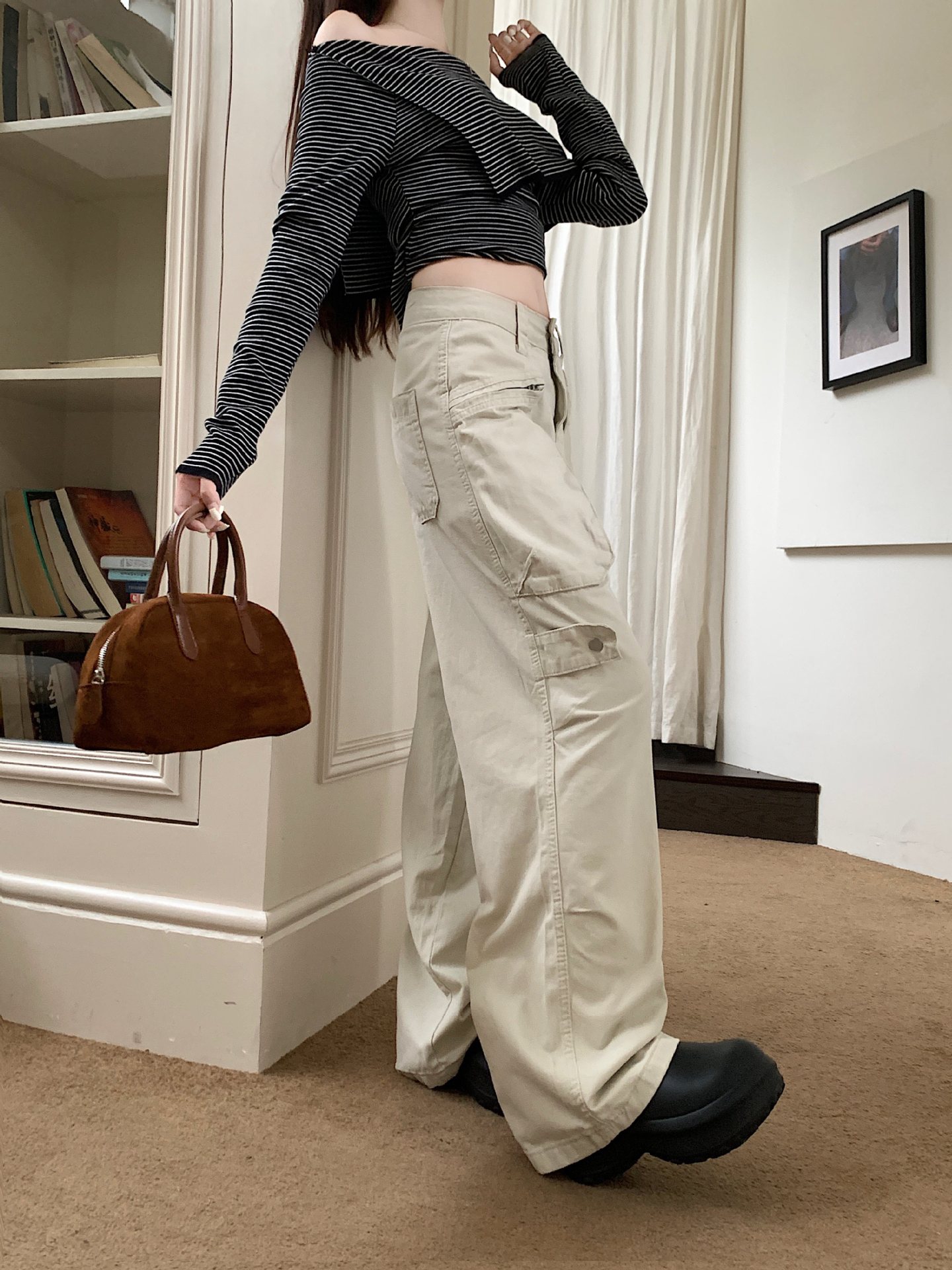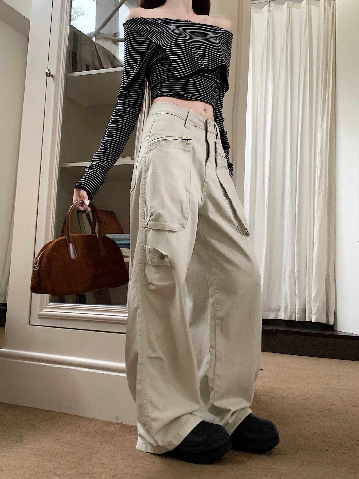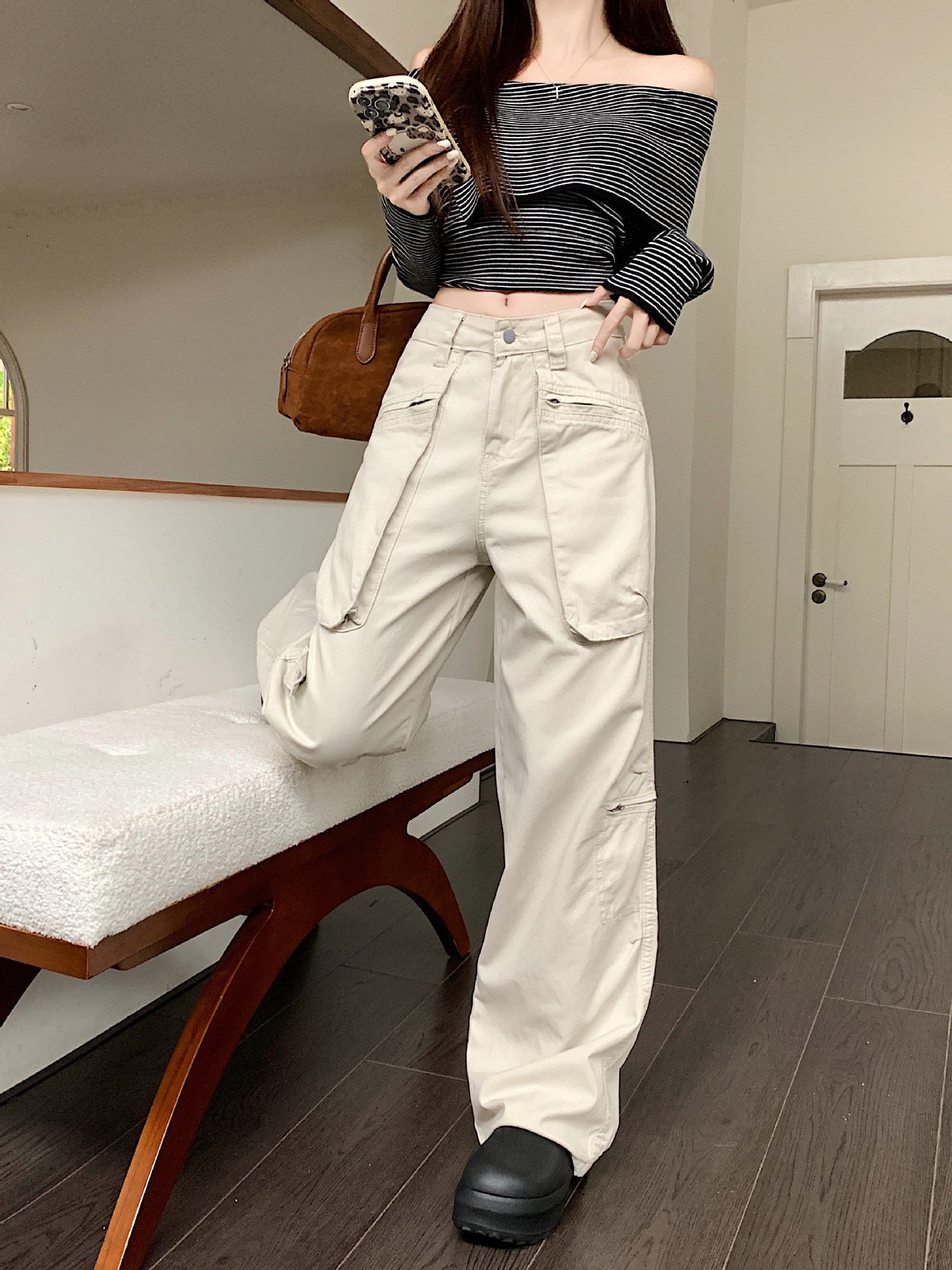 이른 봄 새로운 미국 스타일 레트로 아이보리 멀티 포켓 크레인 바지 여성의 새로운 거리 느슨한 주름 바지스토어 가기