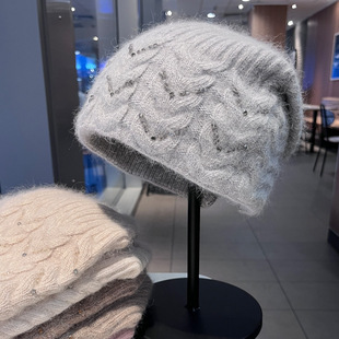 细纹兔毛套头帽安哥拉长兔毛水钻刺绣帽子双层保暖后开叉兔绒帽子 RMB:37.00