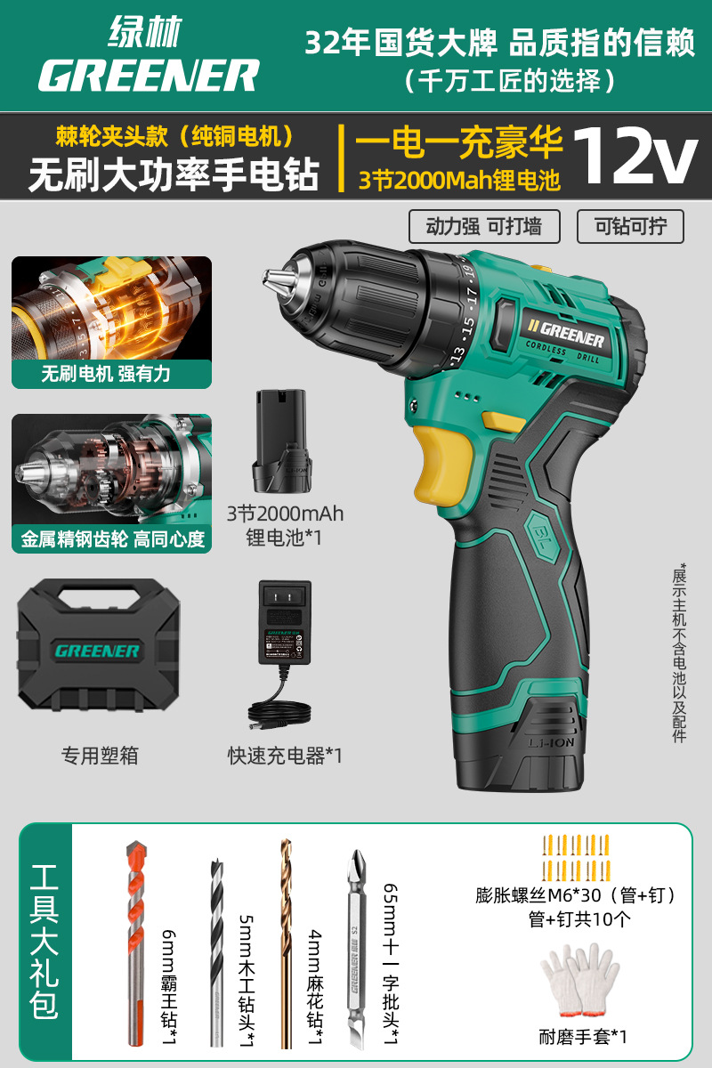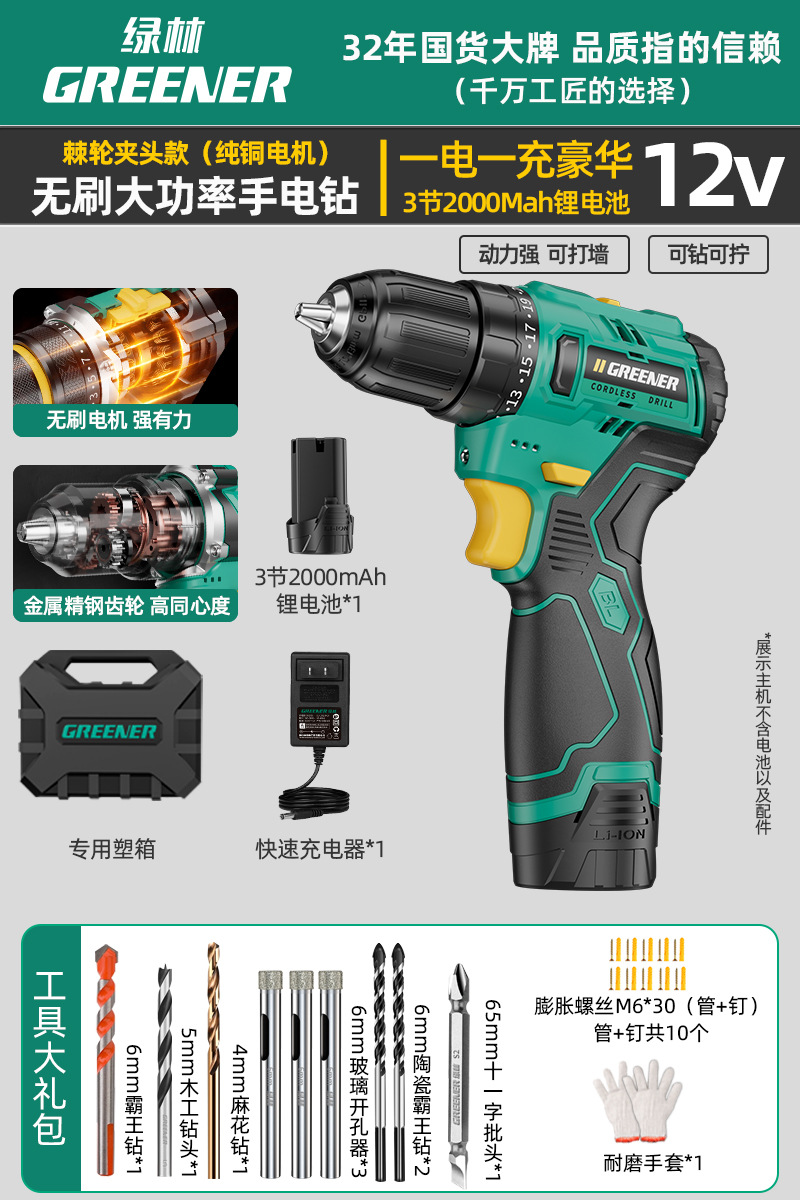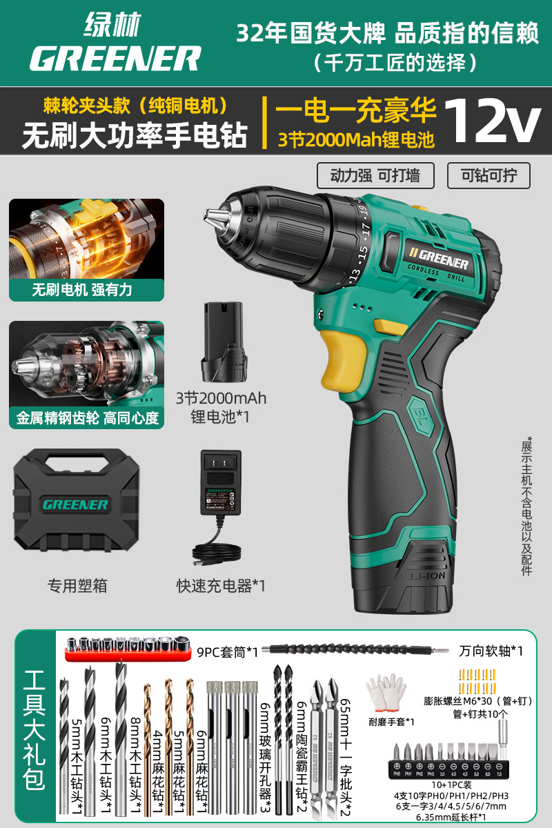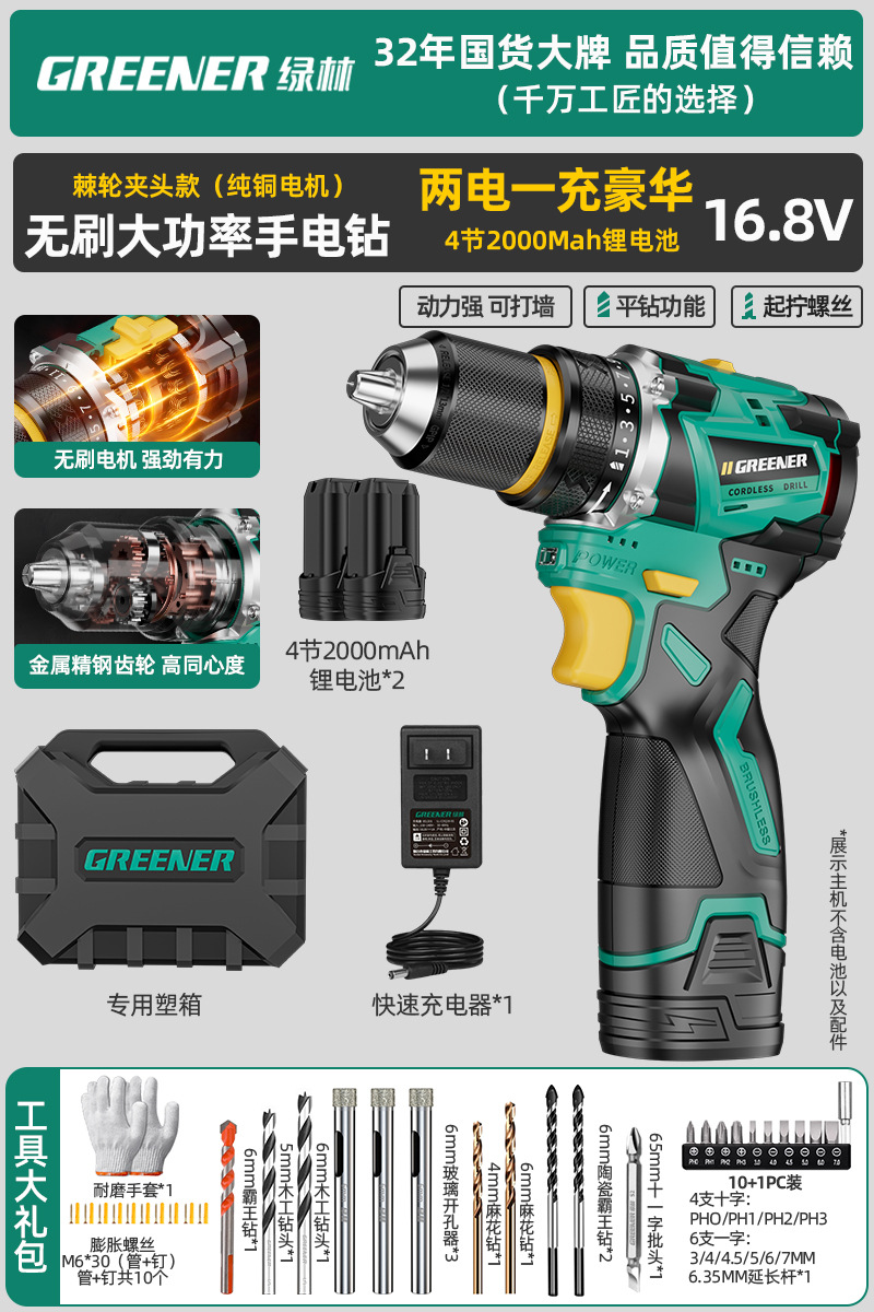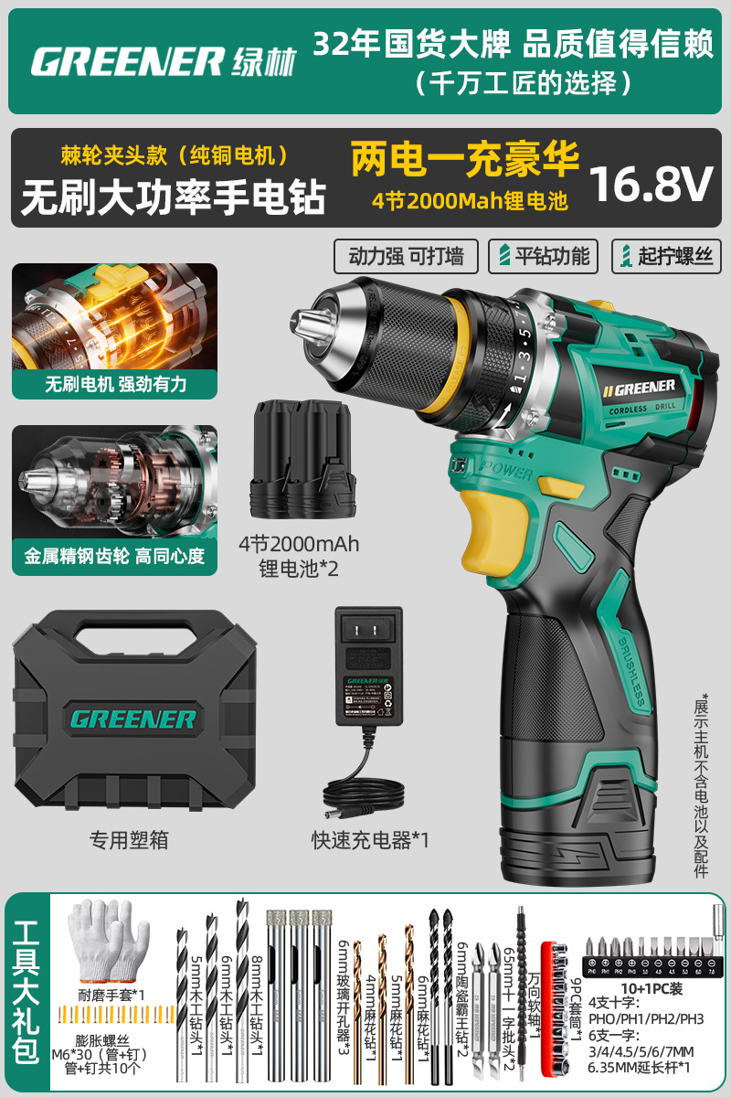 • 녹색 숲 작은 강철 대포 전기 드릴 충격 브러시리스 핸드 전기 드릴 가정용 권총 드릴 충전식 리튬 전기 드릴 다기능 벽 구멍