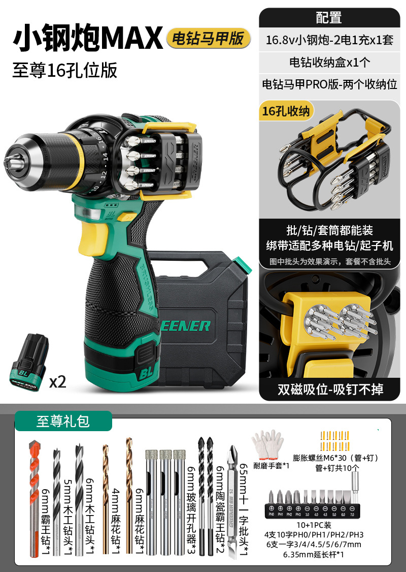 • 드릴 선물 팩 [배터리 2개 및 충전 1개] 16.8v 브러시리스 임팩트 소형 강철 대포