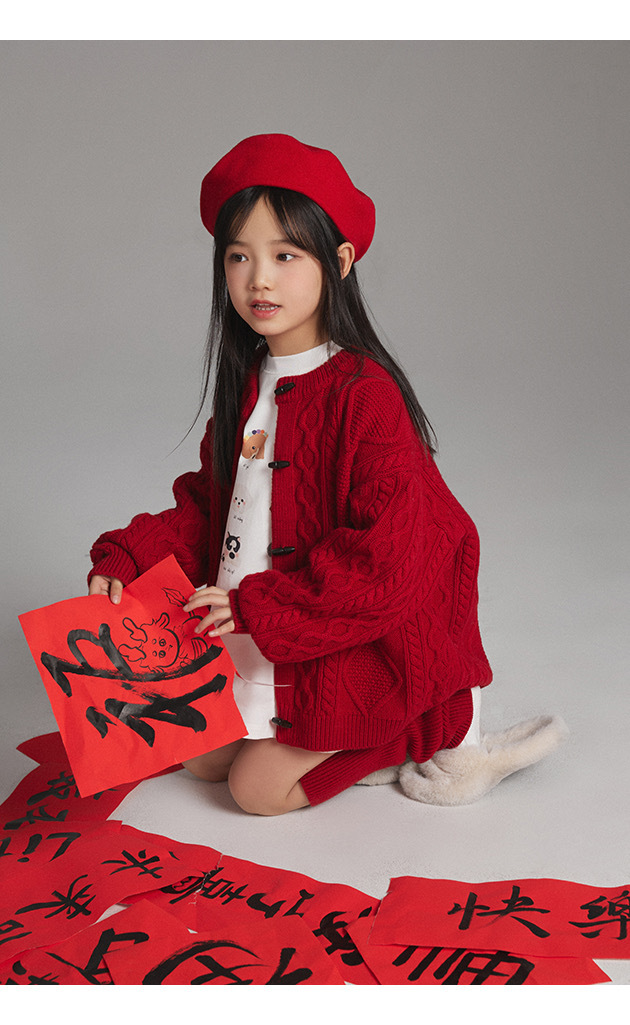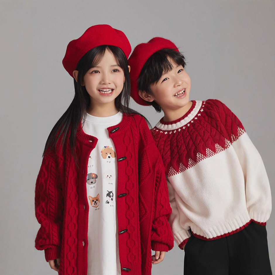 형제와 자매 스웨터 2025 새로운 가을, 겨울 소년과 소녀를위한 니트 스웨터 다목적 새해 옷 형제와 자매 빨간색 라운드 넥 새해 옷