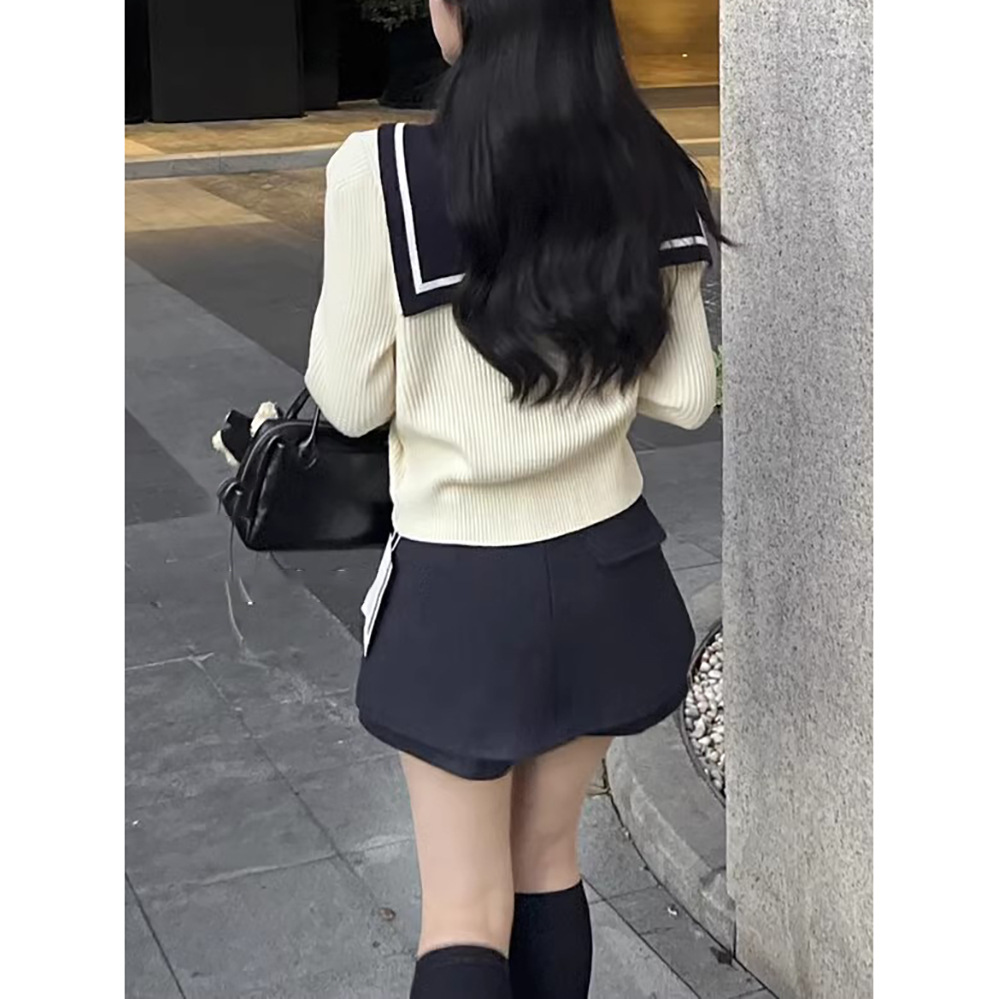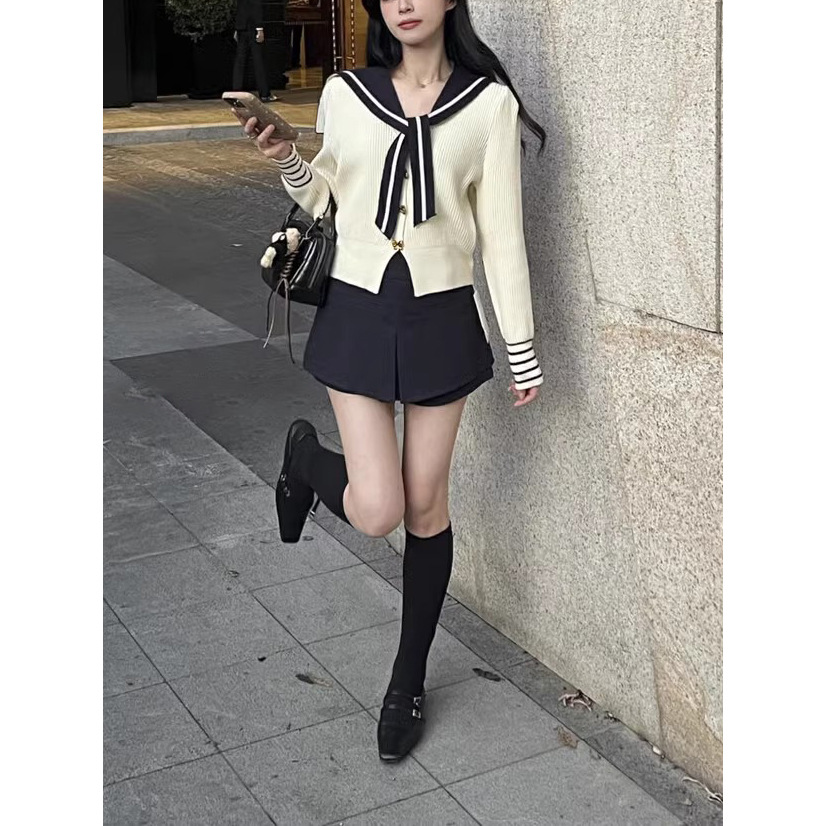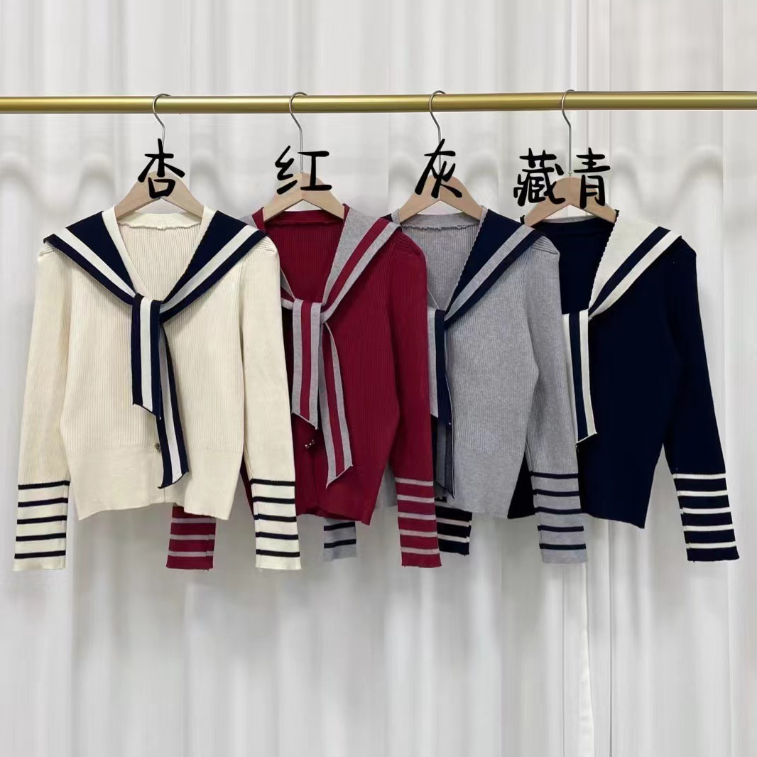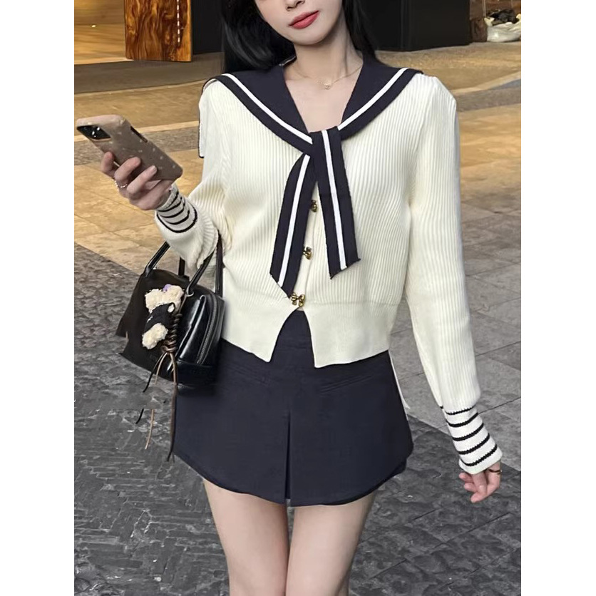 한국 스타일 대학 스타일 줄무늬 니트 카디건 여성의 가을과 겨울 대비 컬러 해군 칼라 디자인 긴 소매 탑 2024스토어 가기