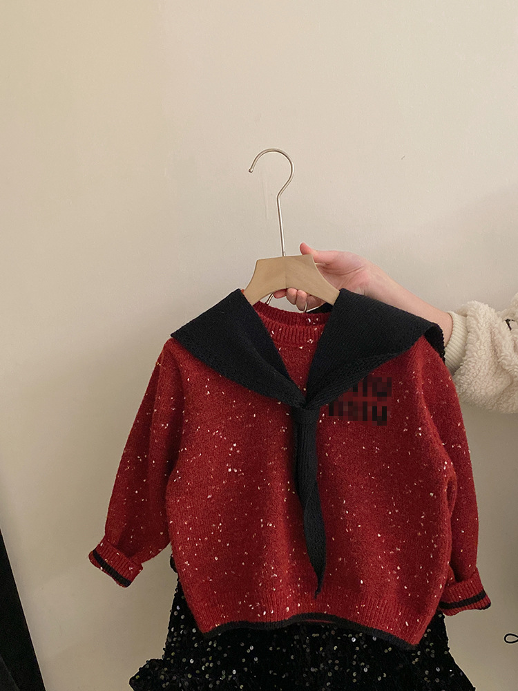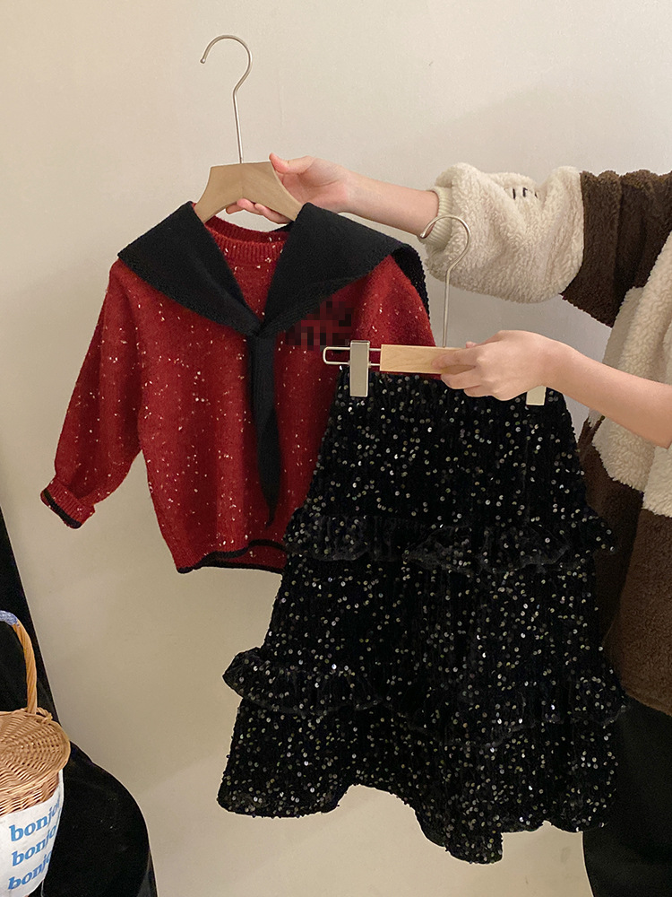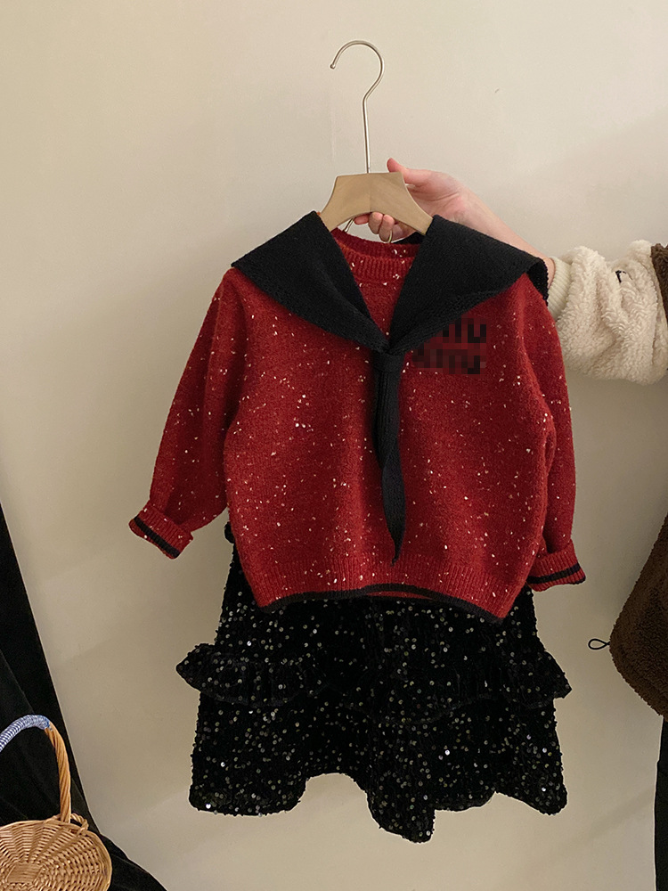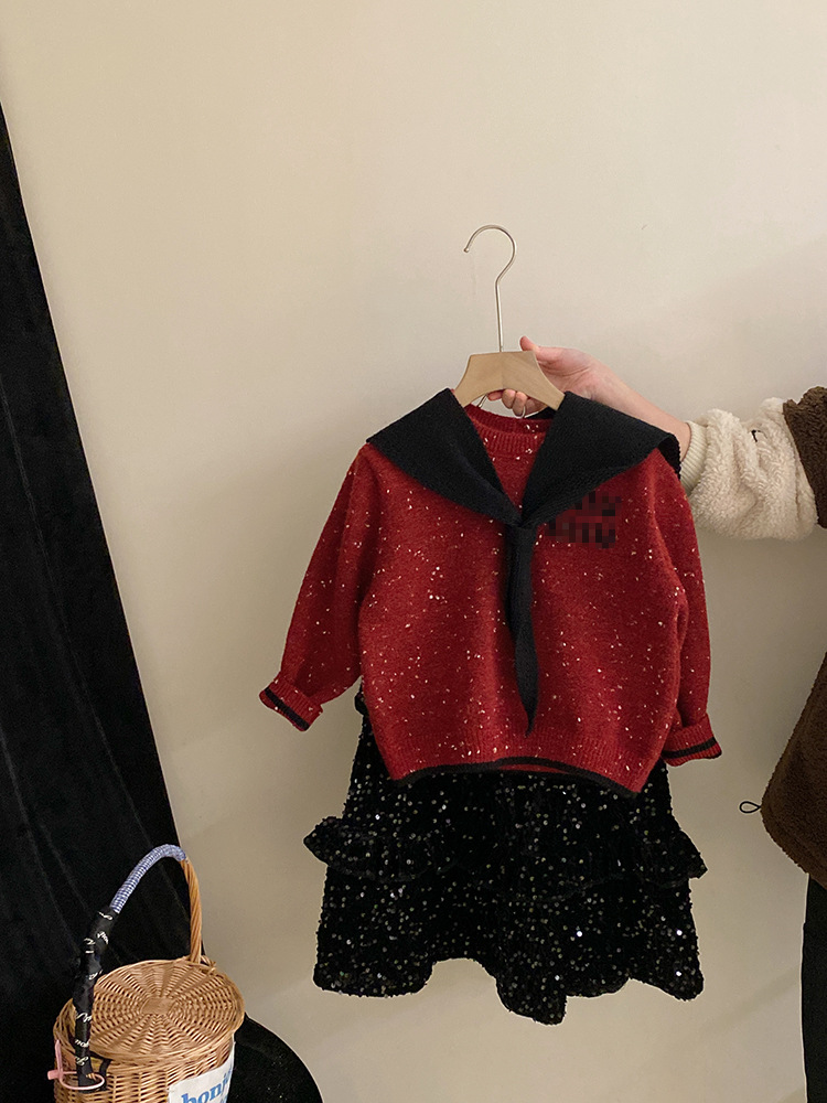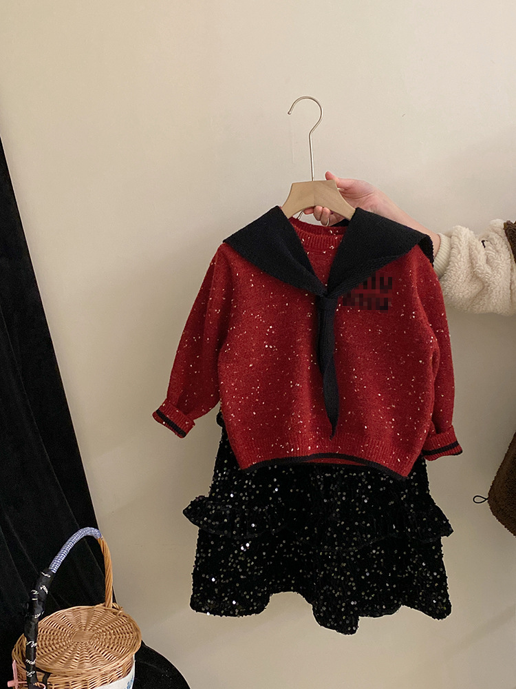여자 우아한 기모 스퀸 스커트 2024 가을과 겨울 착용 분리형 네이비 넥 컬러 도트 레터 세트