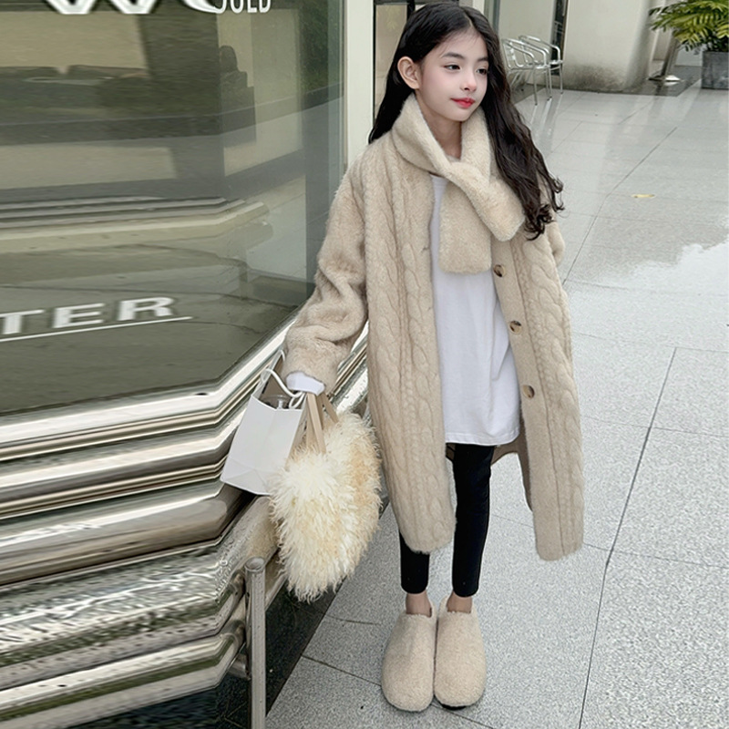 소녀 모피 코트 겨울 2024 새 소녀의 긴 니트 코트 미드 빅 어린이 두꺼운 겨울 울 스웨터