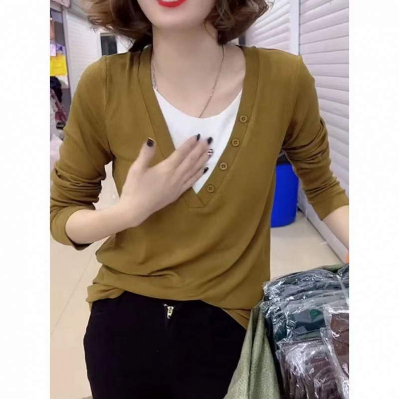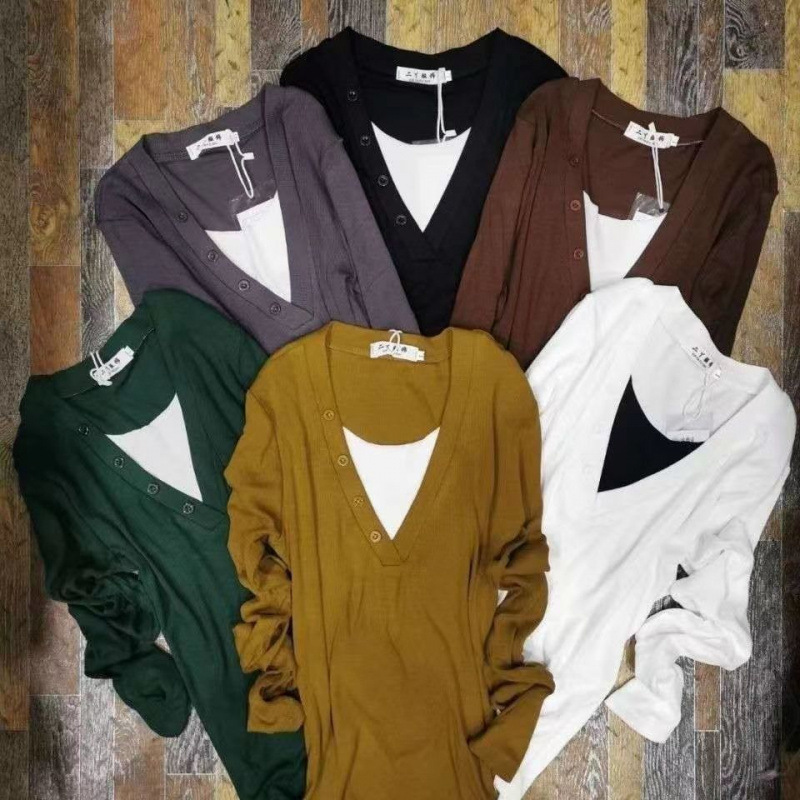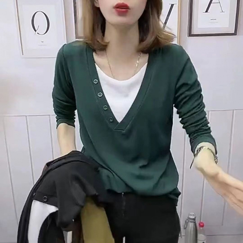 2024 한국 봄과 가을 새로운 가짜 투피스 디자인 센스 V 넥 긴팔 티셔츠 여성용 슬림 핏 슬리밍 내베이스 셔츠스토어 가기