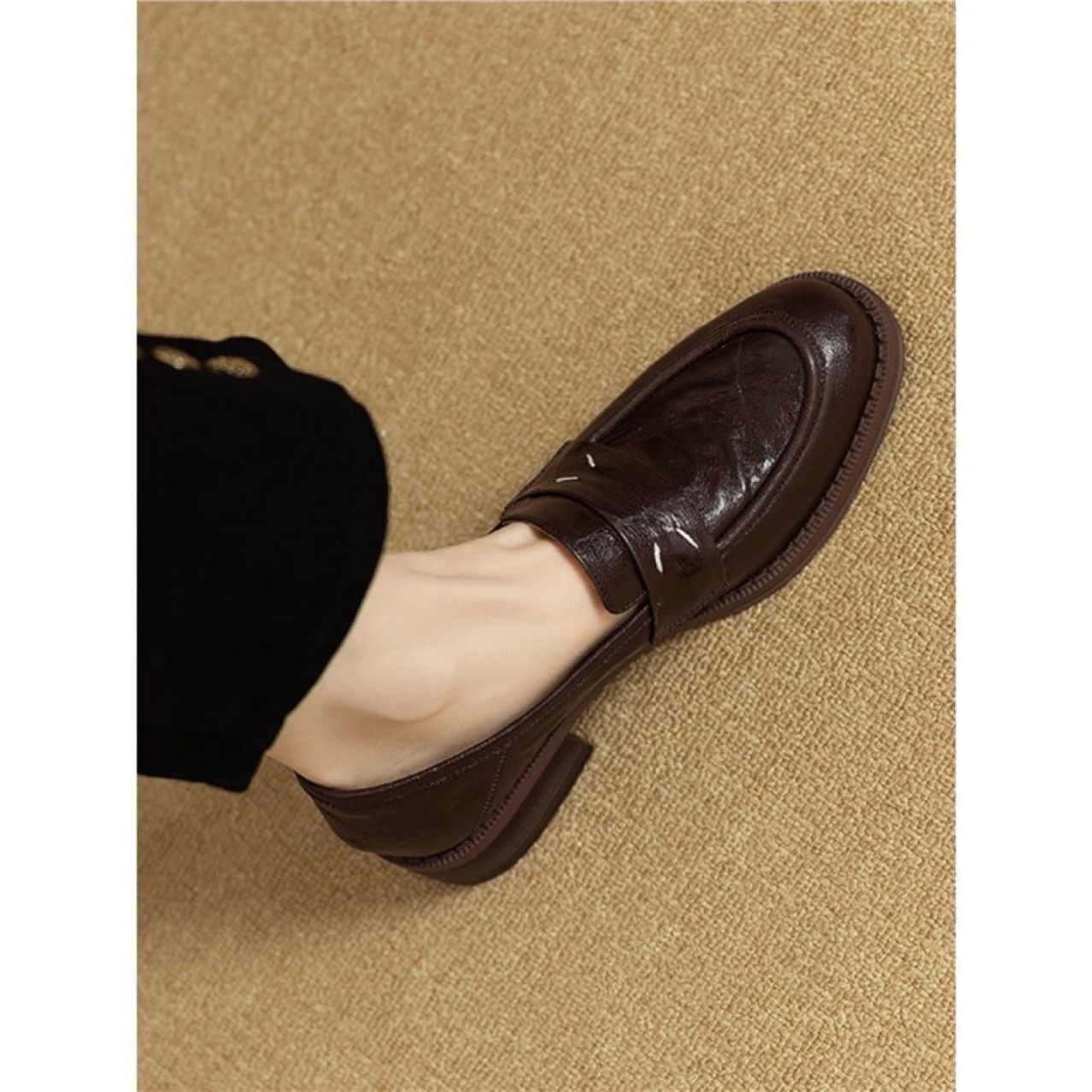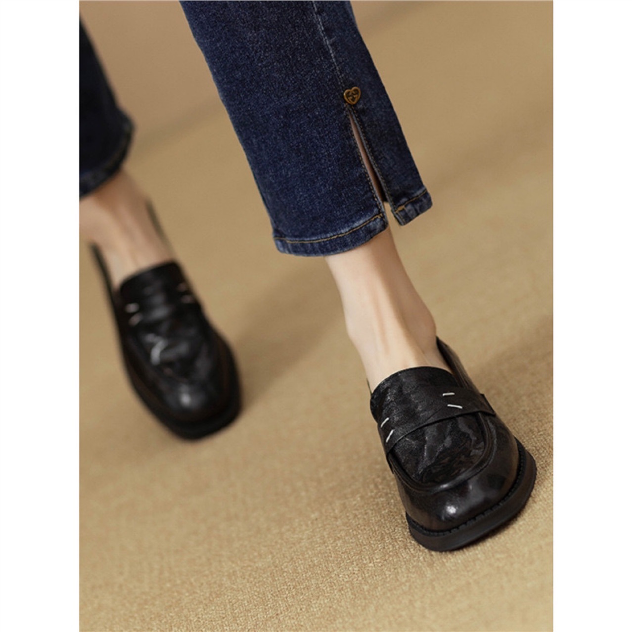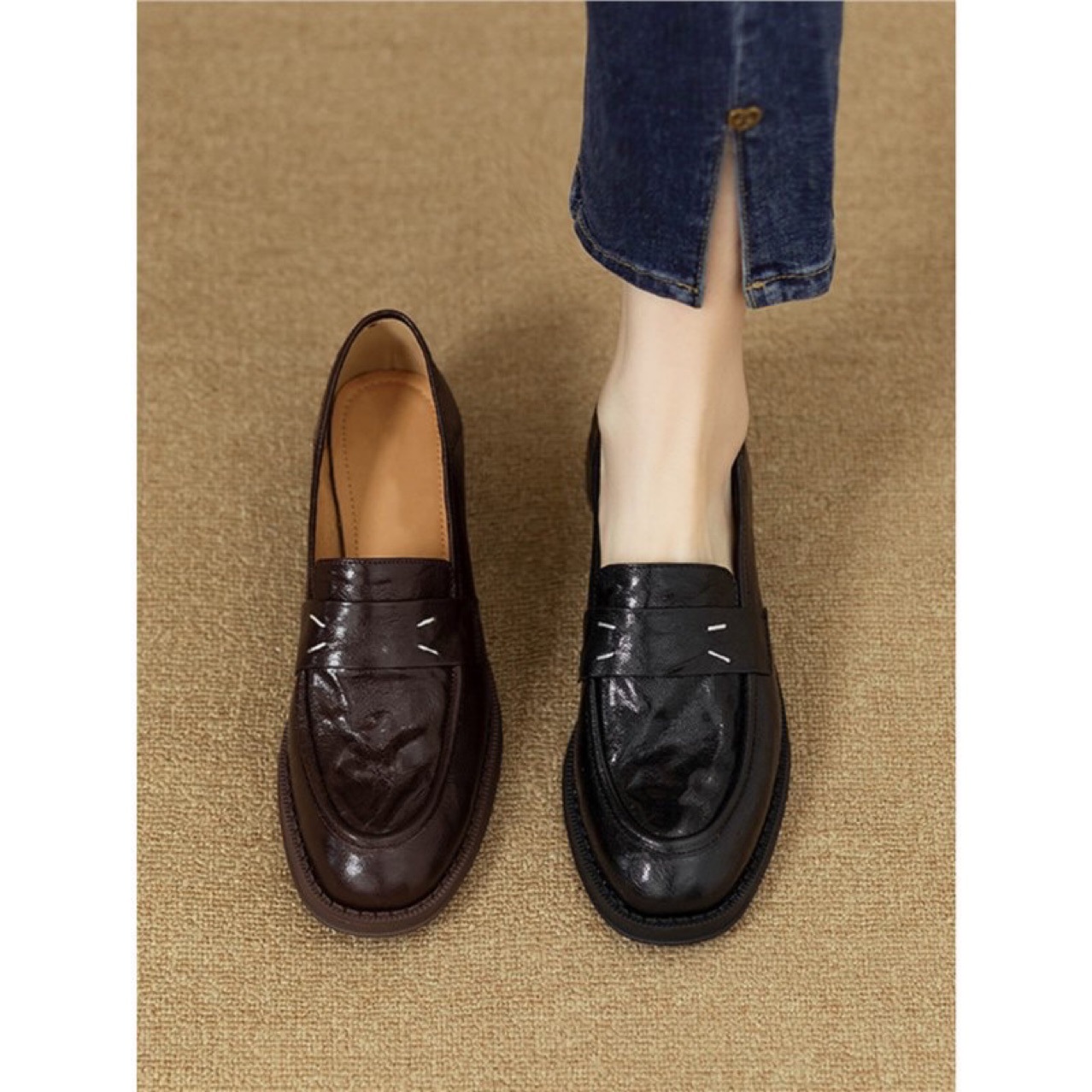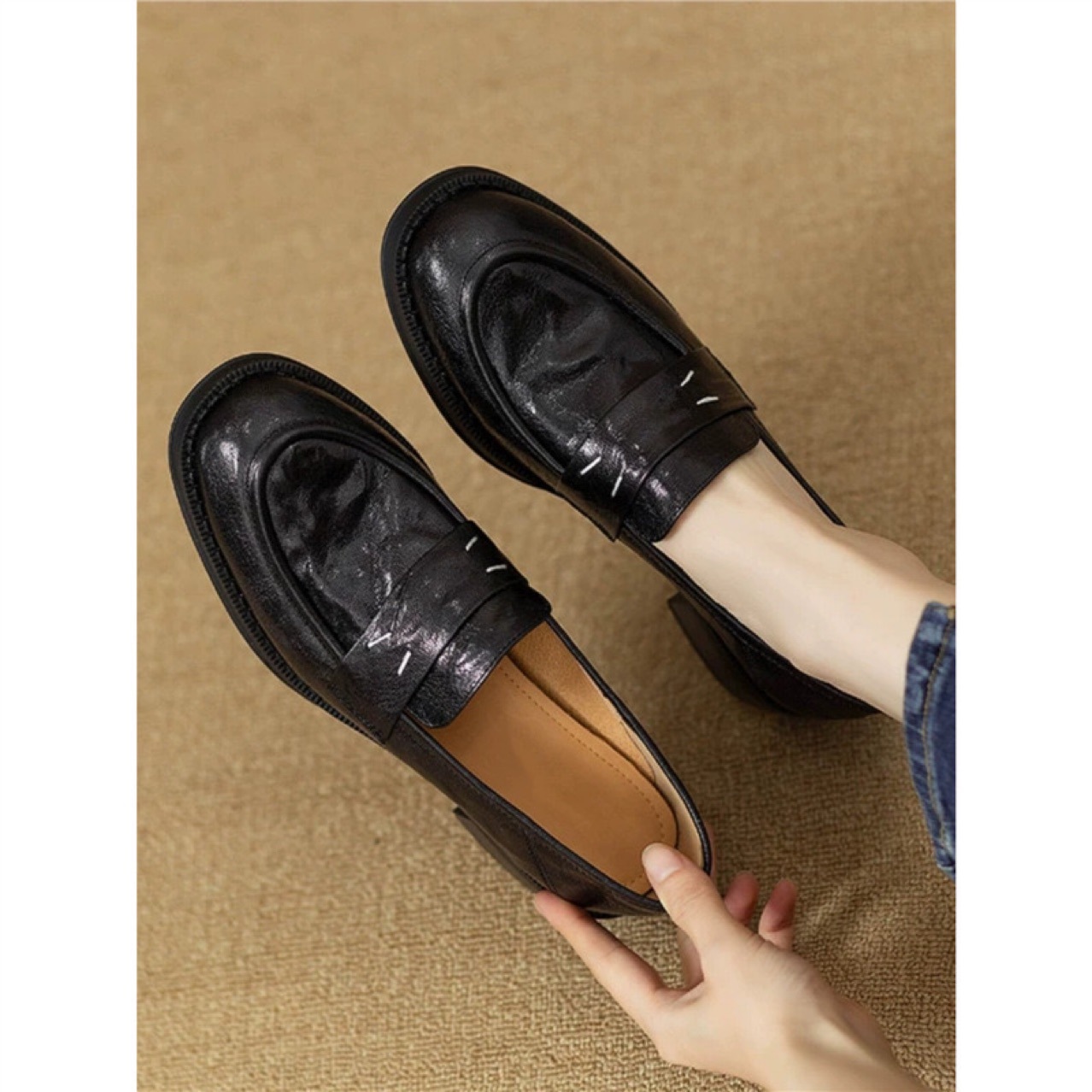 여성을위한 두꺼운 굽 캐주얼 로퍼 2025 봄 새로운 라운드 발가락 복고풍 주름 부드러운 양피 중간 굽 신발 여성을위한스토어 가기