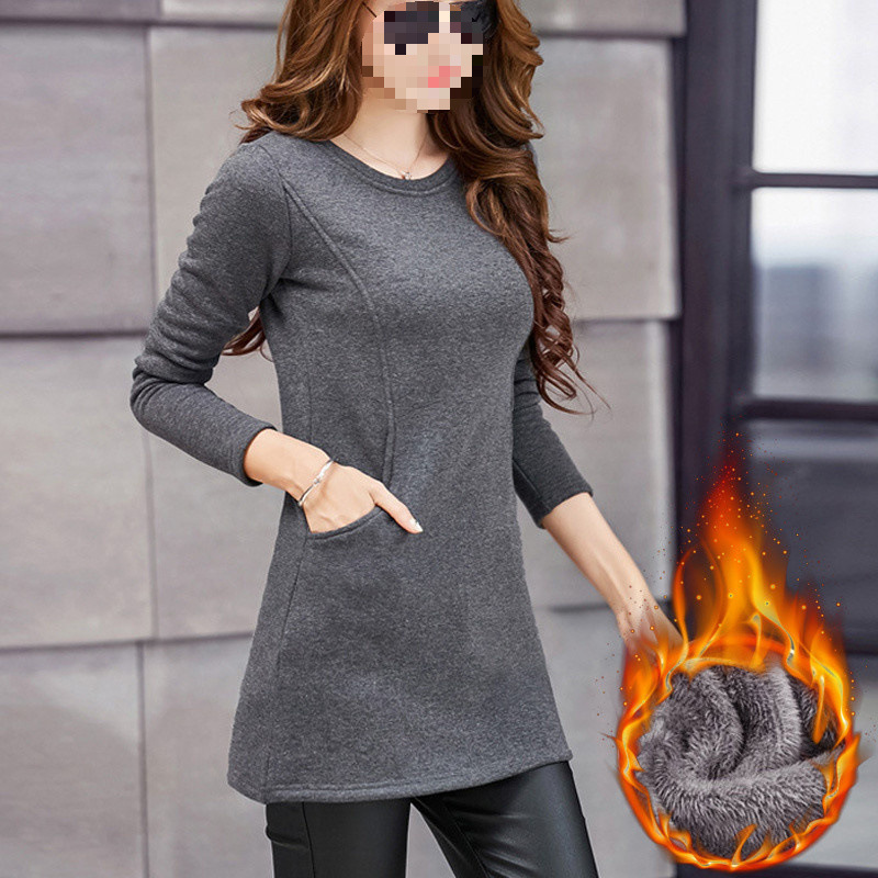 가을과 겨울 코튼 중간 길이의 기모 두꺼운 긴팔 티셔츠 여성용 한국식 슬림핏 따뜻한 힙탑베이스 셔츠스토어 가기