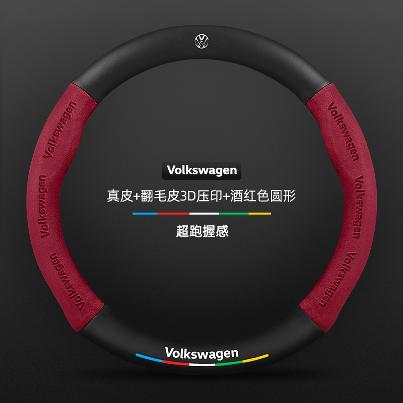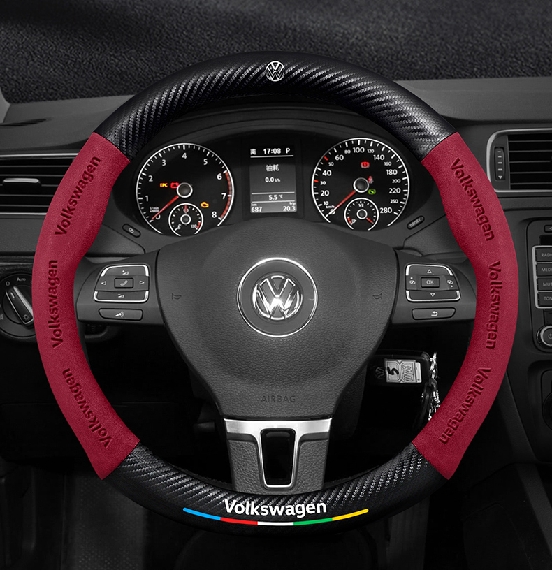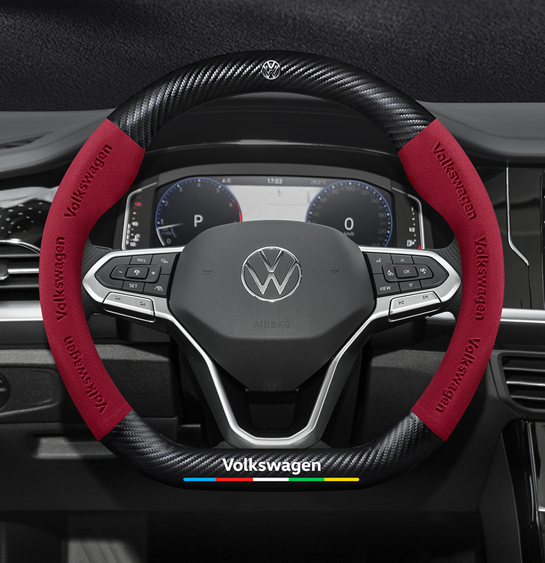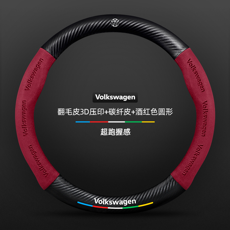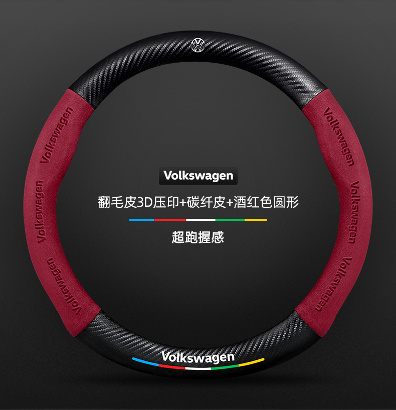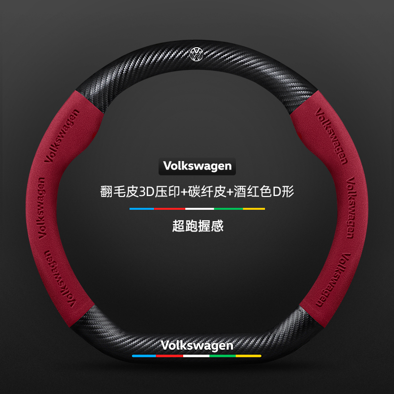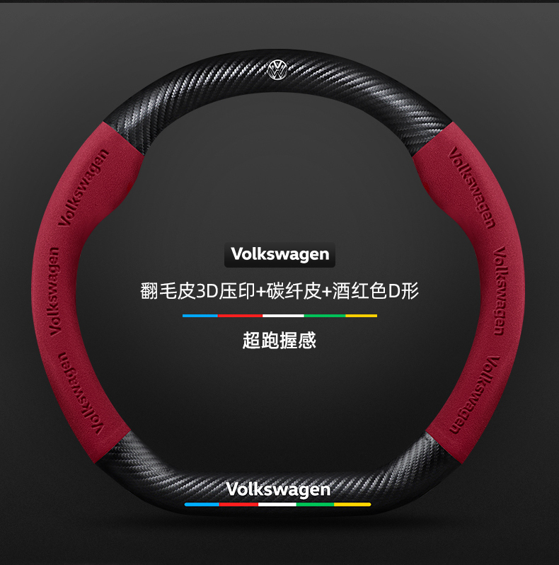 • 스웨이드 3D 엠보싱 탄소 섬유 가죽 버건디 D자형 폭스바겐 로고