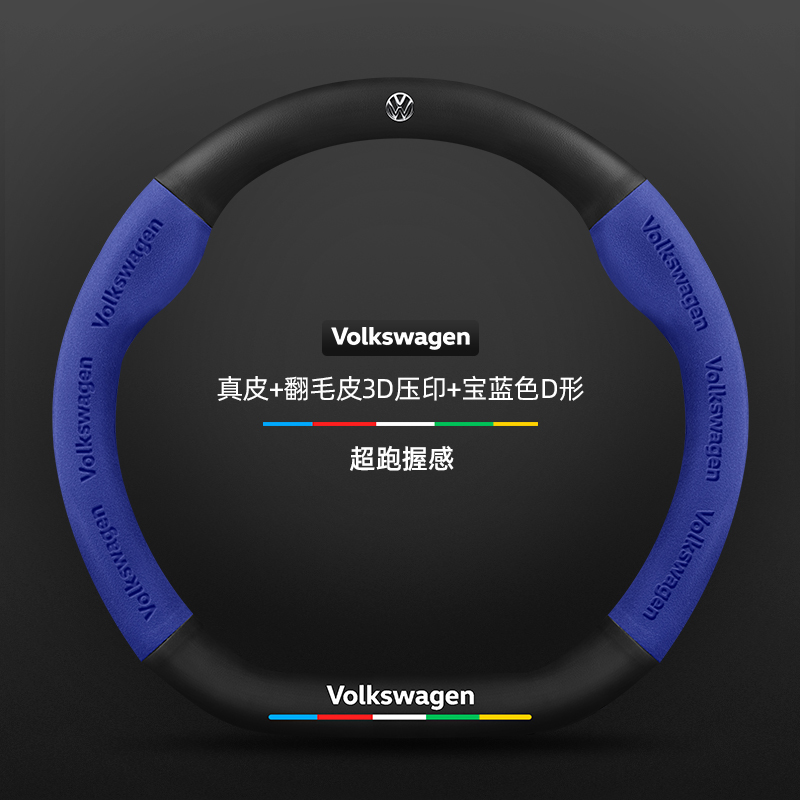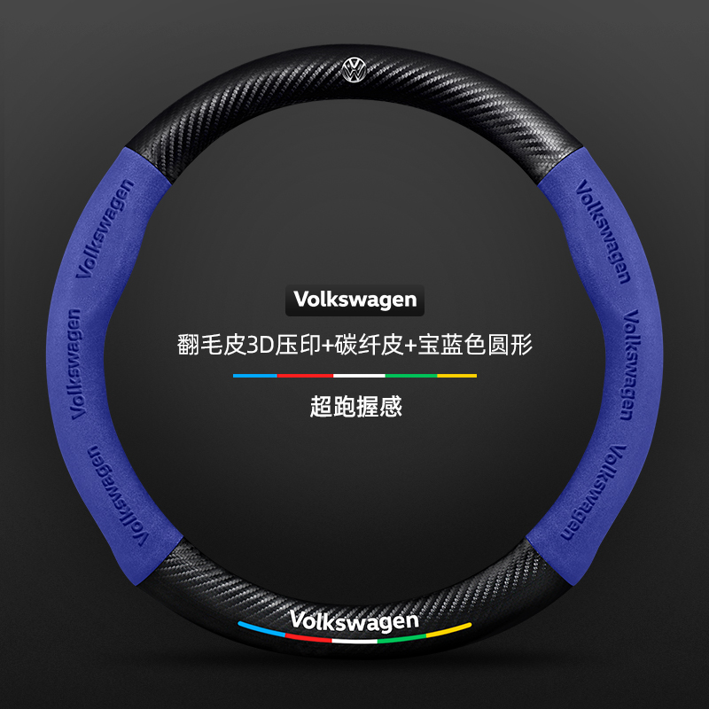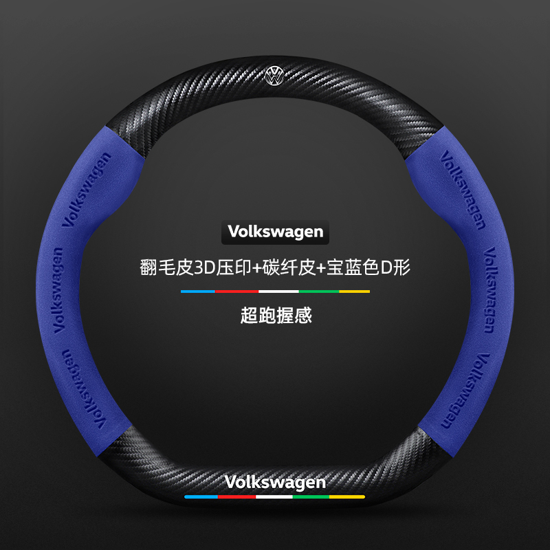 • 스웨이드 3D 엠보싱 탄소 섬유 가죽 로얄 블루 D자형 폭스바겐 로고